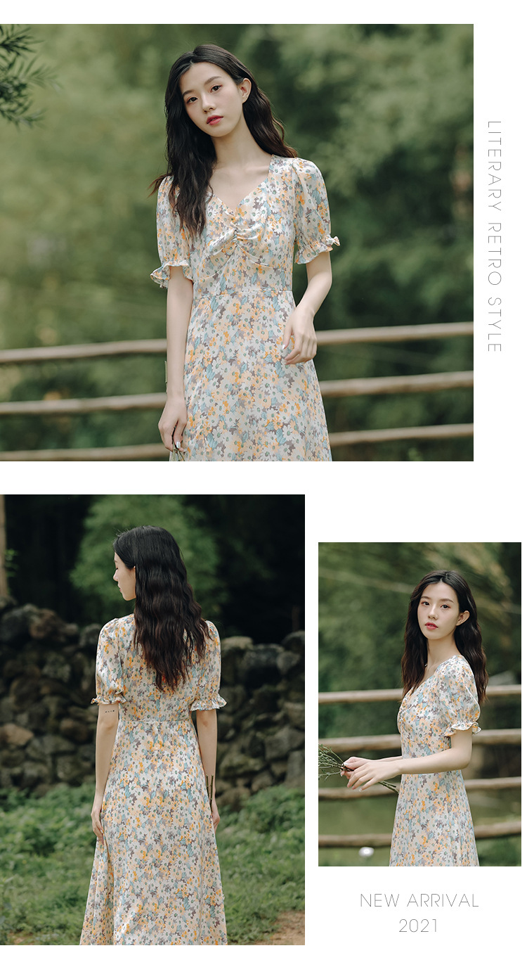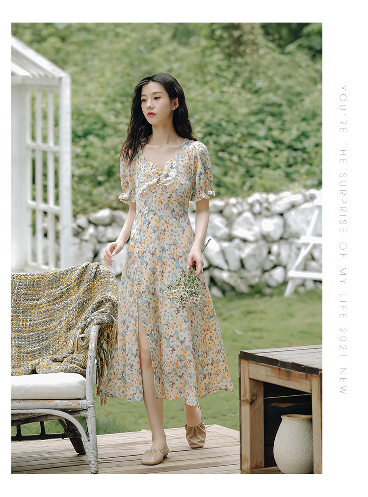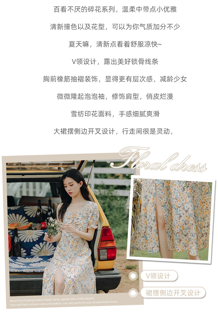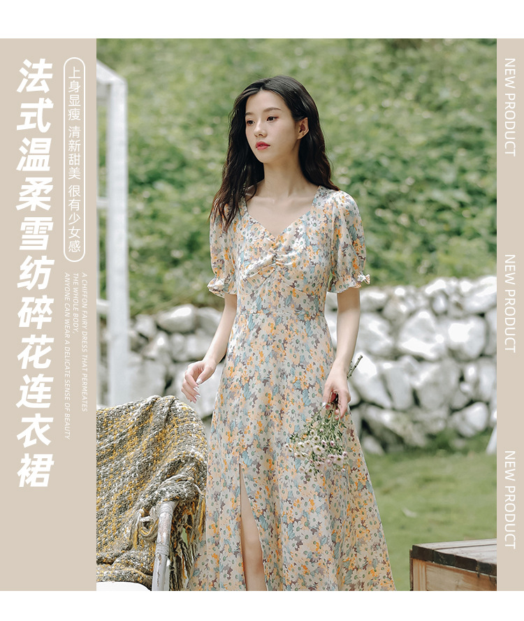 【仙气十足!法式温柔碎花连衣裙】上身显瘦,清新甜美,少女感满满!泡泡袖雪纺长裙,韩系新款裙子吊带