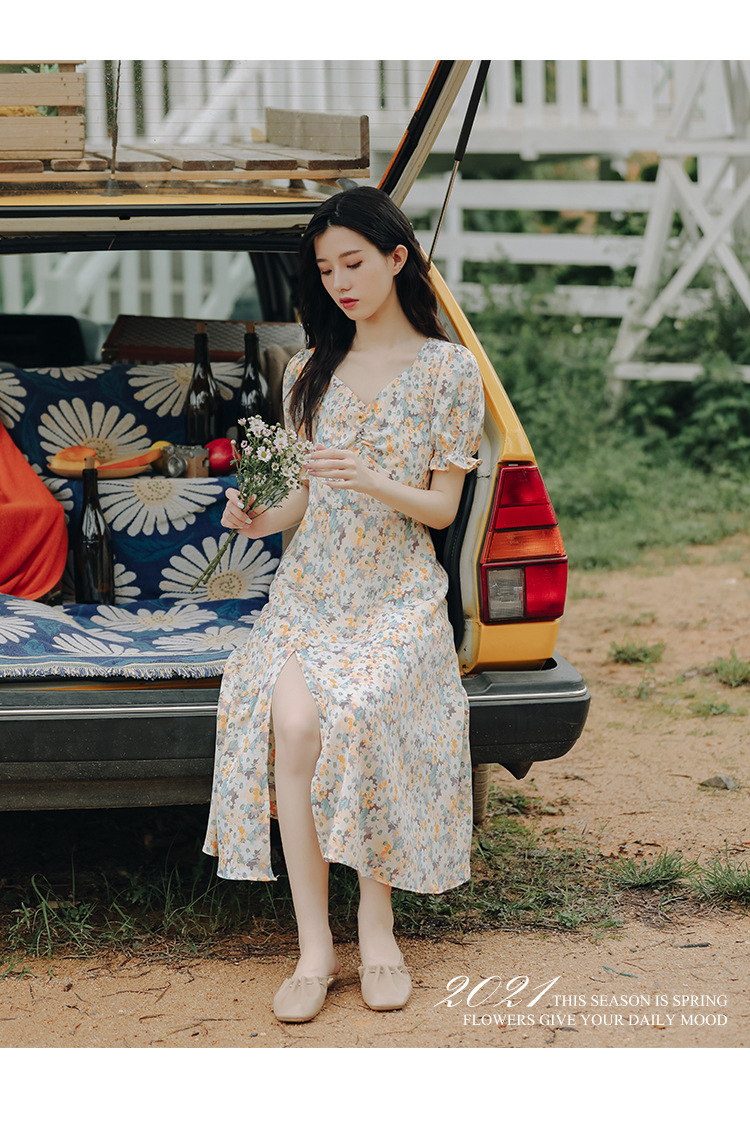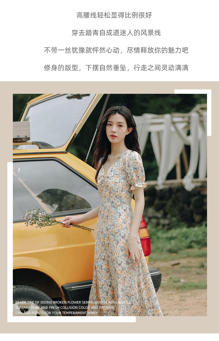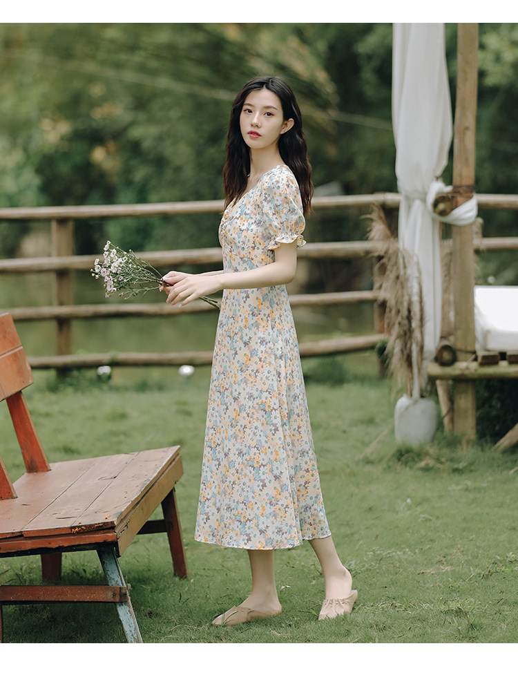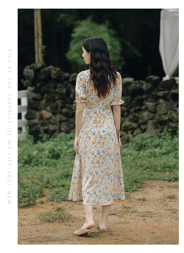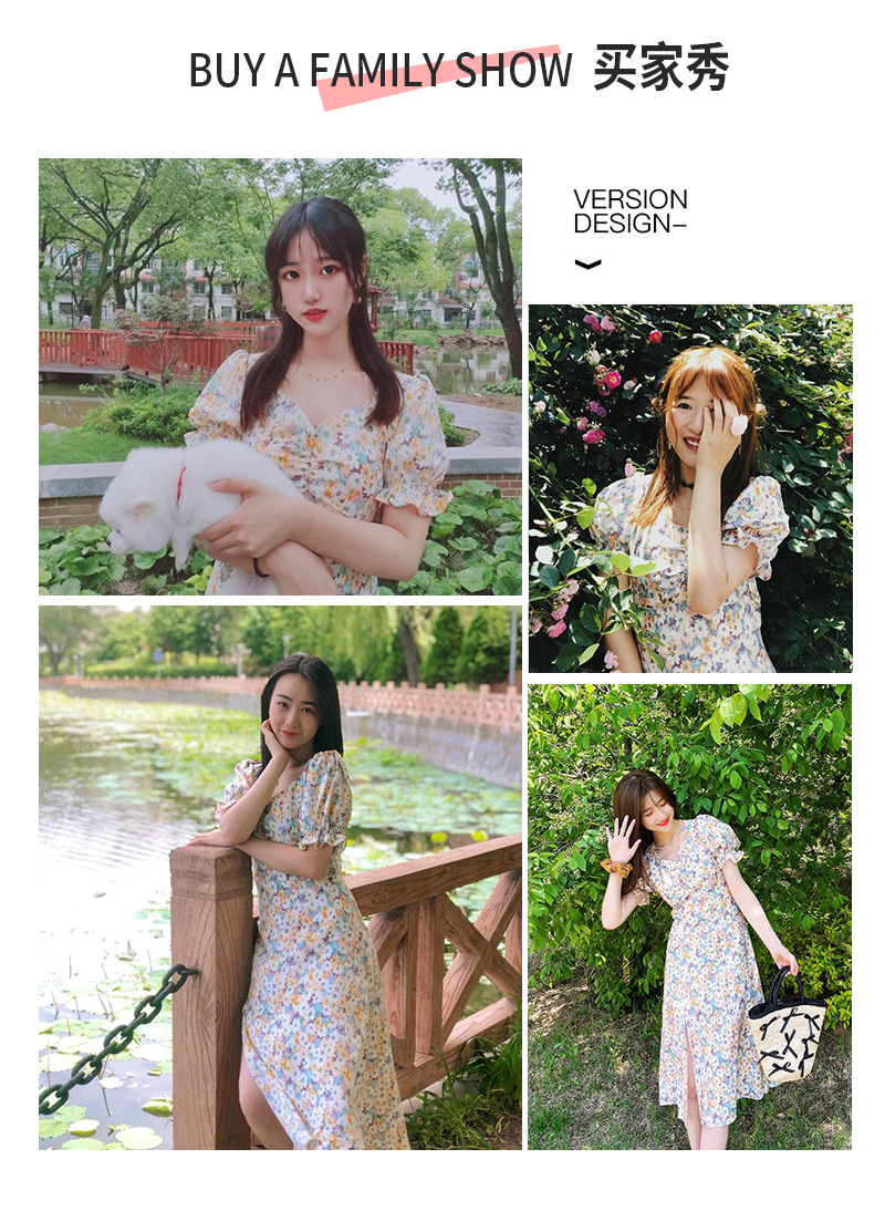 【仙气十足!法式温柔碎花连衣裙】上身显瘦,清新甜美,少女感满满!泡泡袖雪纺长裙,韩系新款裙子吊带