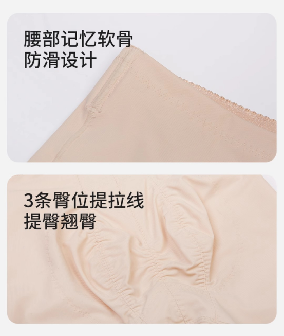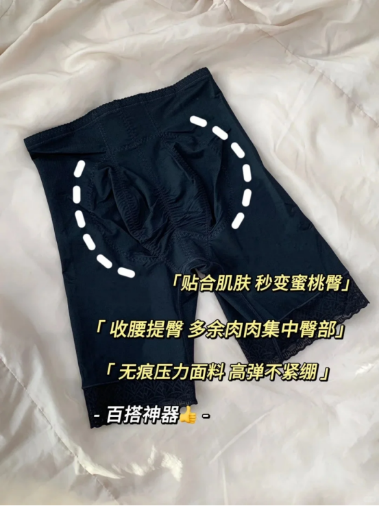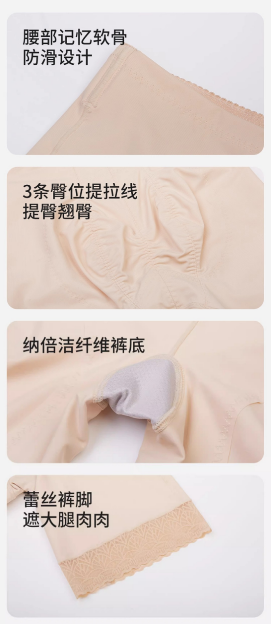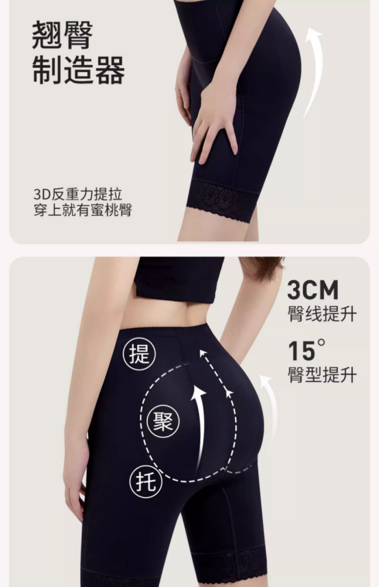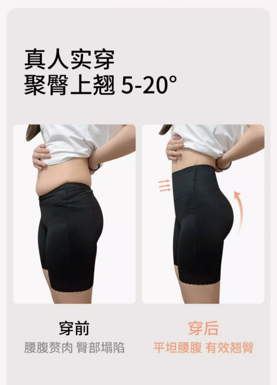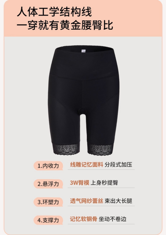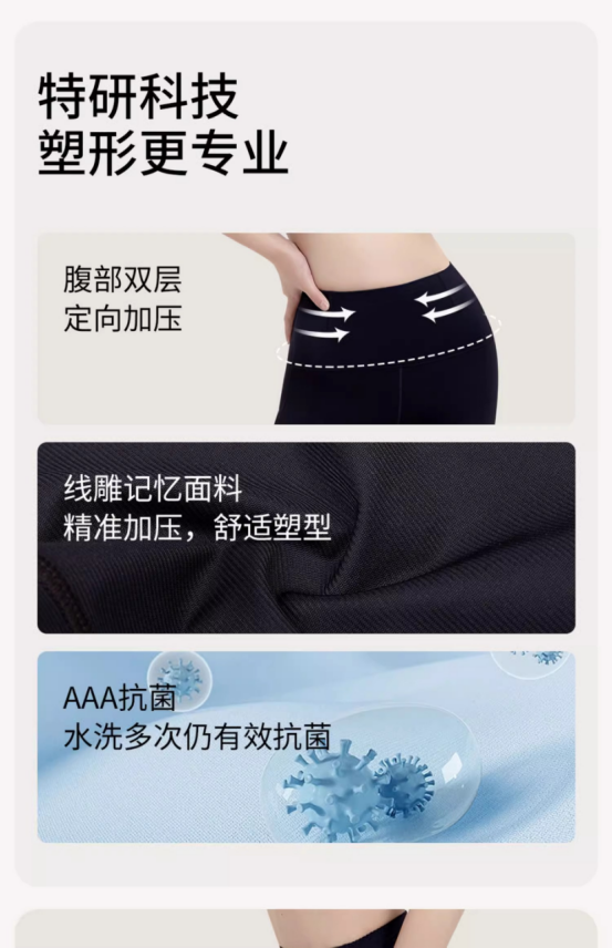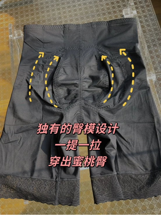①3D立体剪裁,对胯部大腿内侧重点施压,强效收胯,紧致塑形 ②全车缝工艺,臀部做了3W臀模设计,即三条提拉线是根据人体工学原理, 做了不同褶皱点的定位施压,更考验车工师傅的手艺,上身一提一拉, 哪怕是超A的臀部也能自然圆润饱满的翘臀。 可以穿前拍下,穿以后拍下,明显臀部上翘45°,提高臀位,显腿长 ③腰部加宽防滑设计,上身收紧小腹脂肪同时防滑防卷边! ④纳倍洁纤维底裆,可贴身穿,3A级抗菌抑菌(有抗菌报告), 底裆是做的U型设计(市面上大多数底裆是做的方形的,这样贴身穿的时候容易三角区不适), u型可以更好贴合女性私处部位,防卡裆掉裆 ⑤腿部创拼接扇意风情之花(专利版权), 很好的根据腿围大小吸附大腿的肉,塑腿防卷边上窜