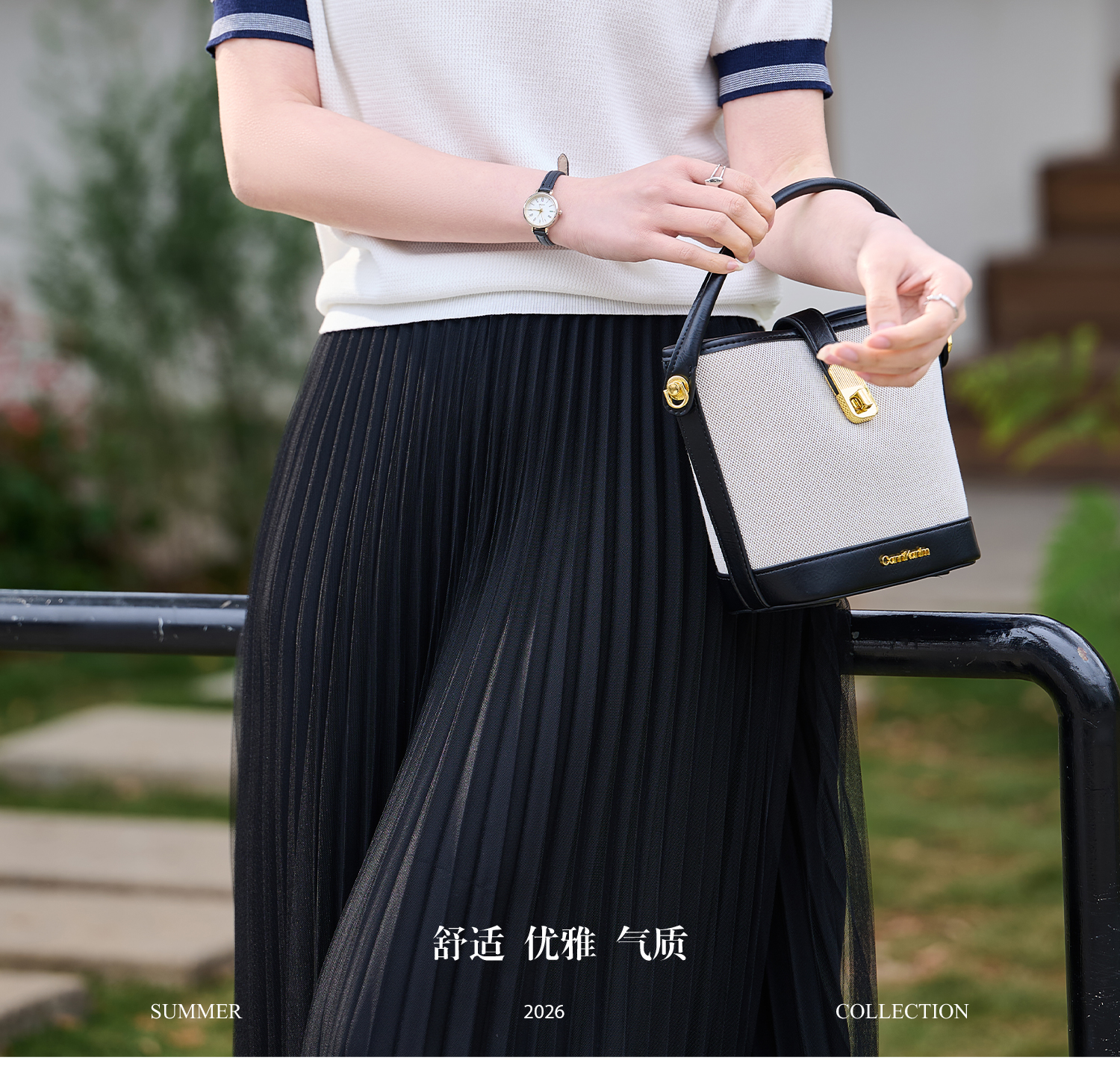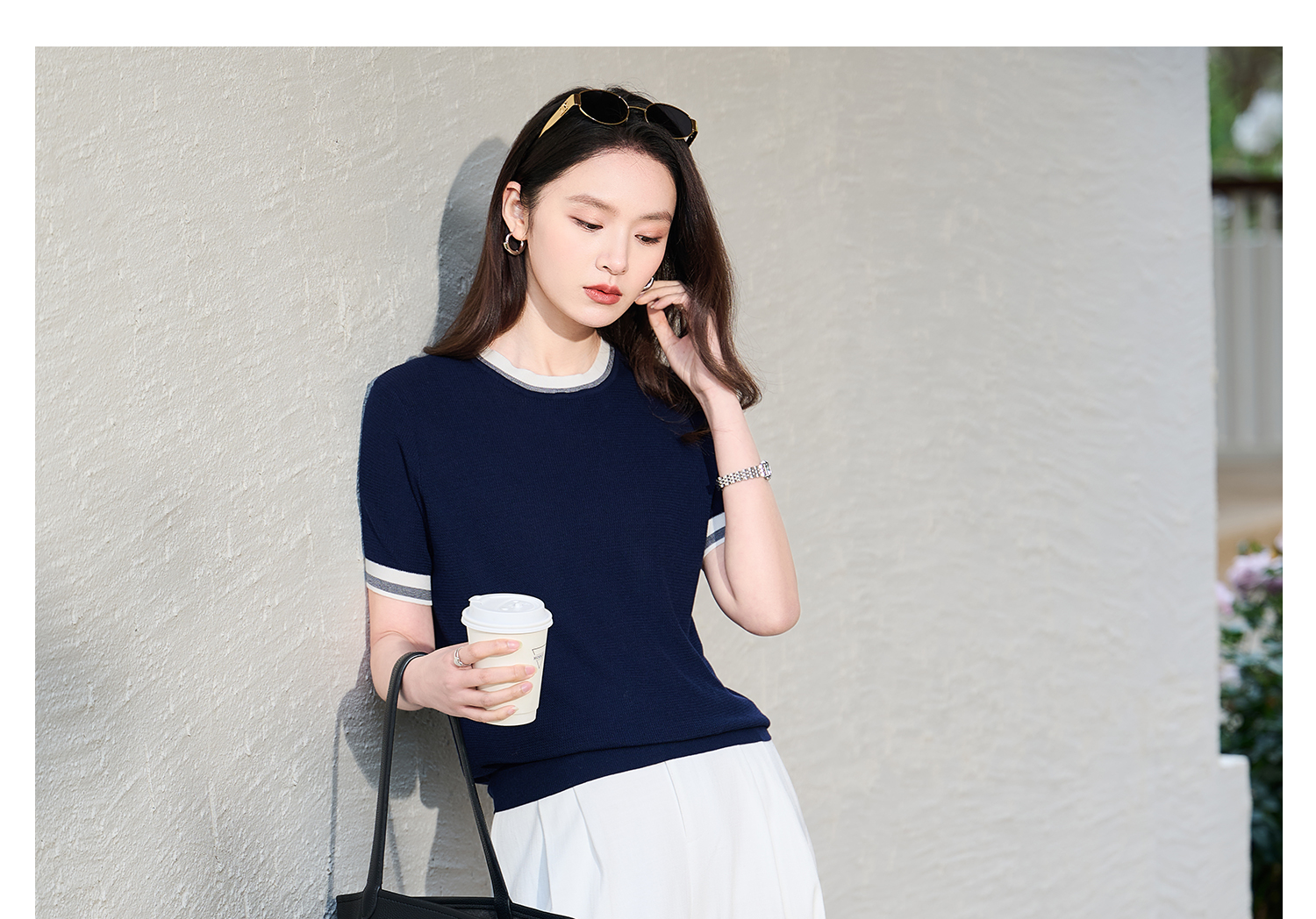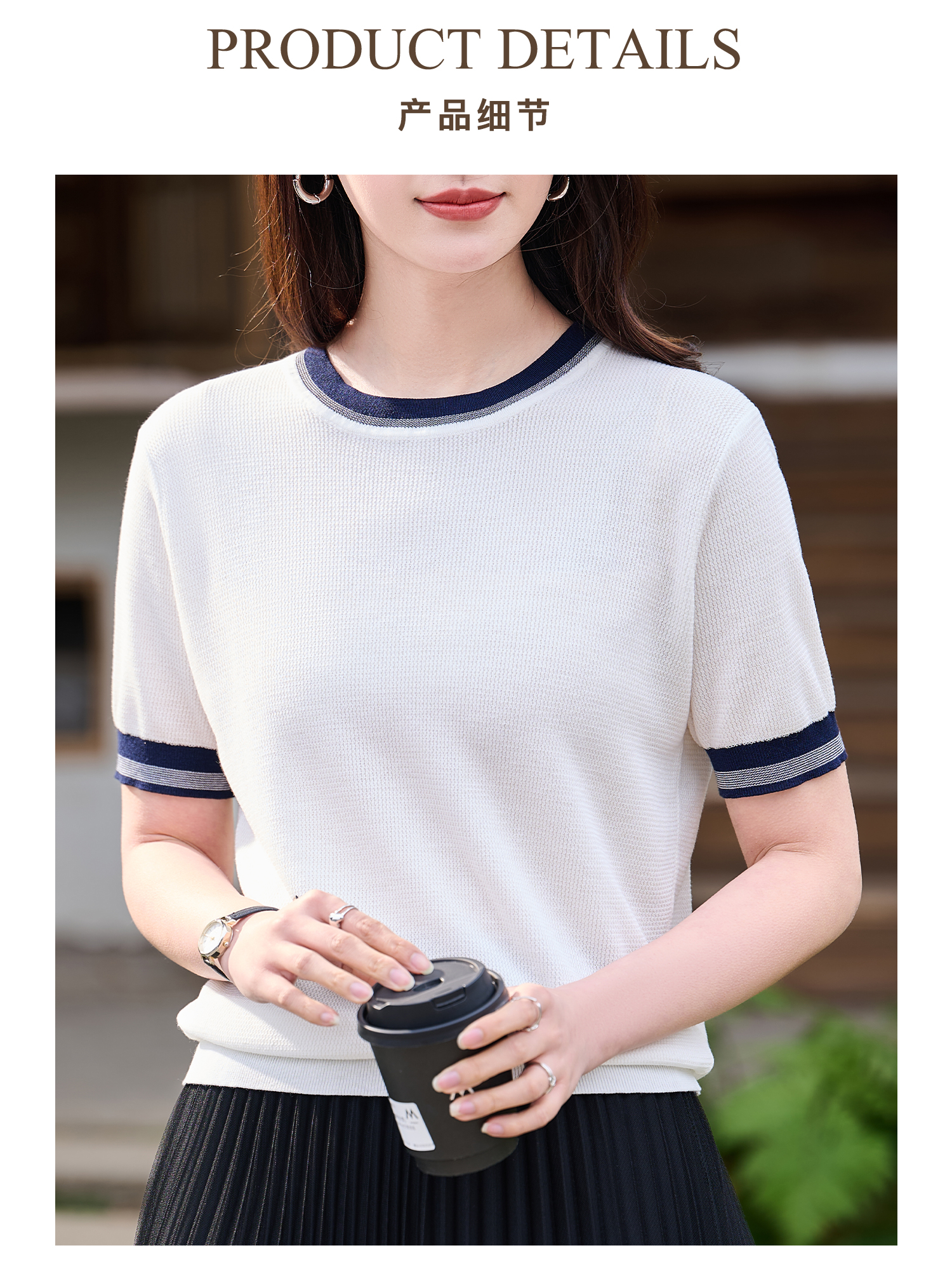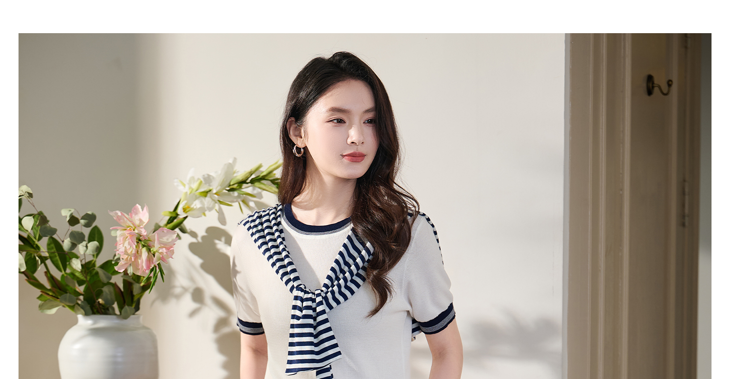 桑蚕丝+天丝+棉 时髦撞色边 立体肌理 米思阳2026夏季新款静奢老钱针织衫圆领衫T恤上衣女1037