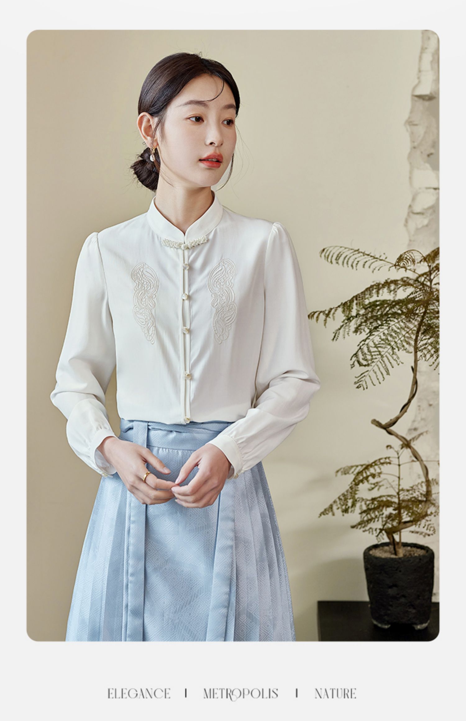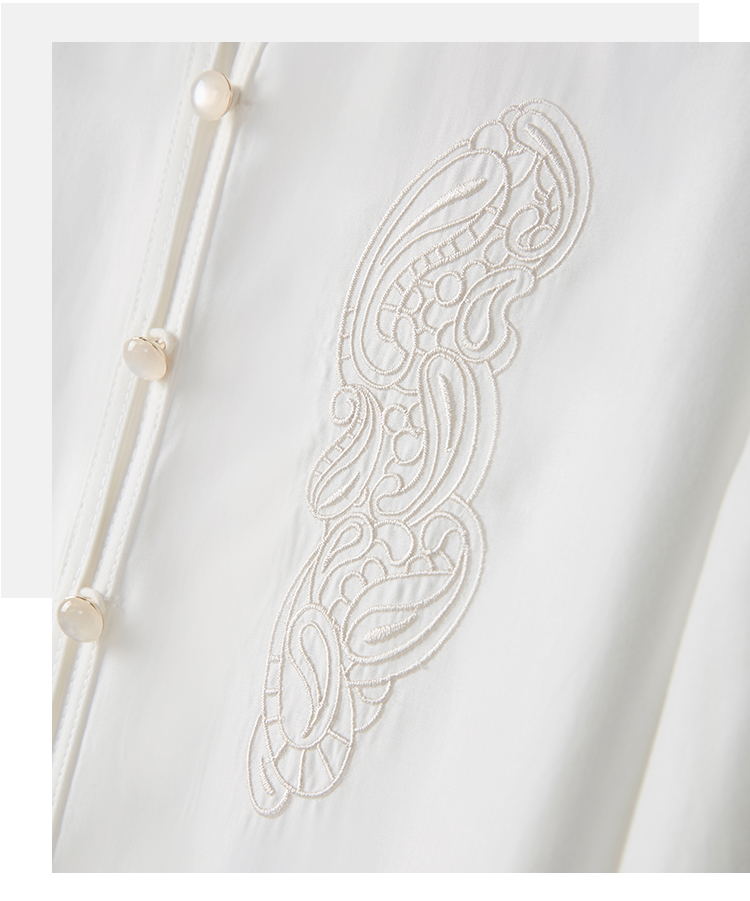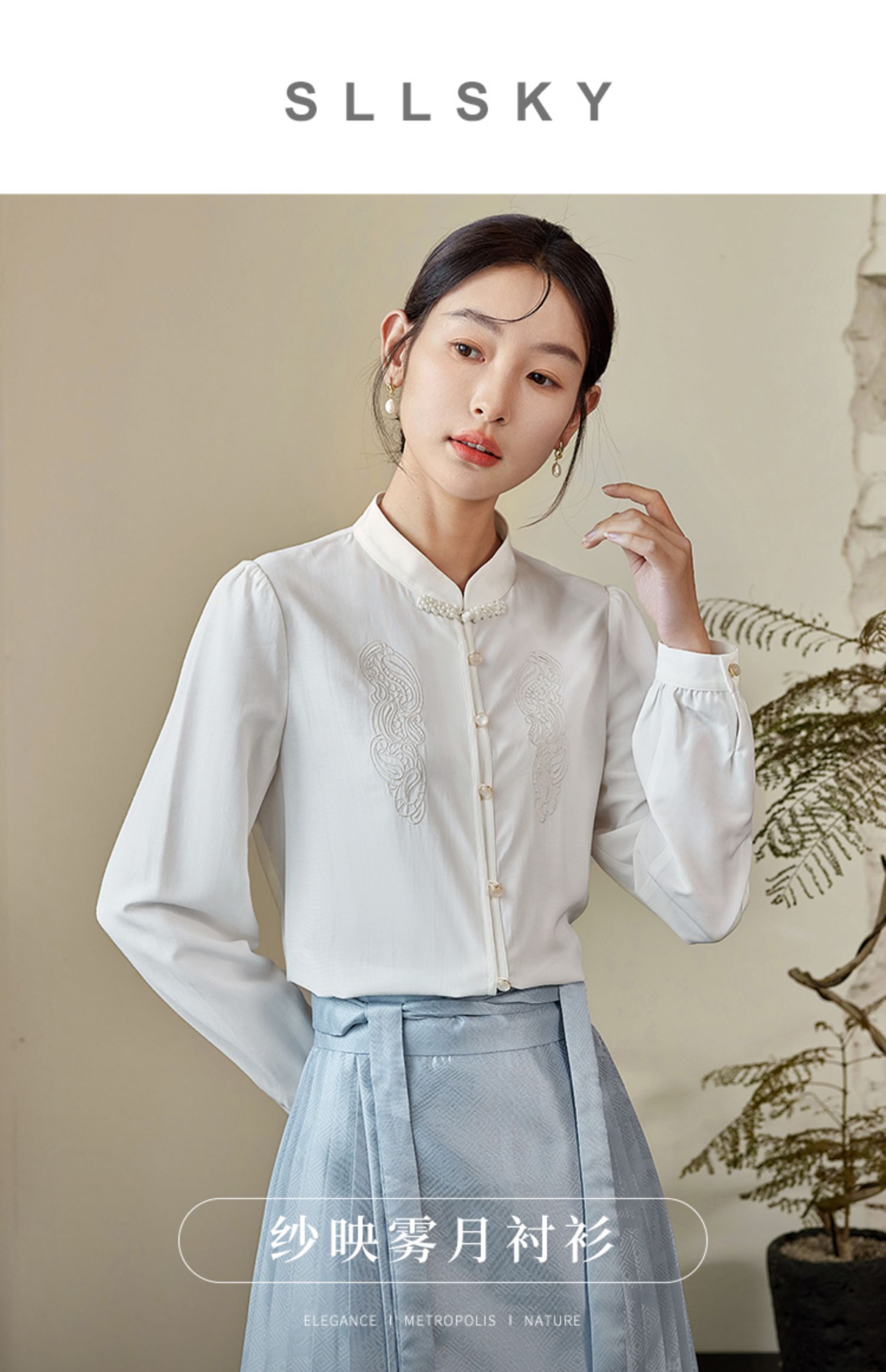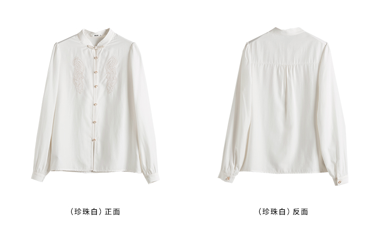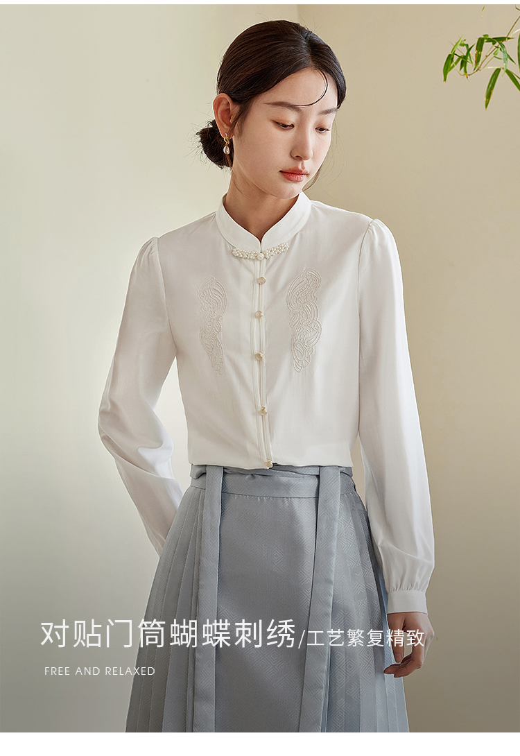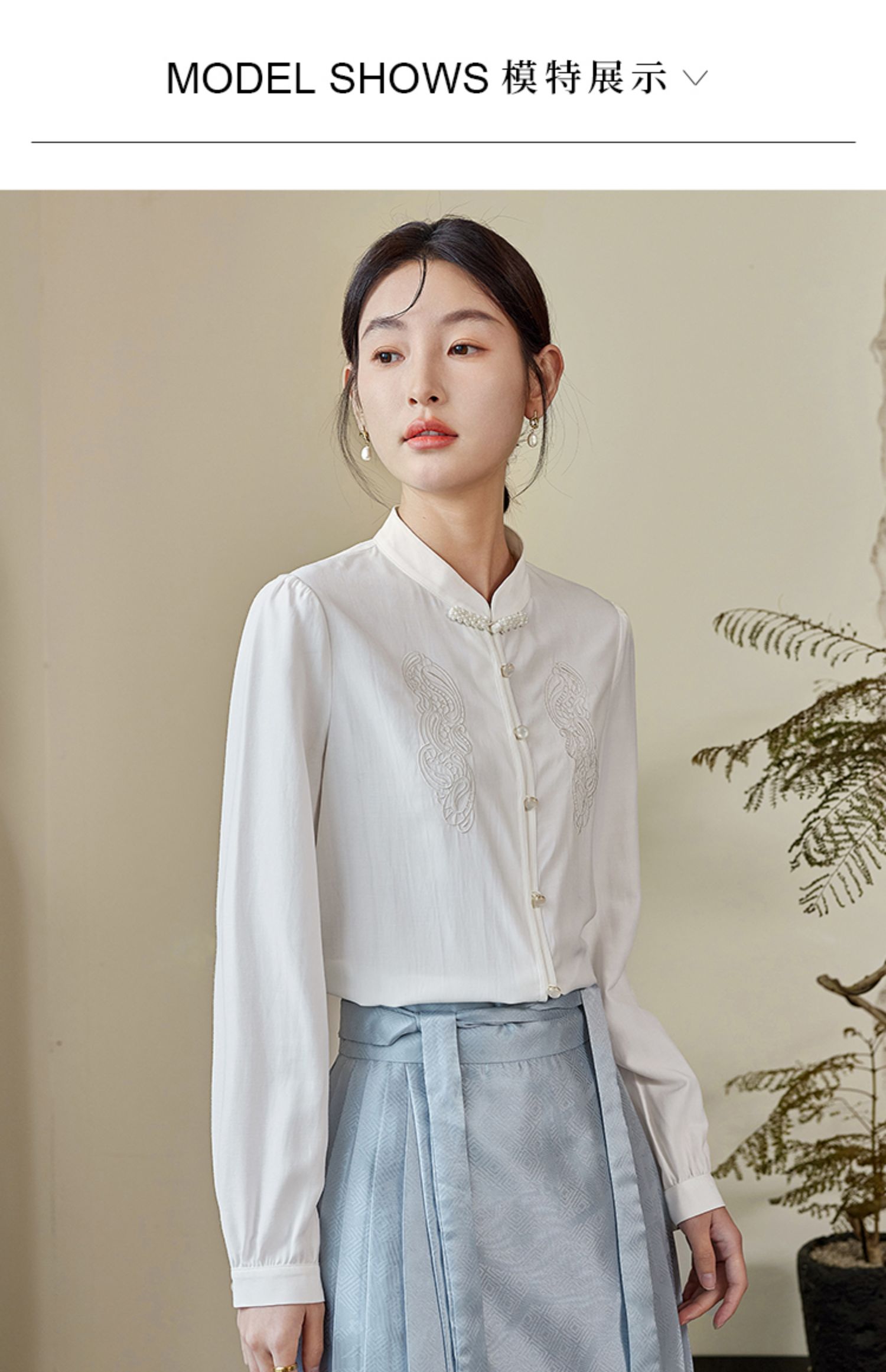 【年终特卖】熙世界国风禅意刺绣白色衬衫女2025秋款仙气新中式立领长袖衬衣
