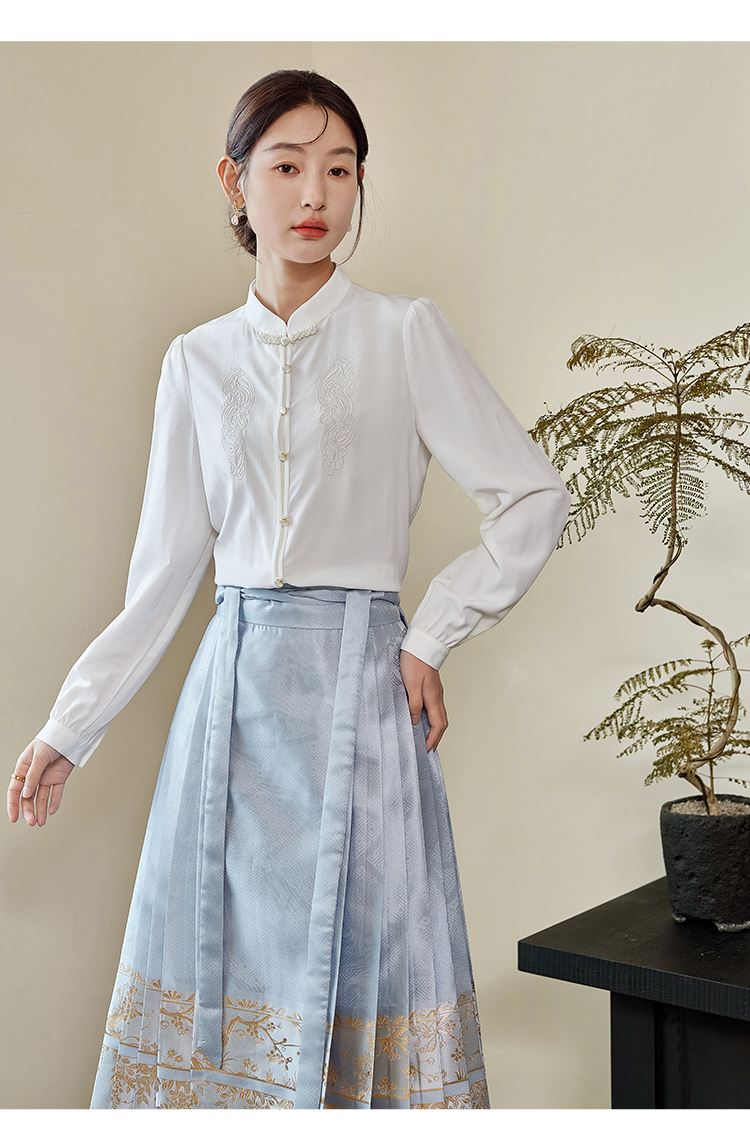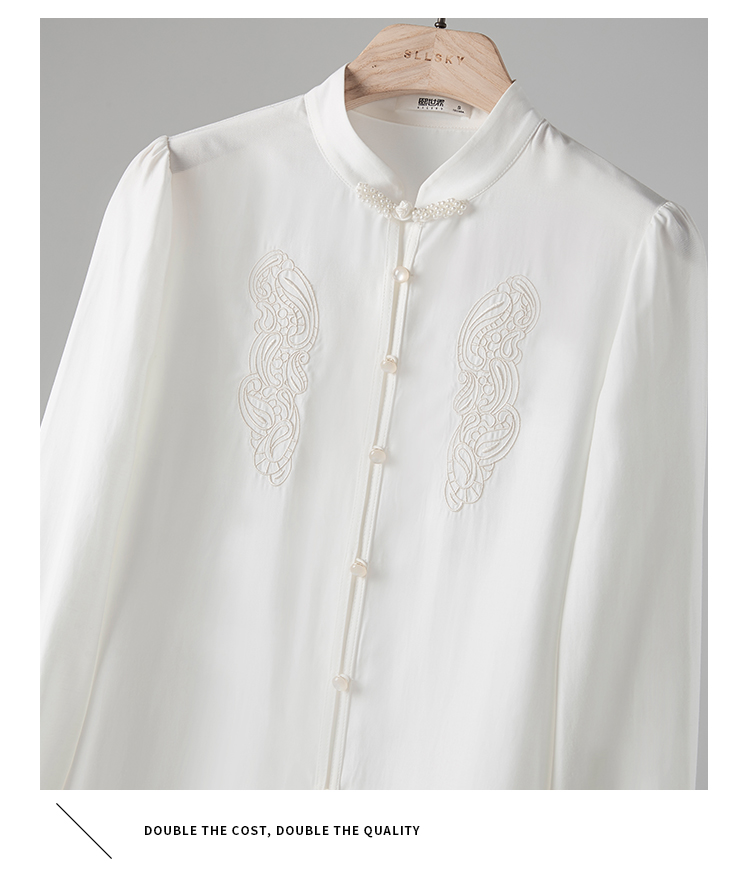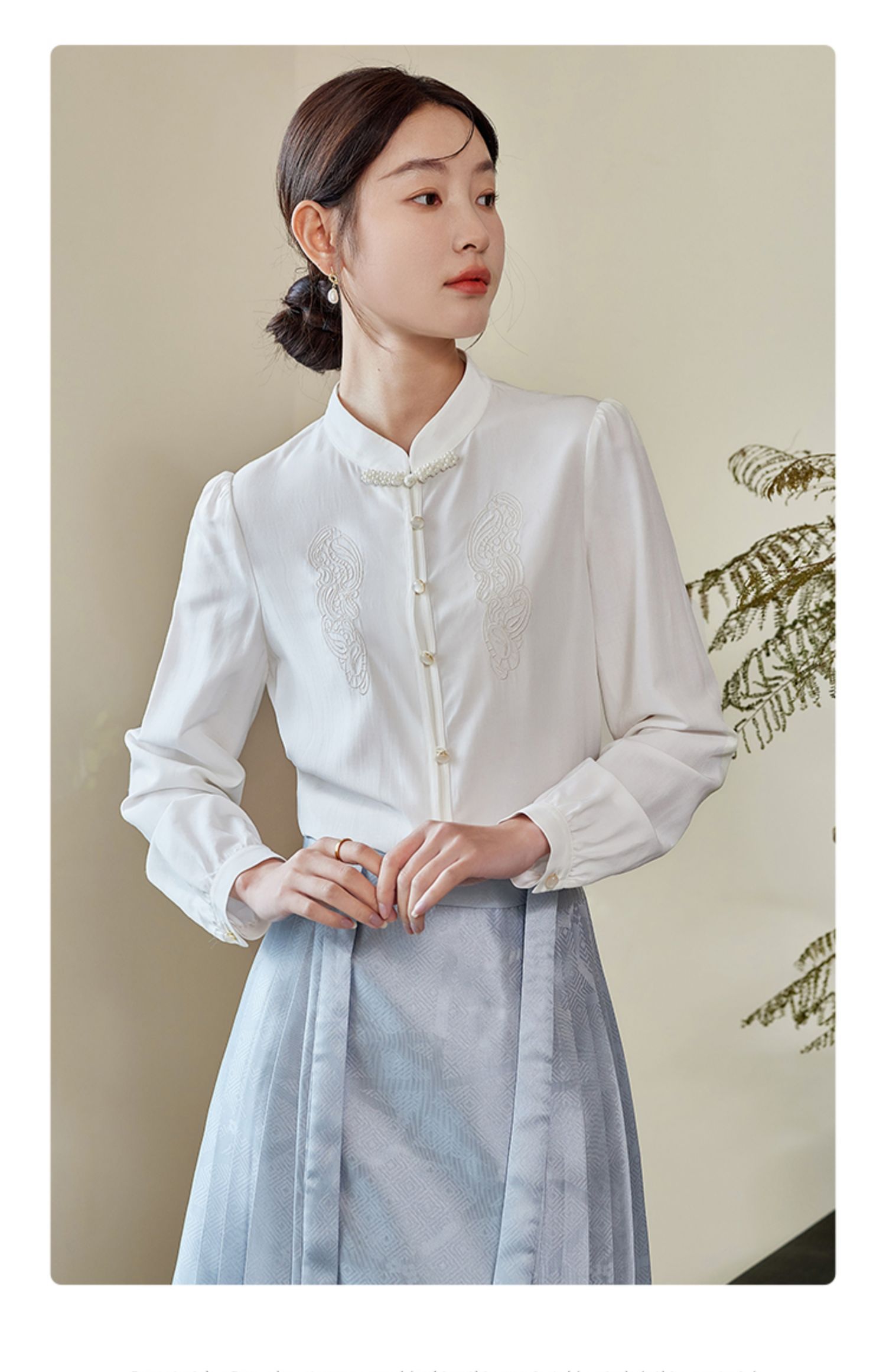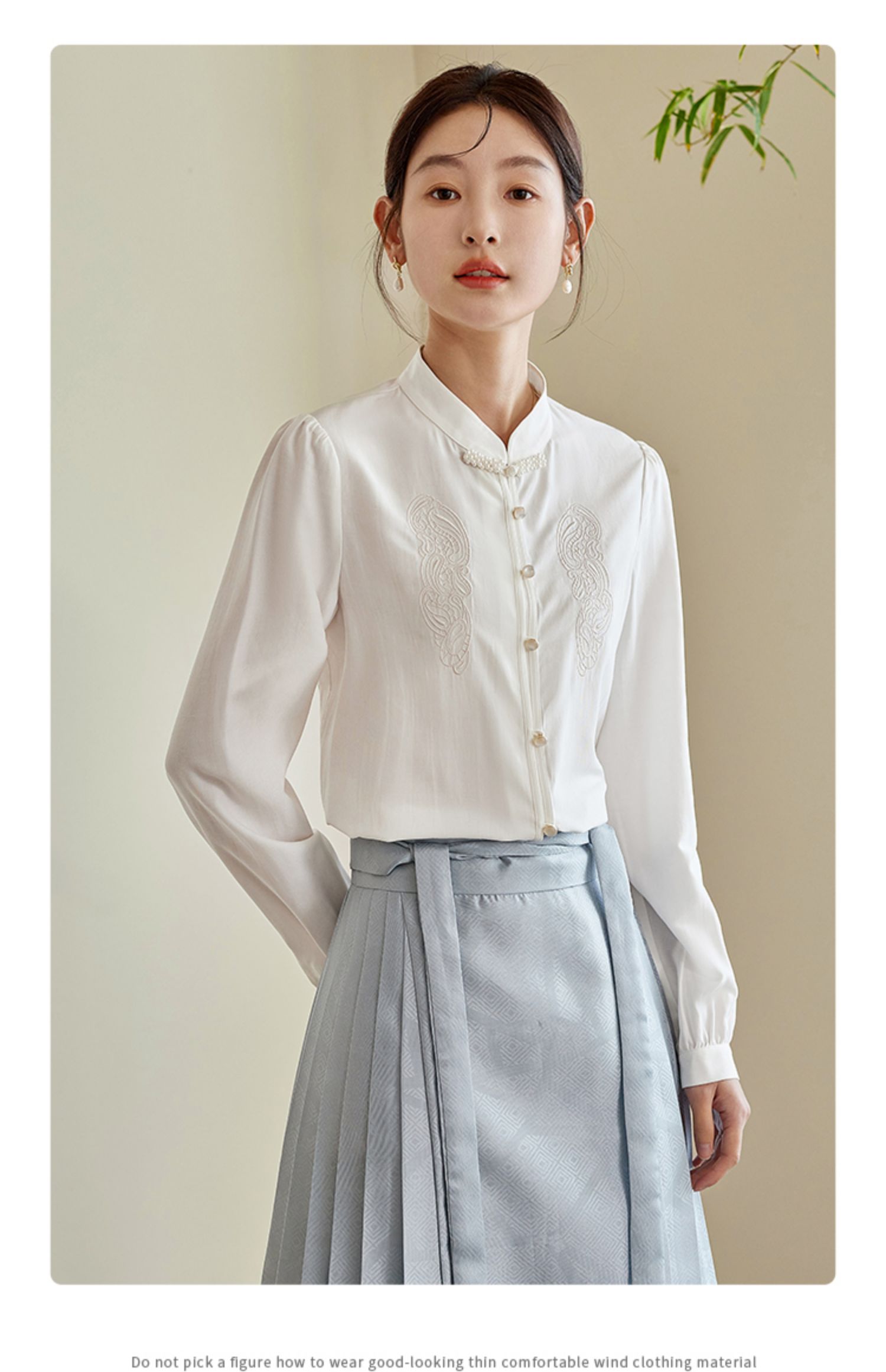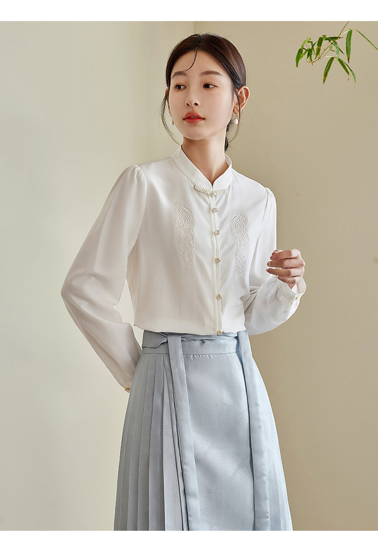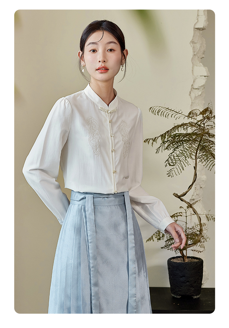 【年终特卖】熙世界国风禅意刺绣白色衬衫女2025秋款仙气新中式立领长袖衬衣