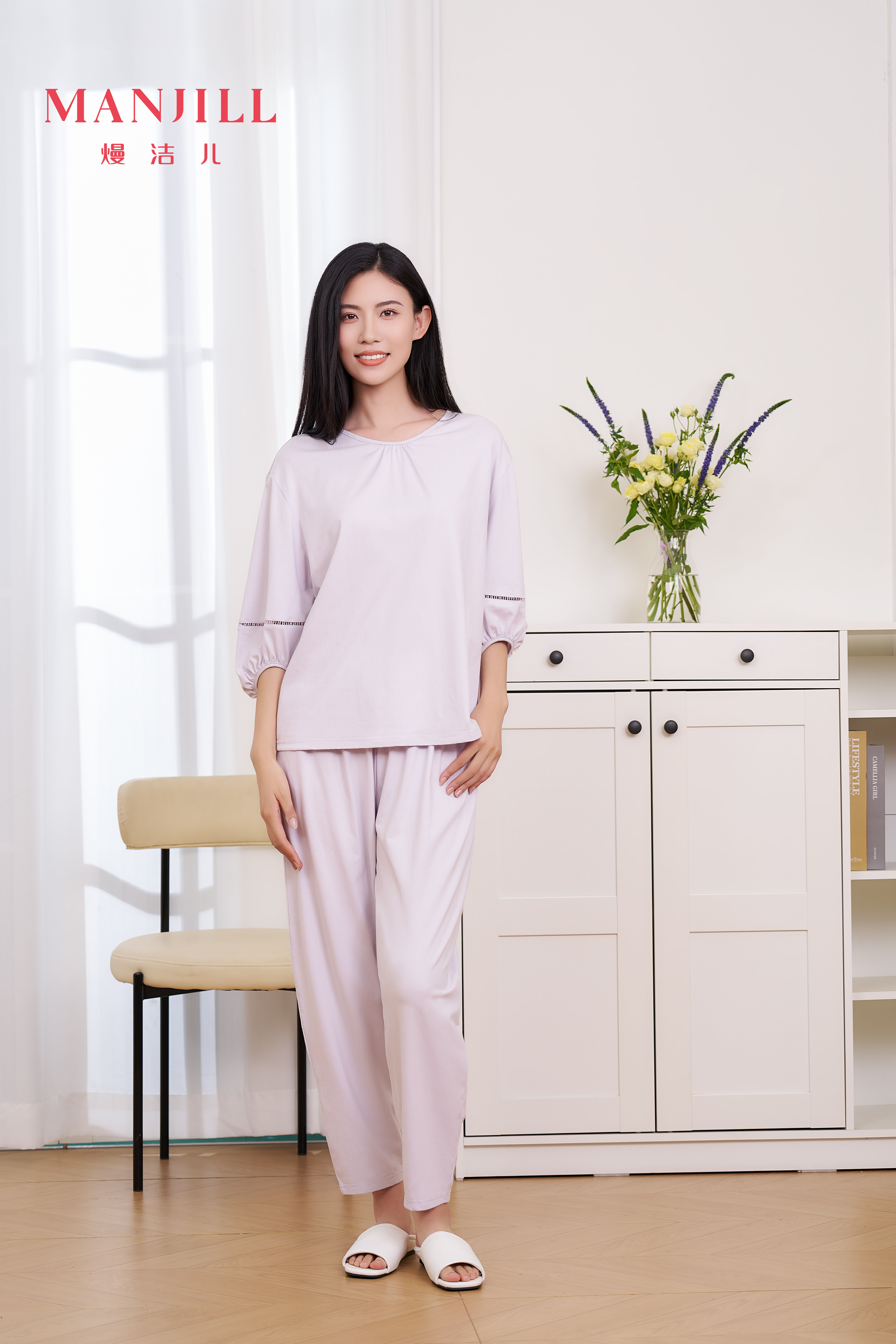【商场同款】熳洁儿 简约纯色95棉套装女士家居服七分袖长裤灯笼袖25203217