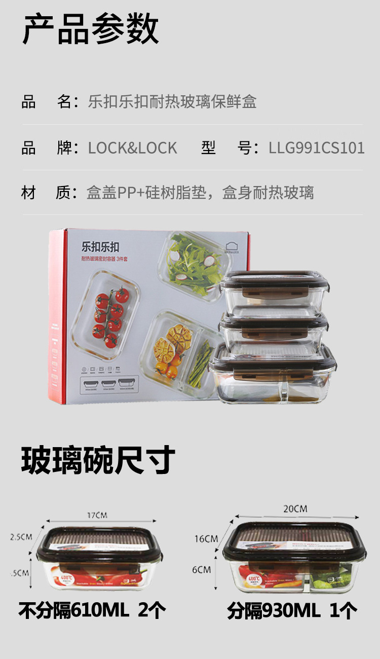 乐扣乐扣 耐热玻璃保鲜盒套装3件套 LLG991CS101