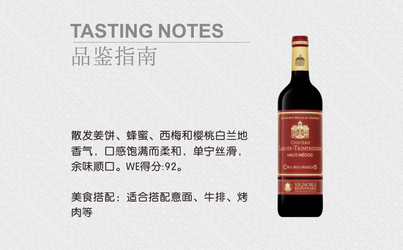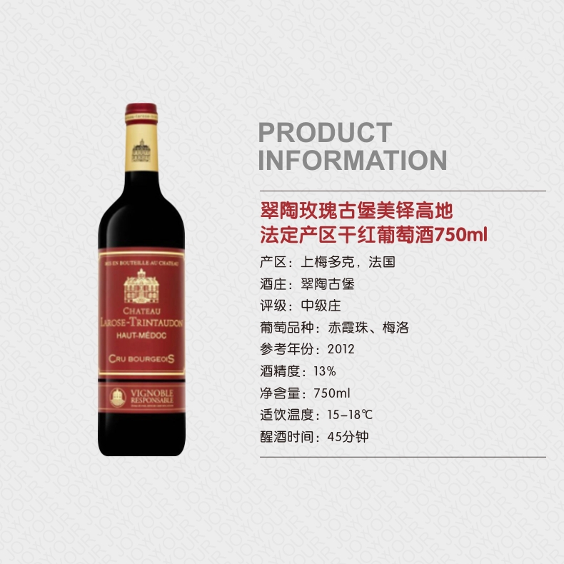 法国翠陶玫瑰古堡美铎高地法定产区干红葡萄酒750ml/010331 橡木桶陈酿口感圆润单宁紧致