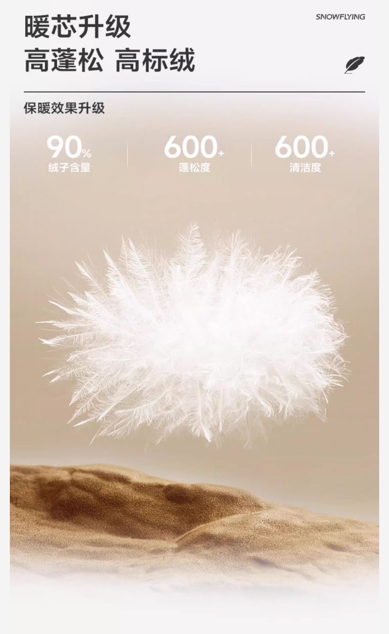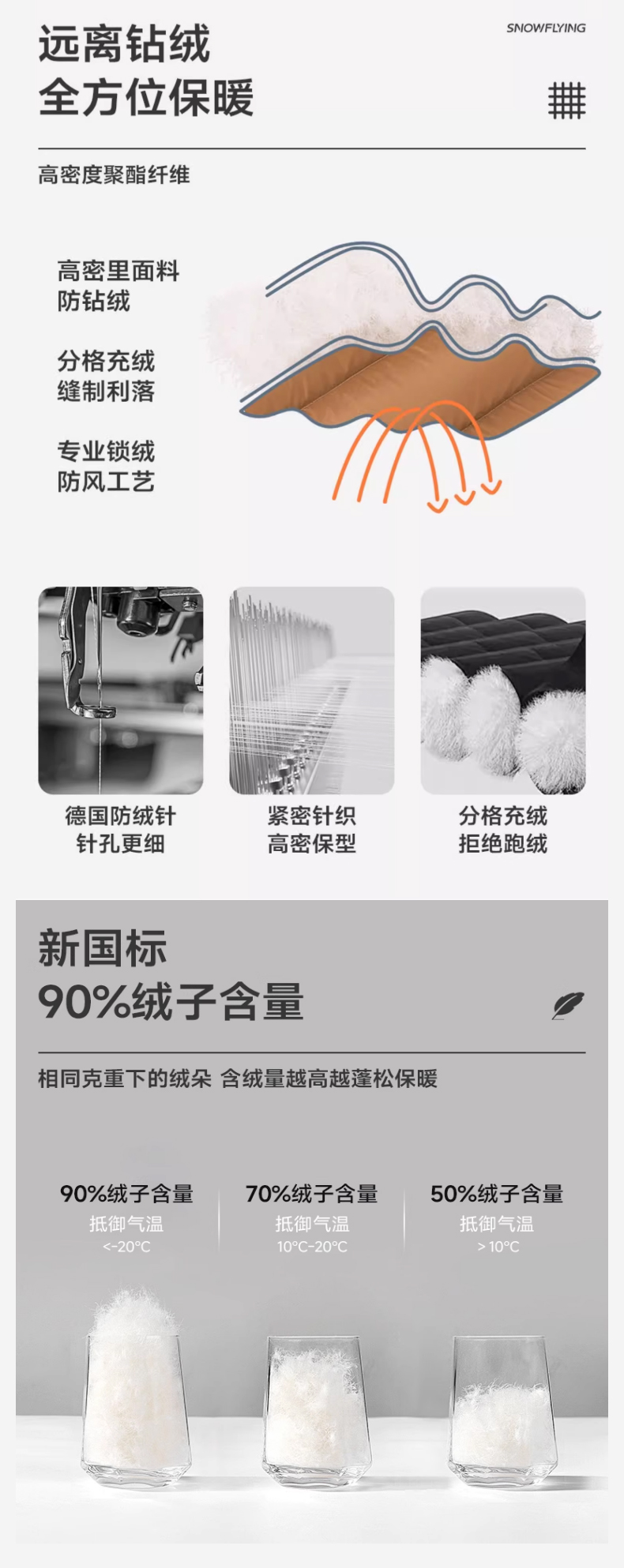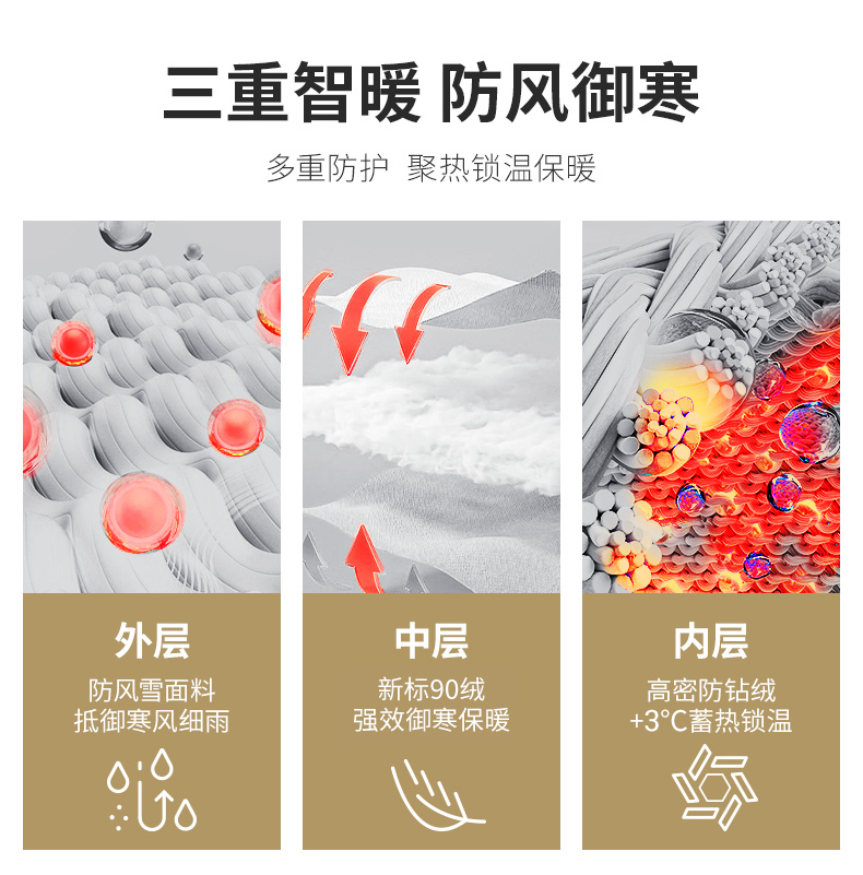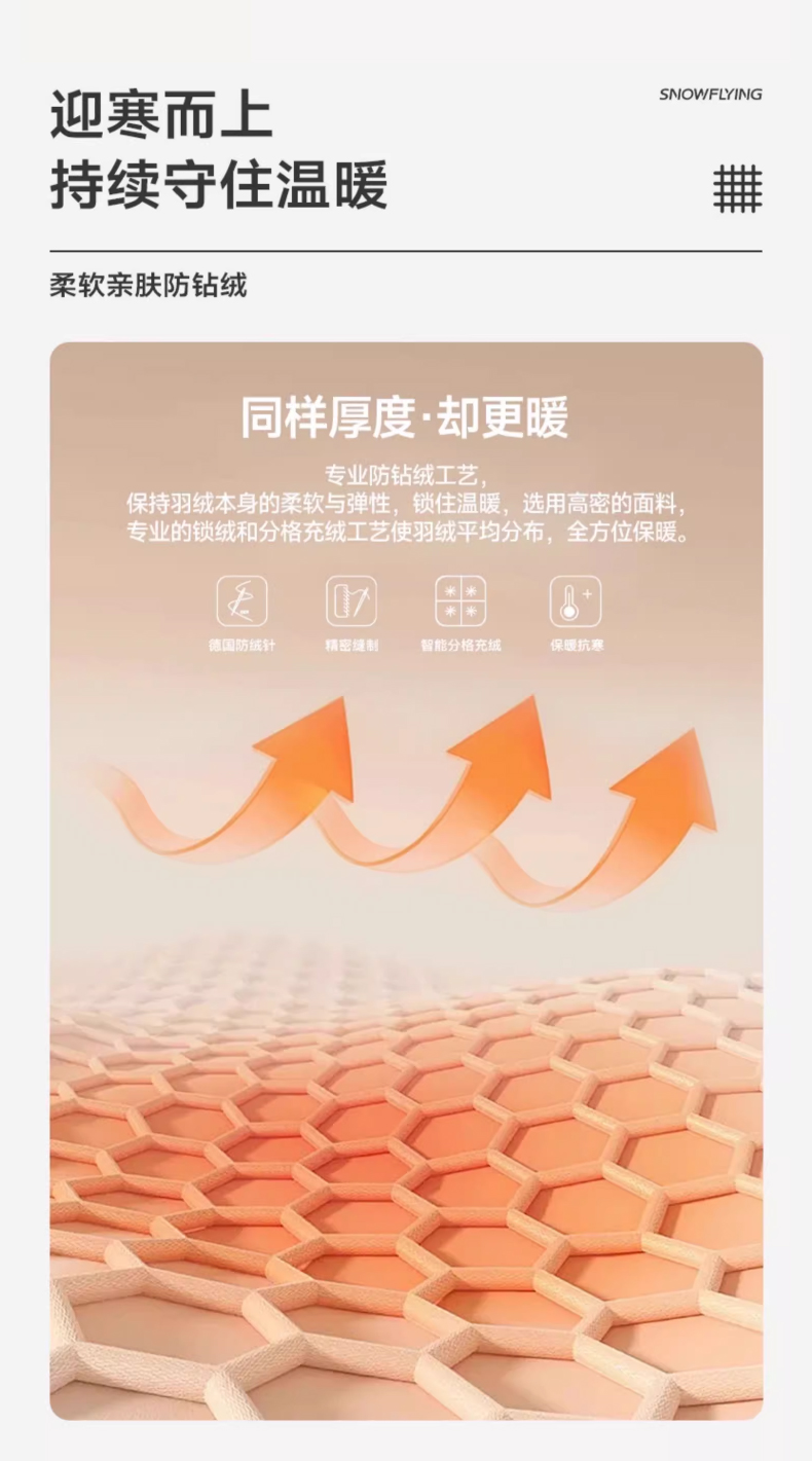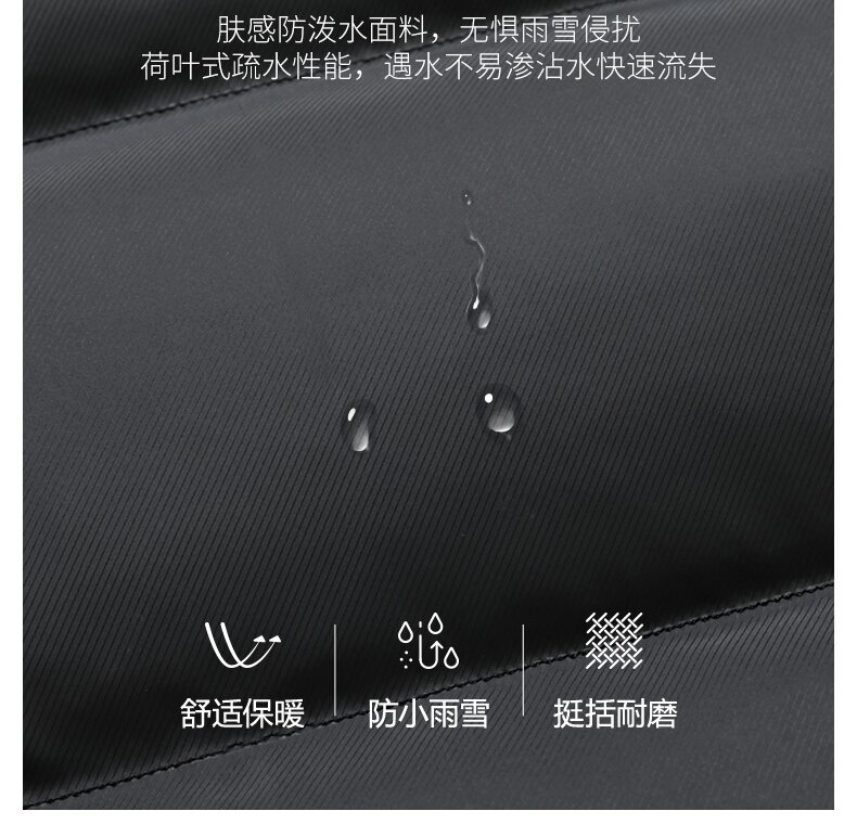 2、免洗肤感海洛斯面料 防泼水 雨雪不易渗透内里 持久保暖干爽舒适