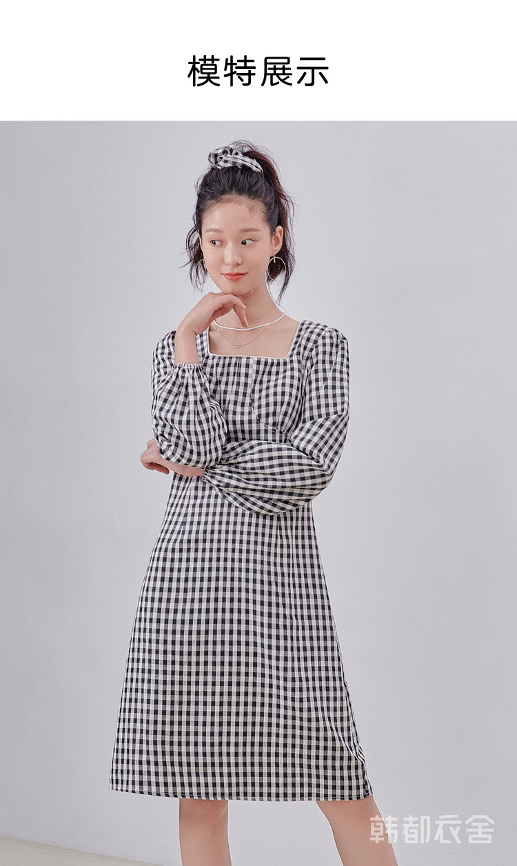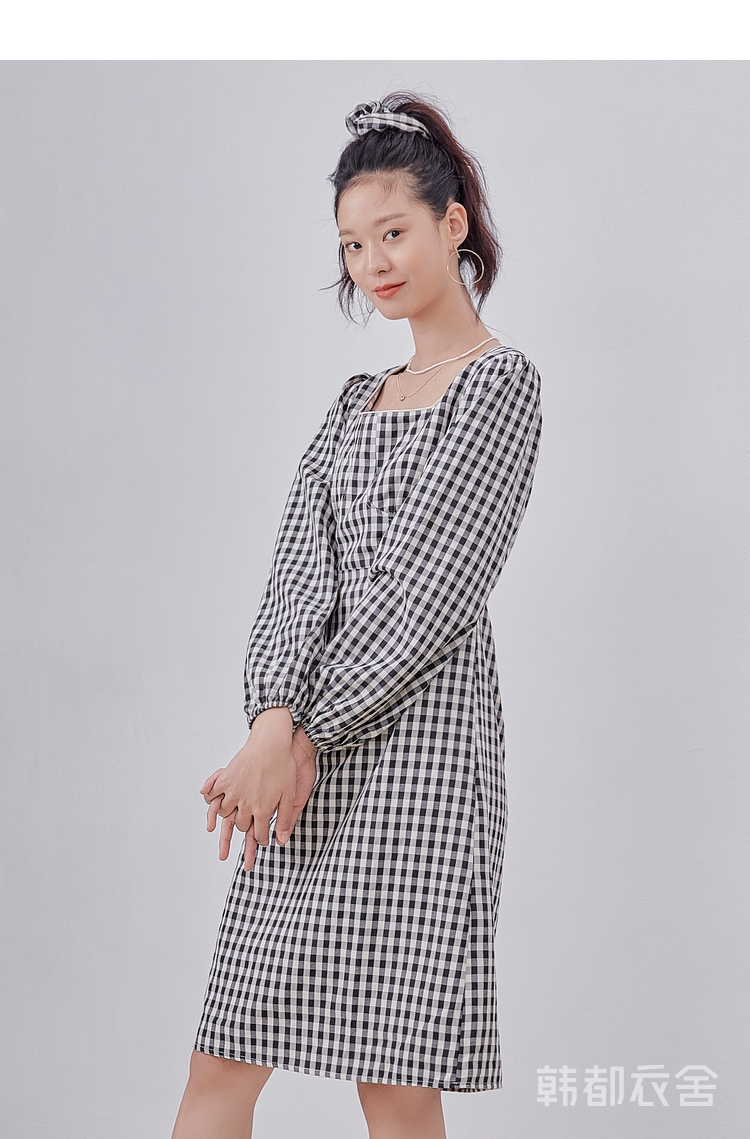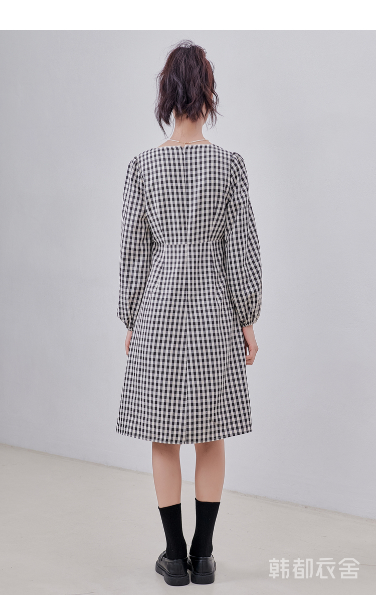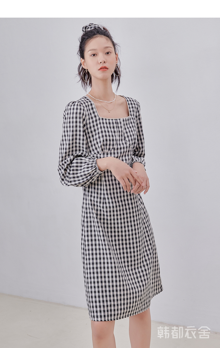 韩都衣舍冬季新款复古格子方领高腰显瘦气质连衣裙女OM82314A