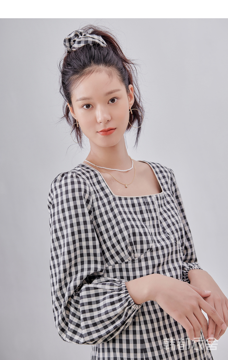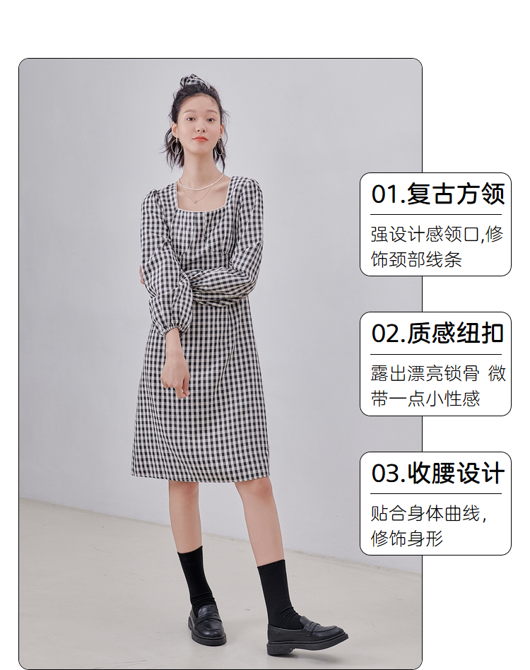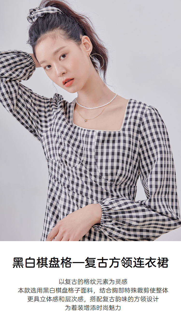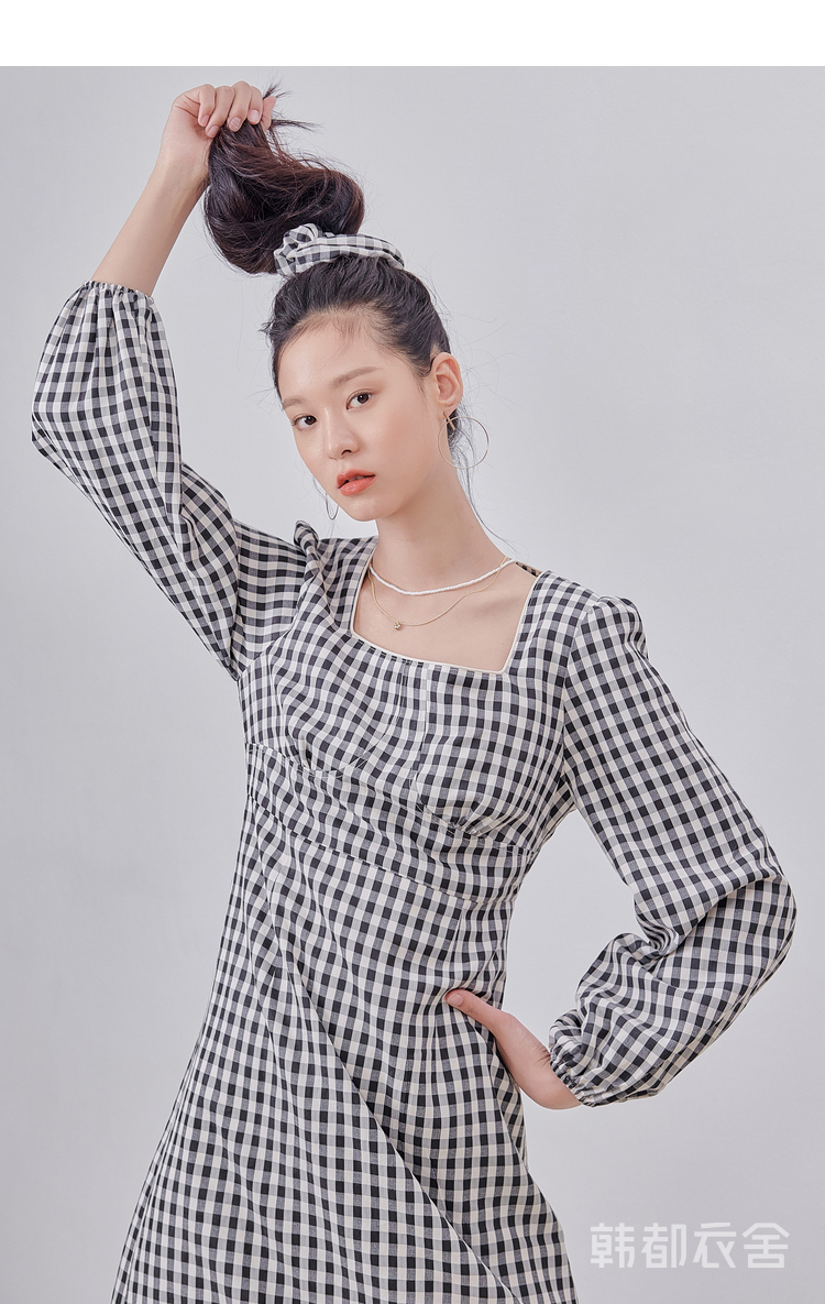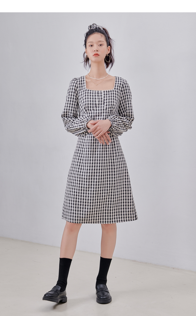 韩都衣舍冬季新款复古格子方领高腰显瘦气质连衣裙女OM82314A