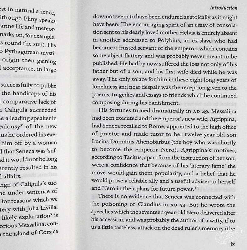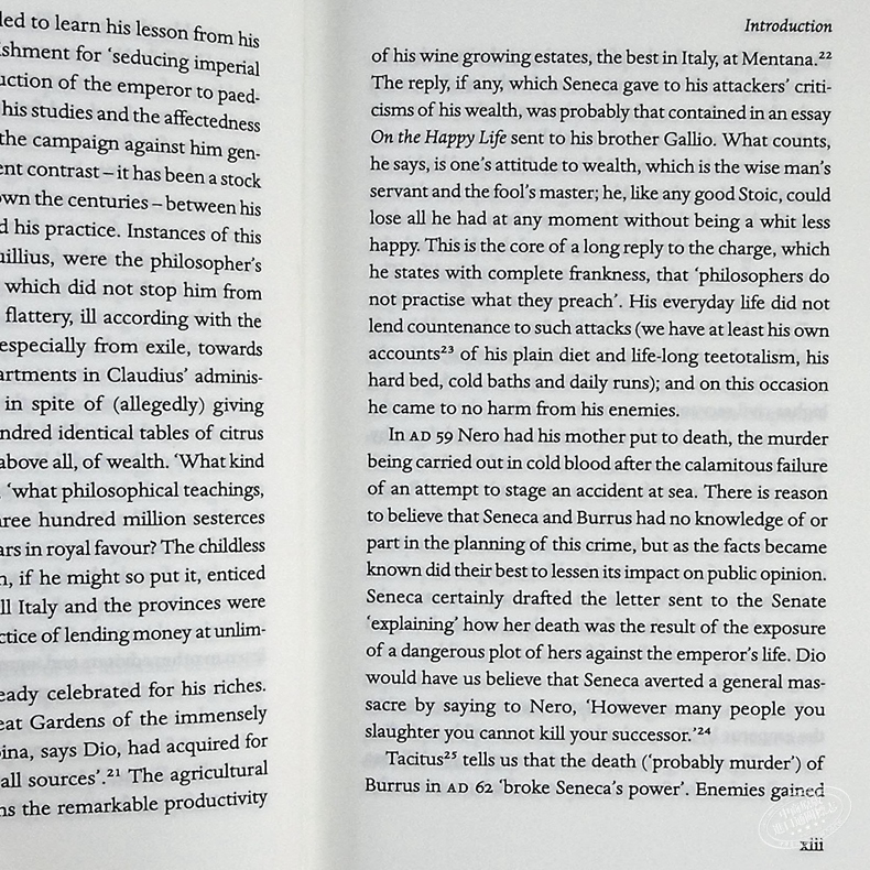 罗宾·坎贝尔清晰的翻译抓住了塞内加的幽默和严谨的警句风格。在他的介绍中,他讨论了塞内加的哲学和他作为暴君尼禄的顾问的动荡生涯之间的紧张关系。卢修斯·安内乌斯·塞内加(公元前4年-公元65年)出生在西班牙,但按照罗马共和国的传统价值观长大。
