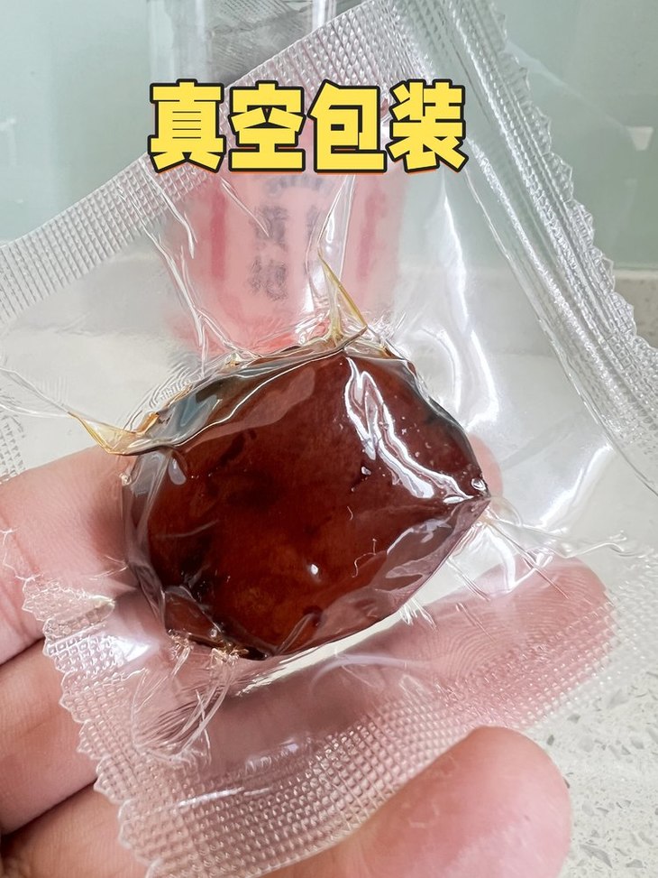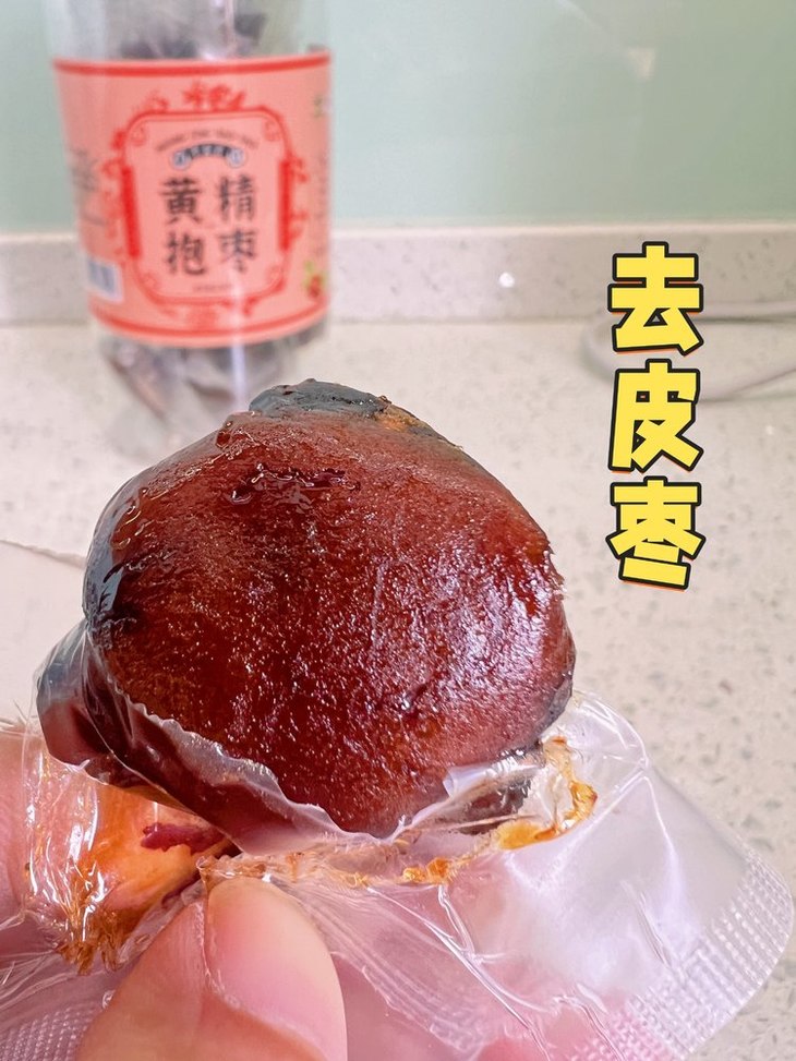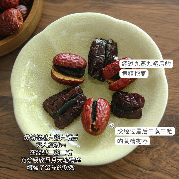 三蒸三晒的红枣中间嵌入一块,九蒸九晒的黄精果