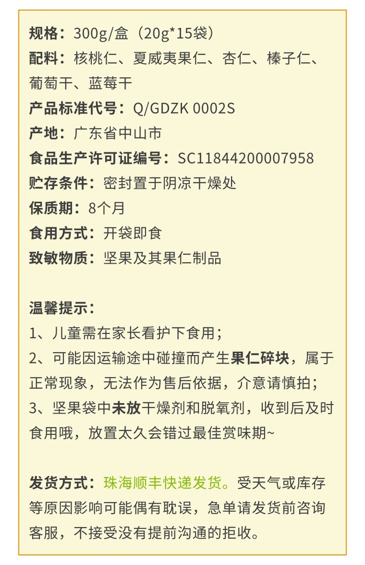 每小袋原料按重量排序,依次如下:核桃仁、夏威夷果仁、杏仁、榛子、无核白葡萄干、蓝莓干。但受到原料大小不同、机器分装误差等影响,每小袋的实际重量可能会有微小误差。