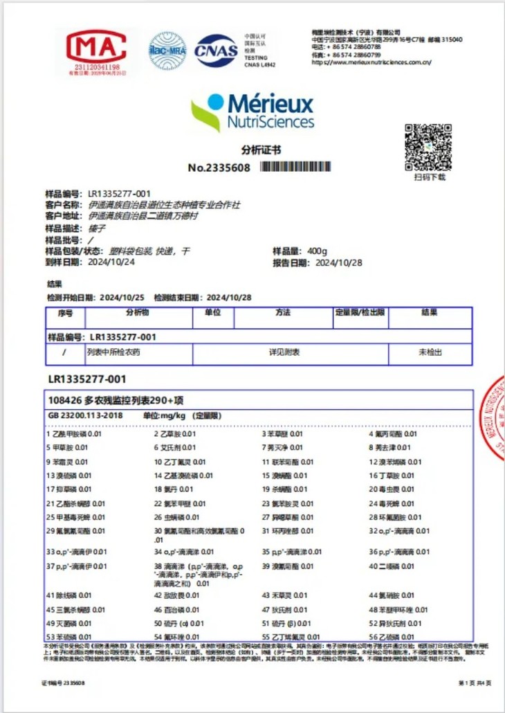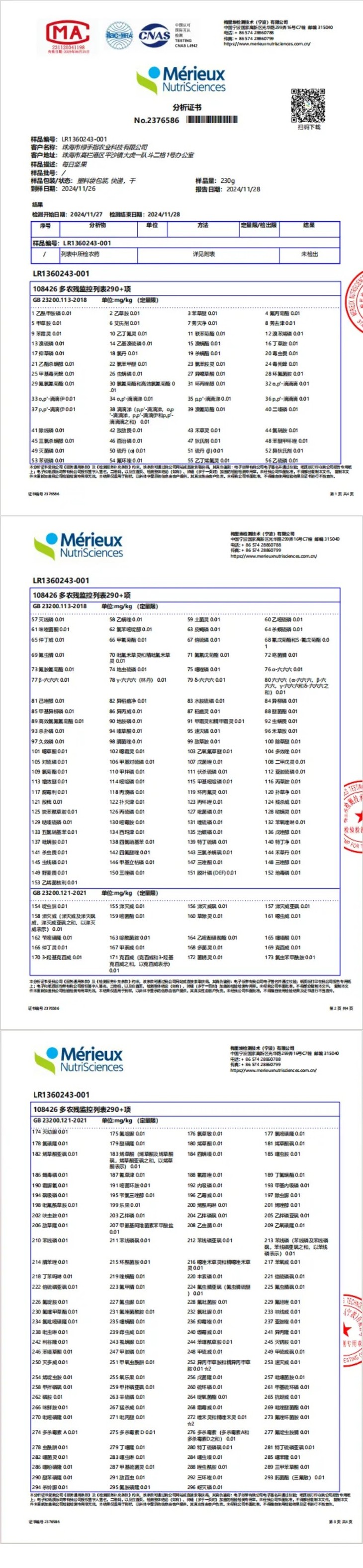榛子仁单独做了一个农残检测(290+项农残未检出),详细如下。