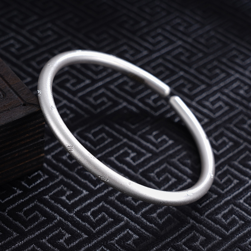 【寓意】:纯银开口手镯,表面间隔点缀不规则花纹,宛若天穹陨星,寓意天赐祥瑞,聚气纳福。