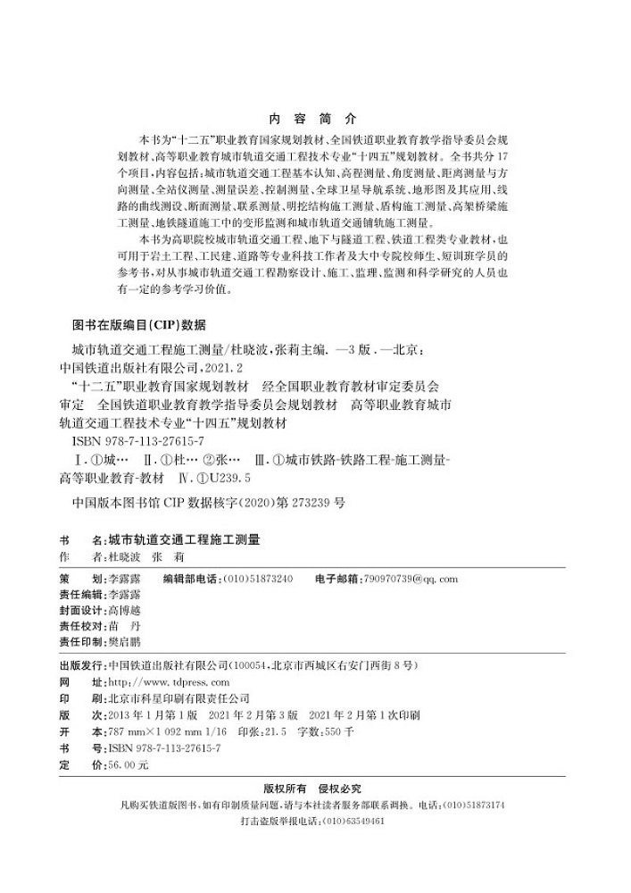 978-7-113-27615-7城市轨道交通工程施工测量(第三版)