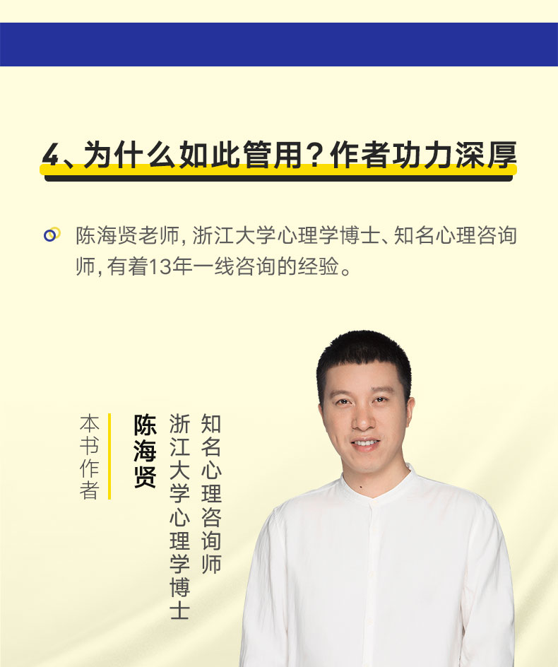 陈海贤,浙江大学心理学博士,知名心理咨询师,拥有13年心理咨询经验,累计接待超过6000名来访者。他曾任教于浙江大学,期间开设的《积极心理学》被誉为受欢迎的通识课之一。他也是得到App受欢迎的老师之一,在「得到」开设了2门课程《陈海贤·自我发展心理学》《陈海贤·亲密关系30讲》,有超过12万人跟随他一起学习。