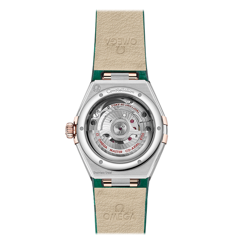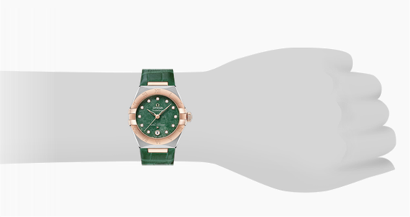镜面材质 | 蓝宝石水晶玻璃 | 表盘 | 经典的半月形切面、“托爪”。 绿色砂金石表盘 表圈镌刻罗马数字时标,6点位设有日历窗。指针、小时刻度、欧米茄品牌标识以及星徽标志以Sedna 18K金制成。 |
