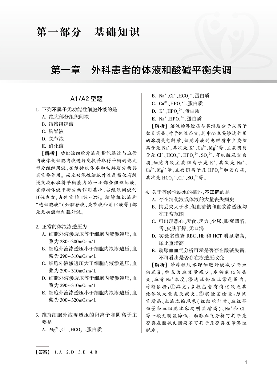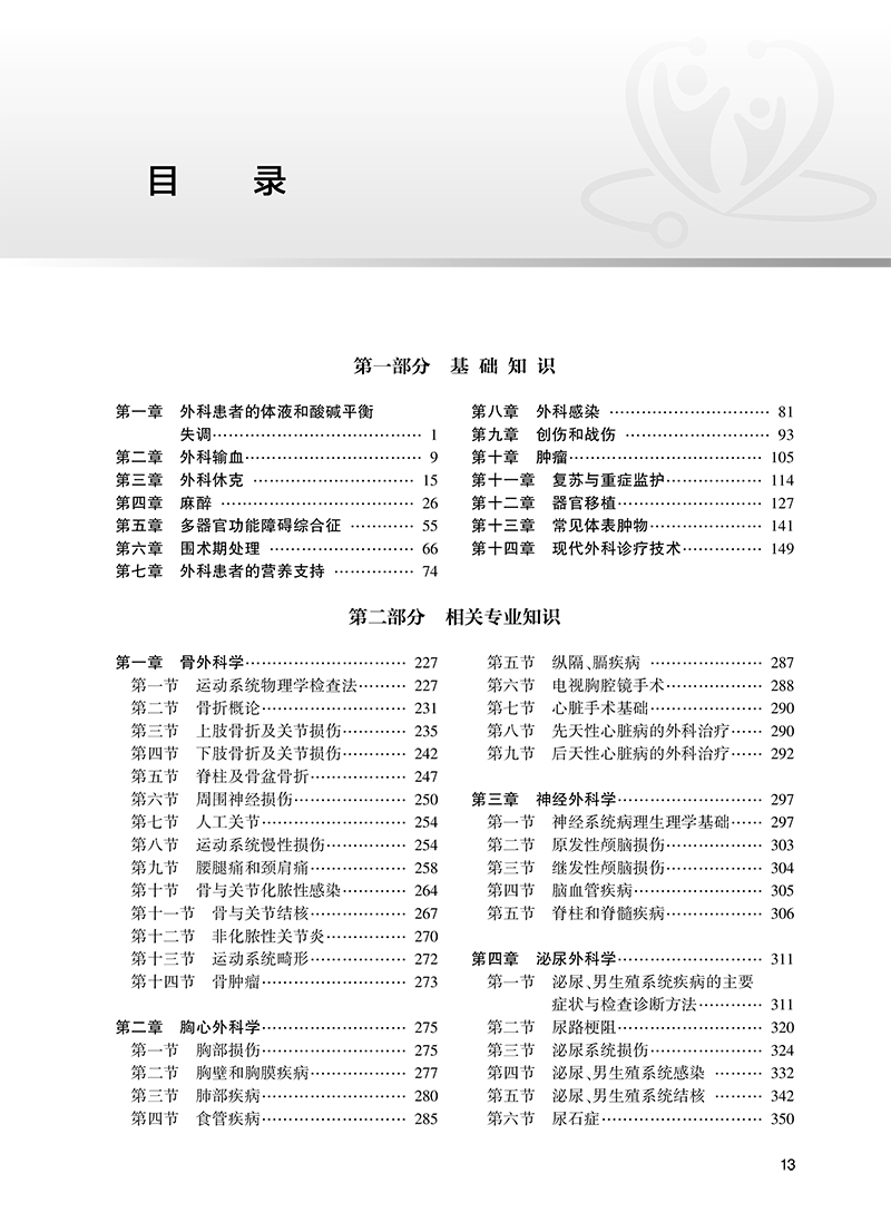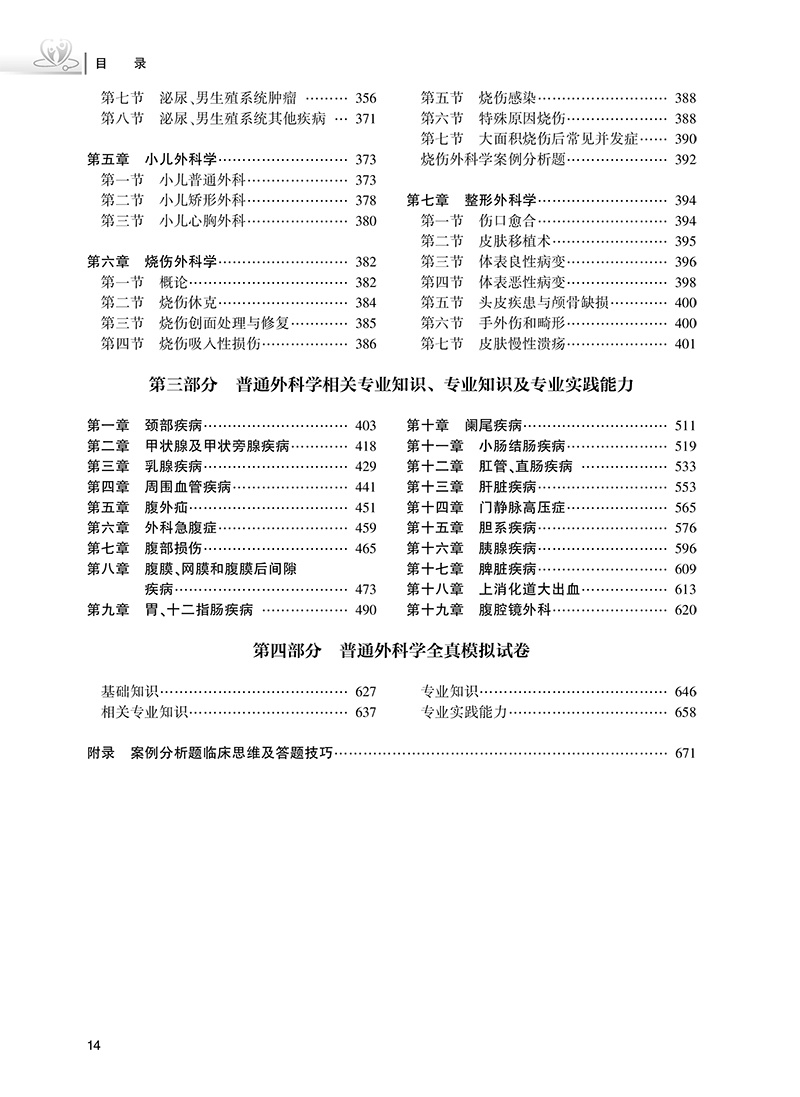 第一部分 基础知识 第一章 外科患者的体液和酸碱平衡失调/ 1 第二章 外科输血/ 9 第三章 外科休克 / 15 第四章 麻醉 / 26 第五章 多器官功能障碍综合征 / 55 第六章 围术期处理 / 66 第七章 外科患者的营养支持 / 74 第八章 外科感染 / 81 第九章 创伤和战伤 / 93 第十章 肿瘤/ 105 第十一章 复苏与重症监护/ 114 第十二章 器官移植/ 127 第十三章 常见体表肿物/ 141 第十四章 现代外科诊疗技术/ 149 第二部分 相关专业知识 第一章 骨外科学/ 227 第一节 运动系统物理学检查法/ 227 第二节 骨折概论/ 231 第三节 上肢骨折及关节损伤/ 235 第四节 下肢骨折及关节损伤/ 242 第五节 脊柱及骨盆骨折/ 247 第六节 周围神经损伤/ 250 第七节 人工关节/ 254 第八节 运动系统慢性损伤/ 254 第九节 腰腿痛和颈肩痛/ 258 第十节 骨与关节化脓性感染/ 264 第十一节 骨与关节结核/ 267 第十二节 非化脓性关节炎/ 270 第十三节 运动系统畸形/ 272 第十四节 骨肿瘤/ 273 第二章 胸心外科学/ 275 第一节 胸部损伤/ 275 第二节 胸壁和胸膜疾病/ 277 第三节 肺部疾病/ 280 第四节 食管疾病/ 285 第五节 纵隔、膈疾病 / 287 第六节 电视胸腔镜手术/ 288 第七节 心脏手术基础/ 290 第八节 先天性心脏病的外科治疗/ 290 第九节 后天性心脏病的外科治疗/ 292 第三章 神经外科学/ 297 第一节 神经系统病理生理学基础/ 297 第二节 原发性颅脑损伤/ 303 第三节 继发性颅脑损伤/ 304 第四节 脑血管疾病/ 305 第五节 脊柱和脊髓疾病/ 306 第四章 泌尿外科学/ 311 第一节 泌尿、男生殖系统疾病的主要 症状与检查诊断方法/ 311 第二节 尿路梗阻/ 320 第三节 泌尿系统损伤/ 324 第四节 泌尿、男生殖系统感染 / 332 第五节 泌尿、男生殖系统结核 / 342 第六节 尿石症/ 350 第七节 泌尿、男生殖系统肿瘤 / 356 第八节 泌尿、男生殖系统其他疾病 / 371 第五章 小儿外科学/ 373 第一节 小儿普通外科/ 373 第二节 小儿矫形外科/ 378 第三节 小儿心胸外科/ 380 第六章 烧伤外科学/ 382 第一节 概论/ 382 第二节 烧伤休克/ 384 第三节 烧伤创面处理与修复/ 385 第四节 烧伤吸入性损伤/ 386 第五节 烧伤感染/ 388 第六节 特殊原因烧伤/ 388 第七节 大面积烧伤后常见并发症/ 390 烧伤外科学案例分析题/ 392 第七章 整形外科学/ 394 第一节 伤口愈合/ 394 第二节 皮肤移植术/ 395 第三节 体表良性病变/ 396 第四节 体表恶性病变/ 398 第五节 头皮疾患与颅骨缺损/ 400 第六节 手外伤和畸形/ 400 第七节 皮肤慢性溃疡/ 401 第三部分 普通外科学相关专业知识、专业知识及专业实践能力 第一章 颈部疾病/ 403 第二章 甲状腺及甲状旁腺疾病/ 418 第三章 乳腺疾病/ 429 第四章 周围血管疾病/ 441 第五章 腹外疝/ 451 第六章 外科急腹症/ 459 第七章 腹部损伤/ 465 第八章 腹膜、网膜和腹膜后间隙疾病/ 473 第九章 胃、十二指肠疾病 / 490 第十章 阑尾疾病/ 511 第十一章 小肠结肠疾病/ 519 第十二章 肛管、直肠疾病 / 533 第十三章 肝脏疾病/ 553 第十四章 门静脉高压症/ 565 第十五章 胆系疾病/ 576 第十六章 胰腺疾病/ 596 第十七章 脾脏疾病/ 609 第十八章 上消化道大出血/ 613 第十九章 腹腔镜外科/ 620 第四部分 普通外科学全真模拟试卷 基础知识/ 627 相关专业知识/ 637 专业知识/ 646 专业实践能力/ 658 附录 案例分析题临床思维及答题技巧/ 671