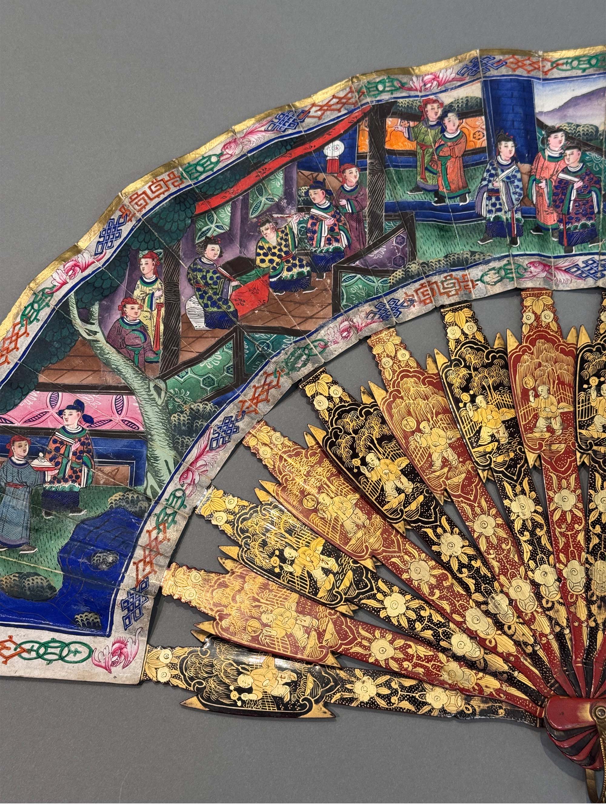 19世纪中国广东十三行出品红黑漆木描金扇骨装饰官邸人物主题纸本彩绘双扇面折扇