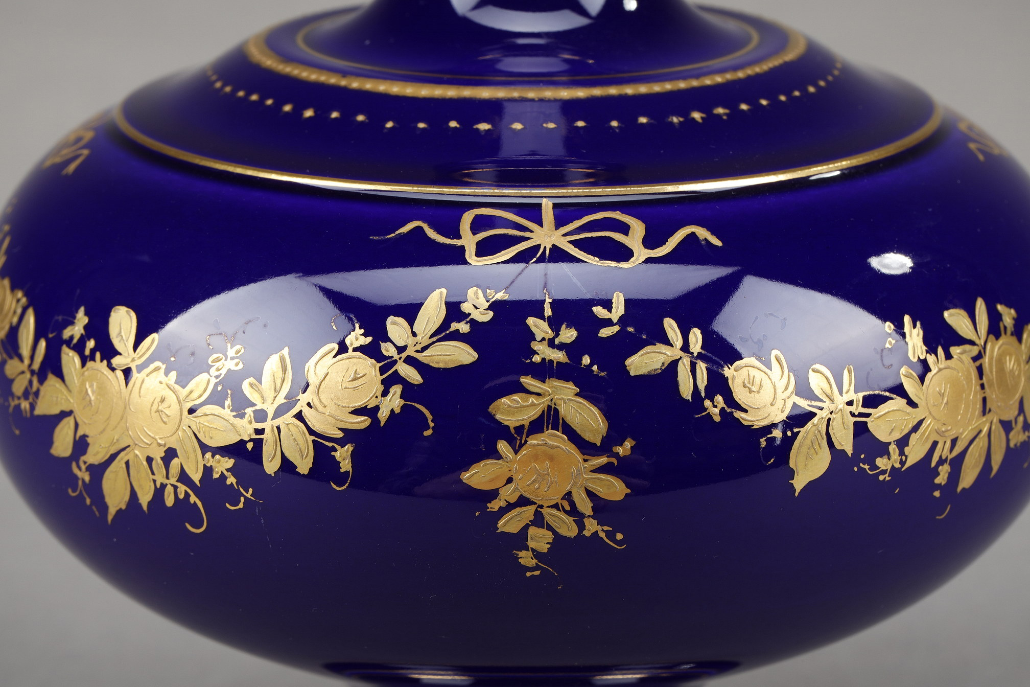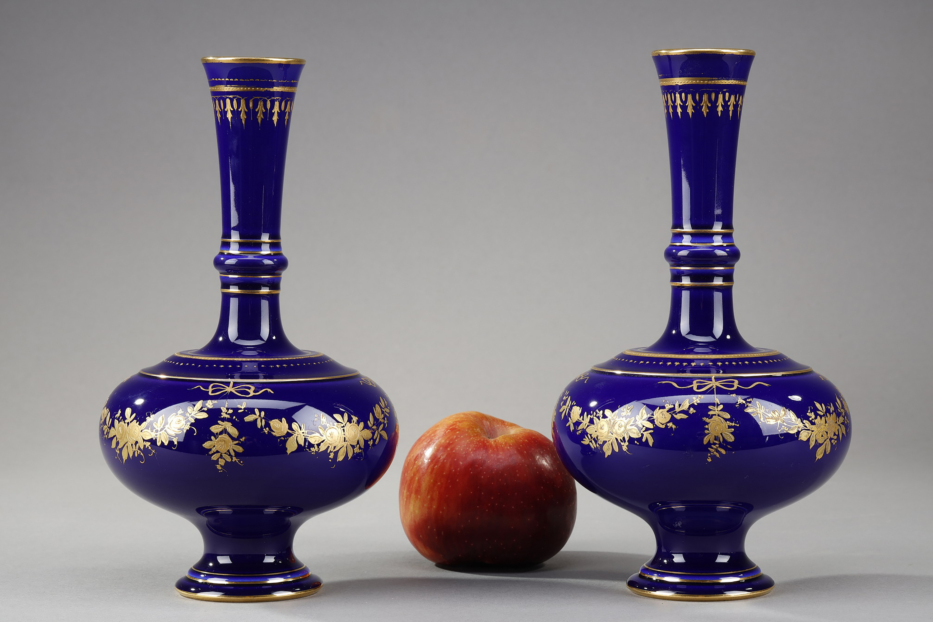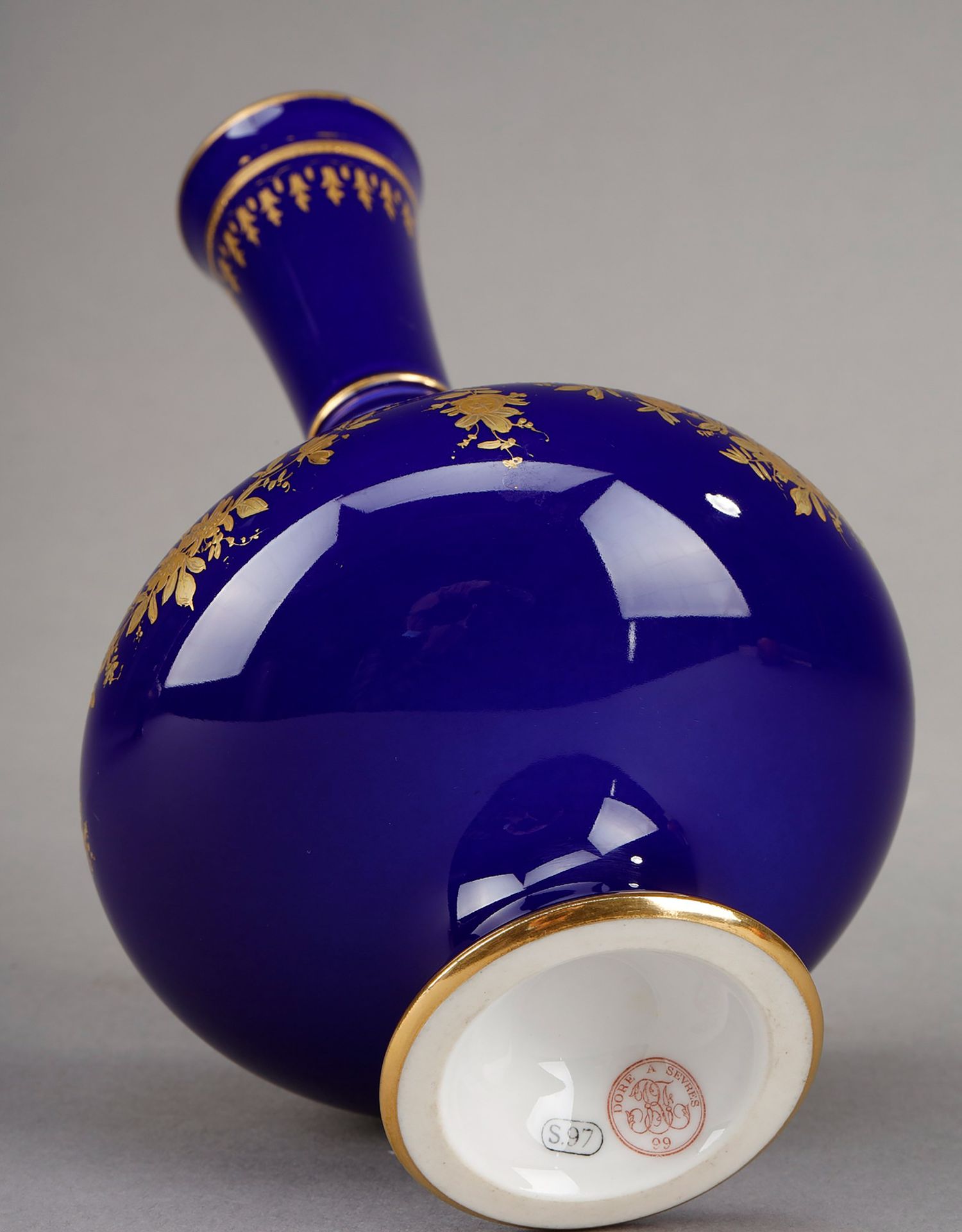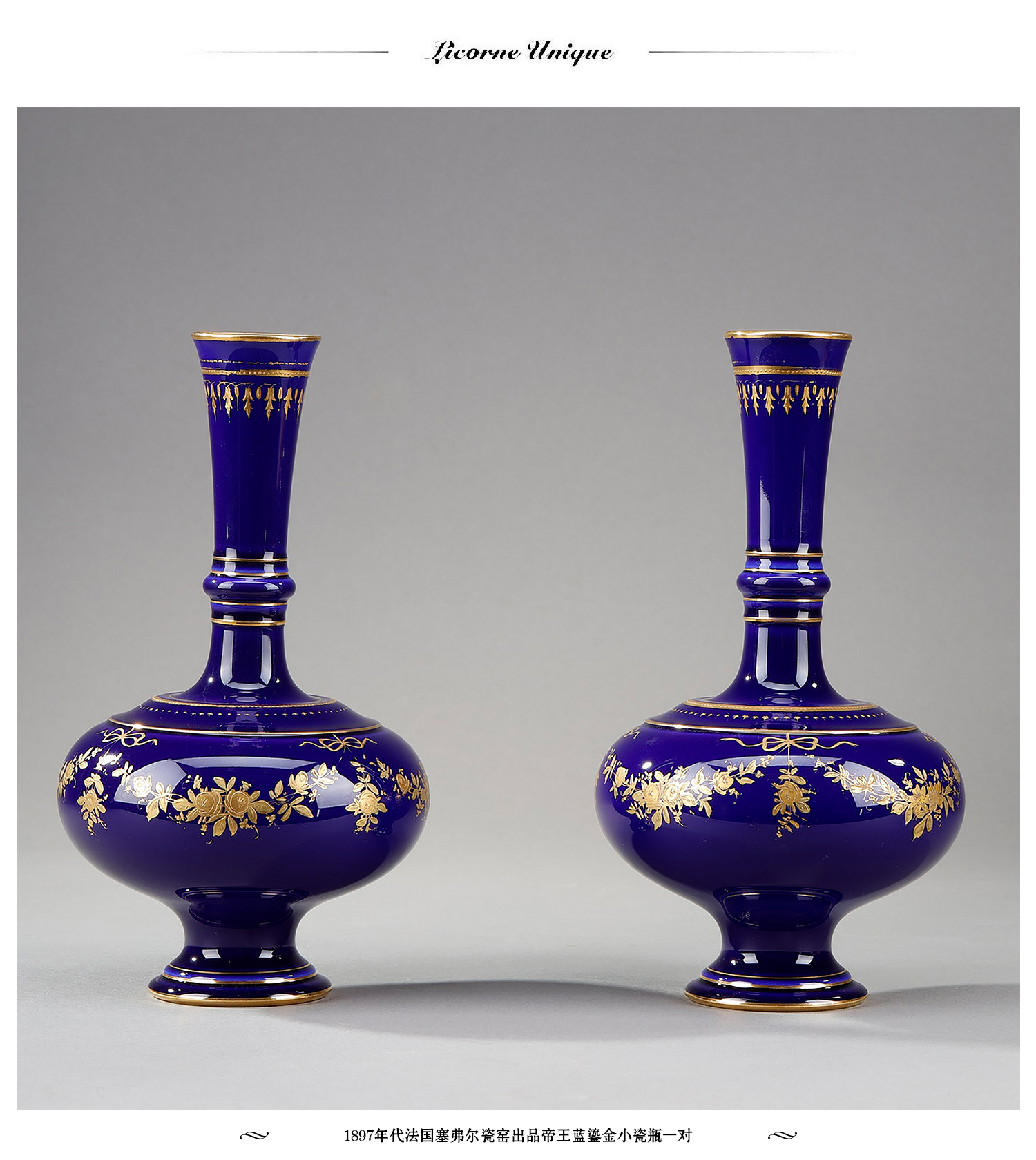 独角鹿西洋古董1897年代法国塞弗尔瓷窑出品帝王蓝鎏金小瓷瓶一对