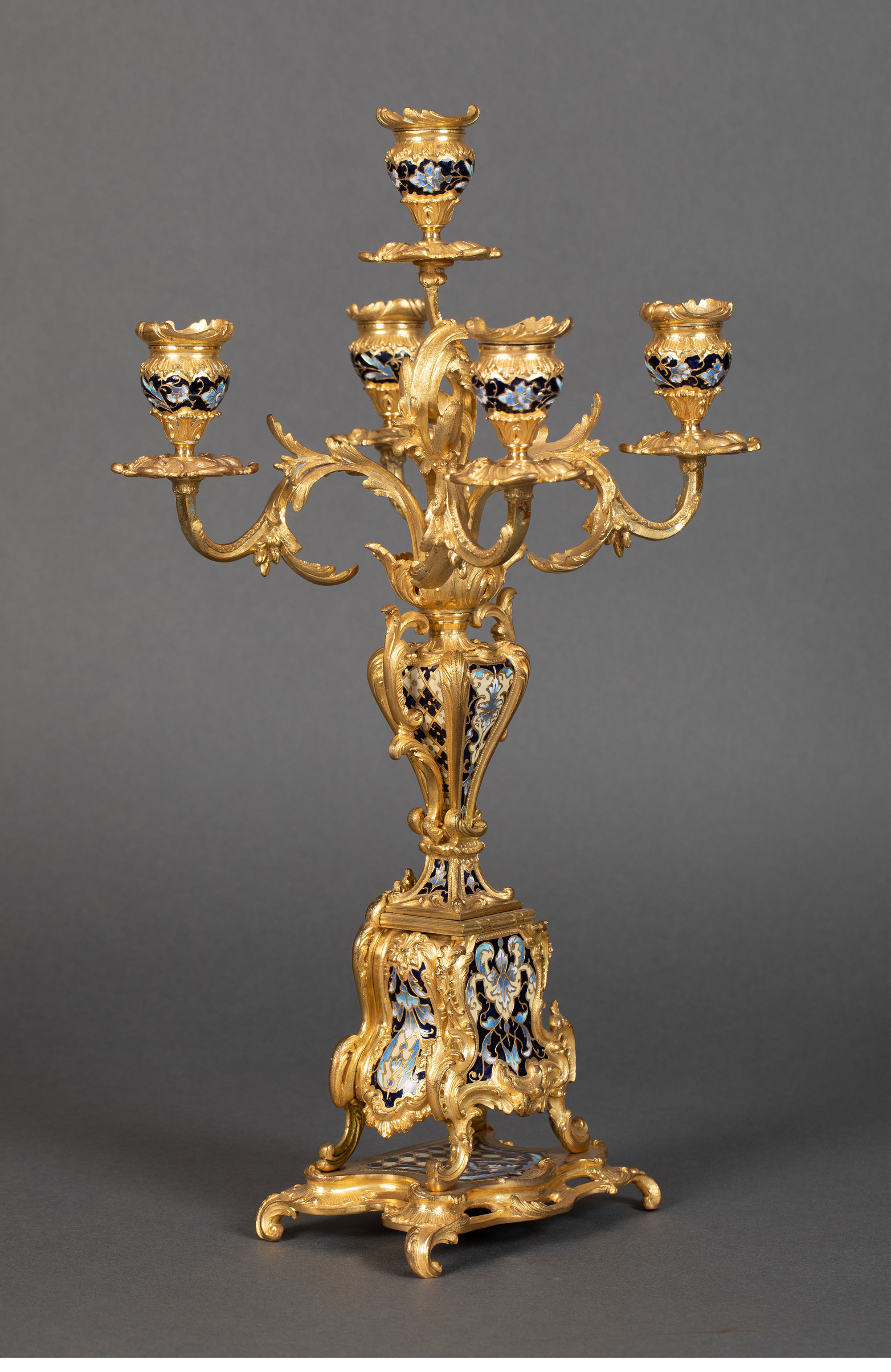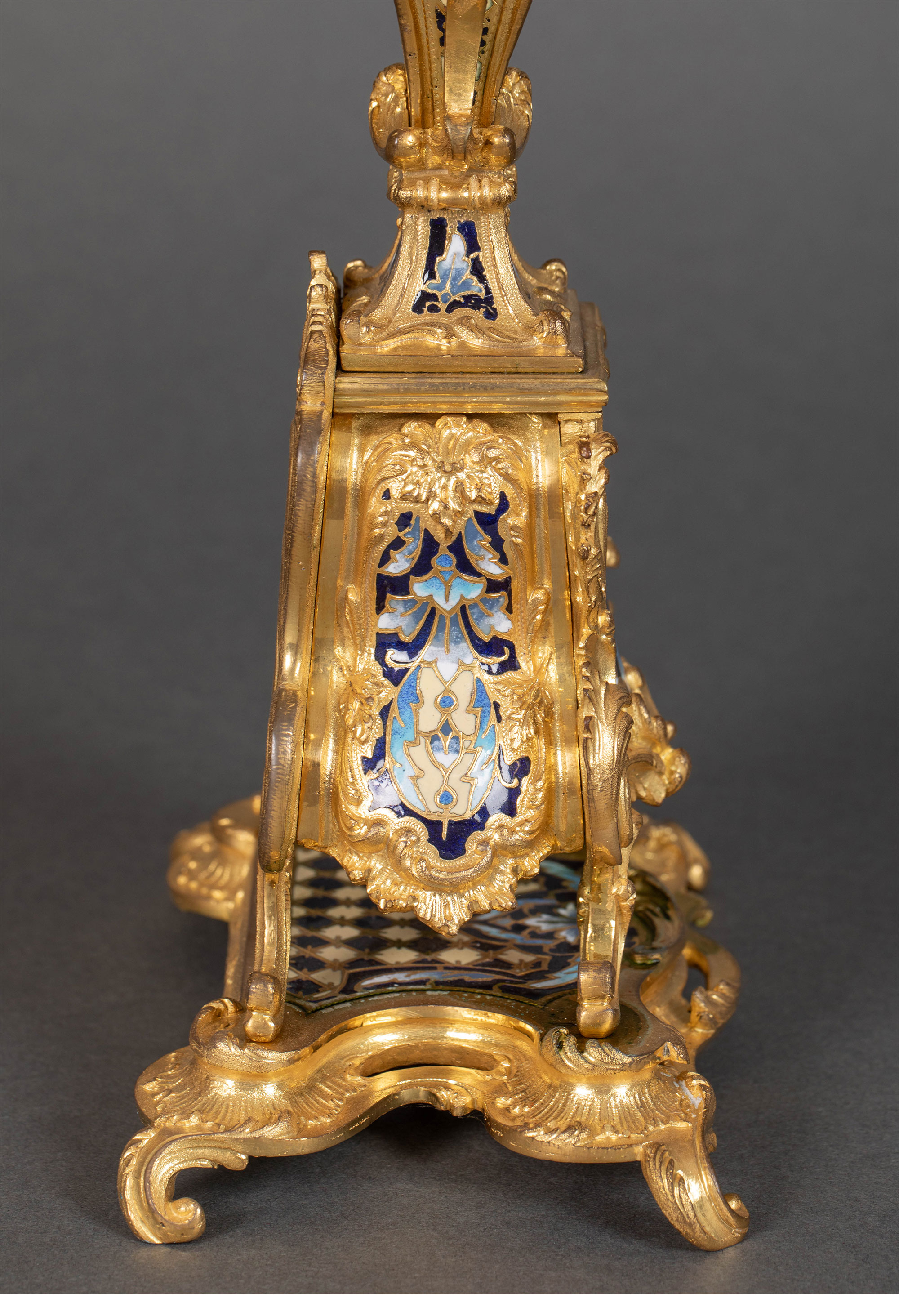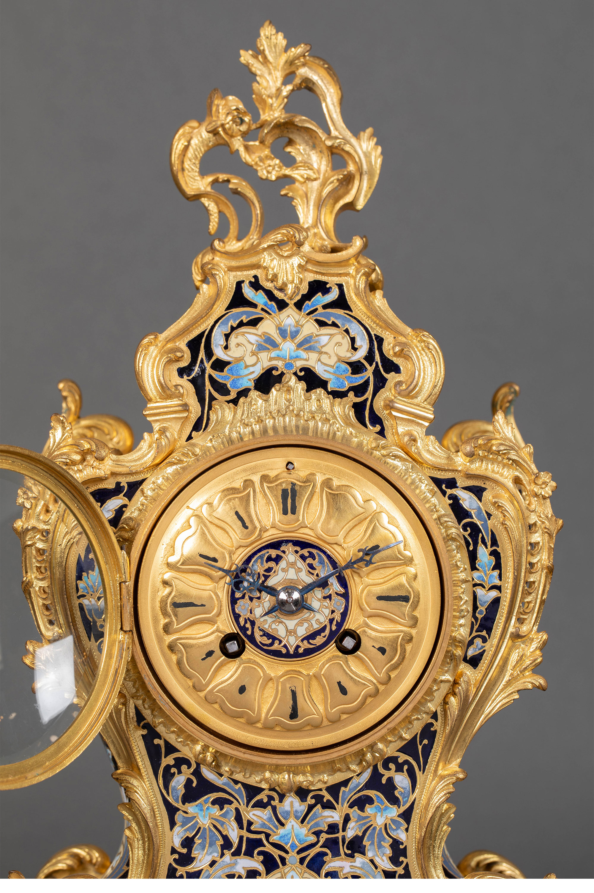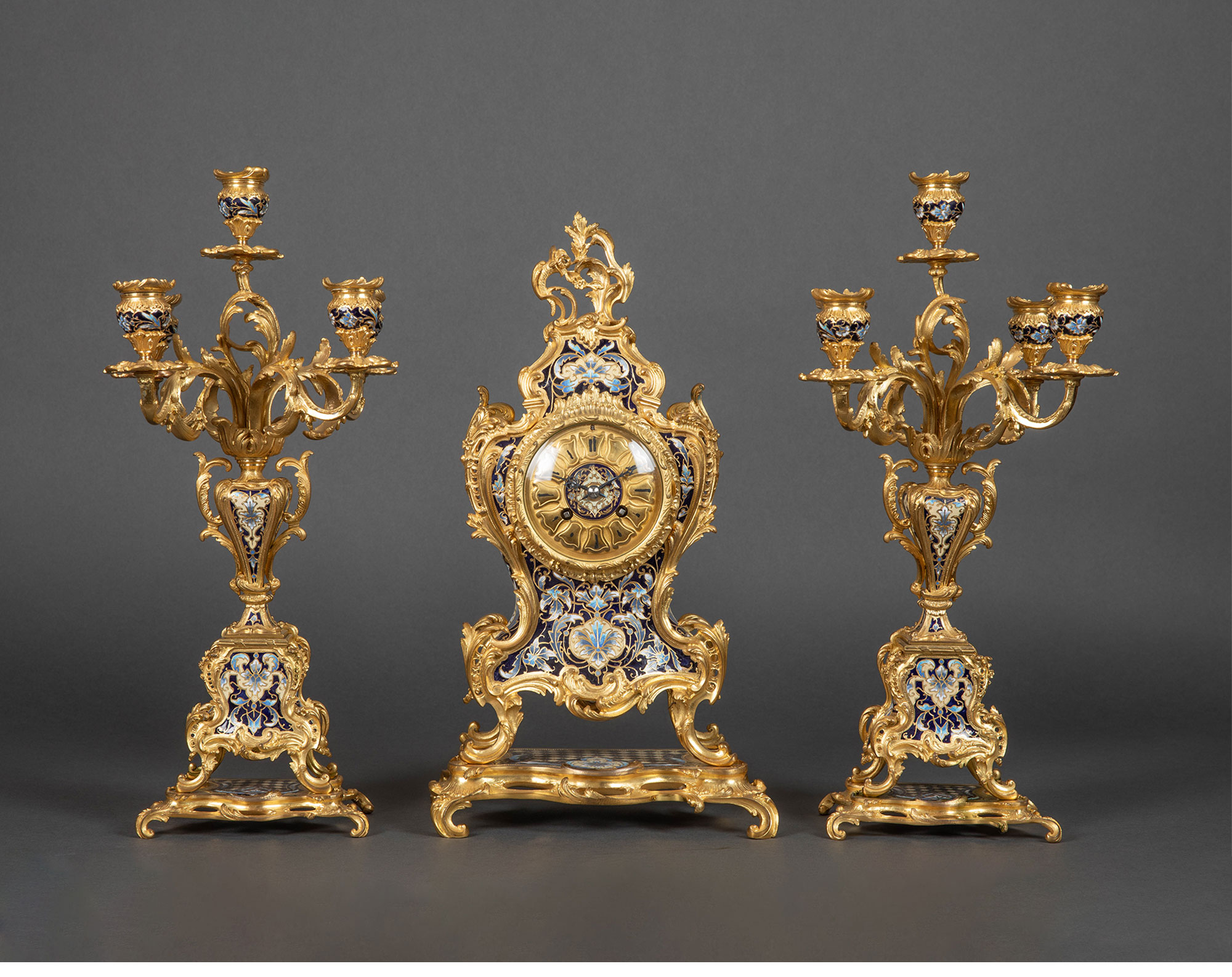 19世纪晚期法国出品路易十五风格铜鎏金精雕镶嵌錾胎珐琅座钟烛台三件套