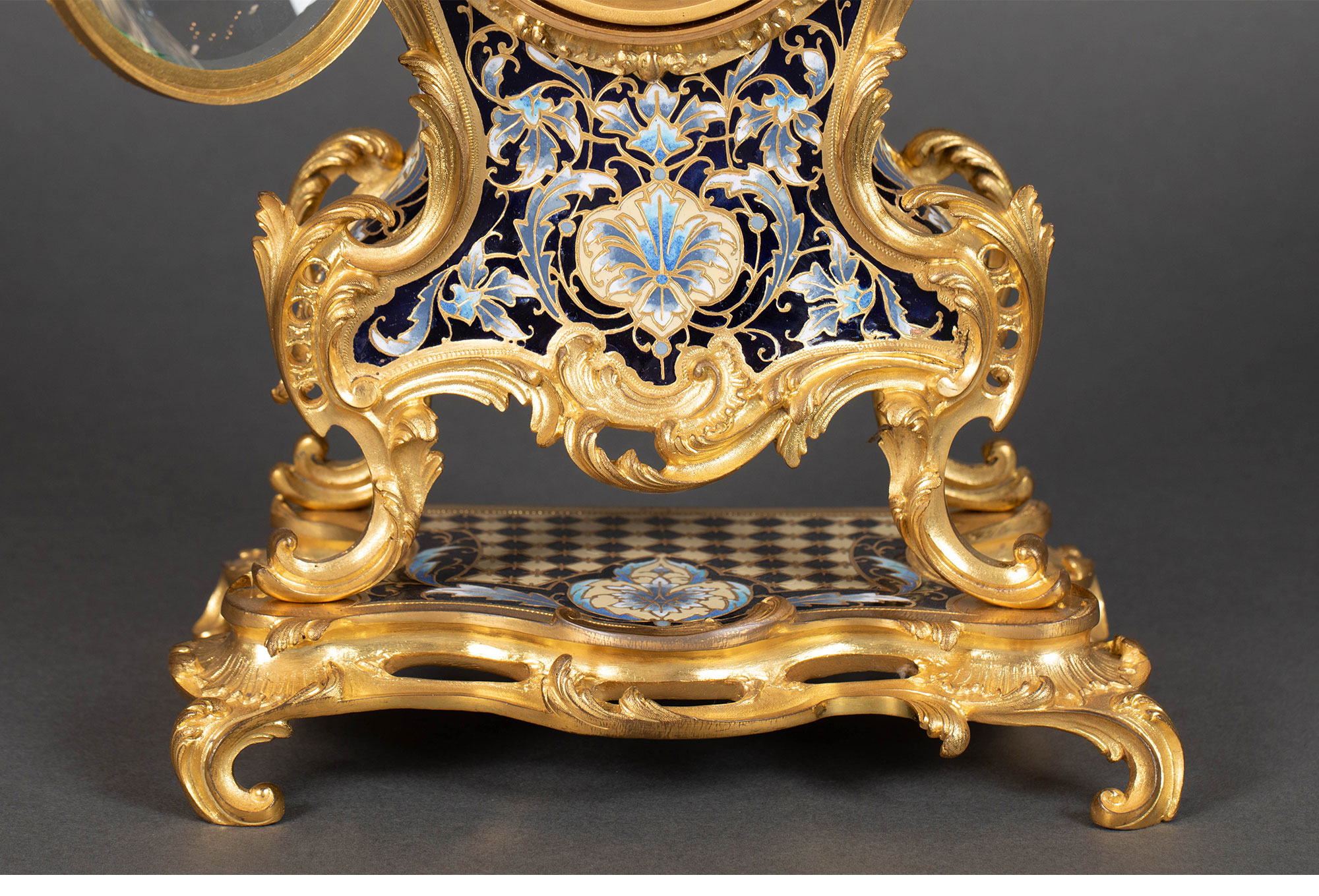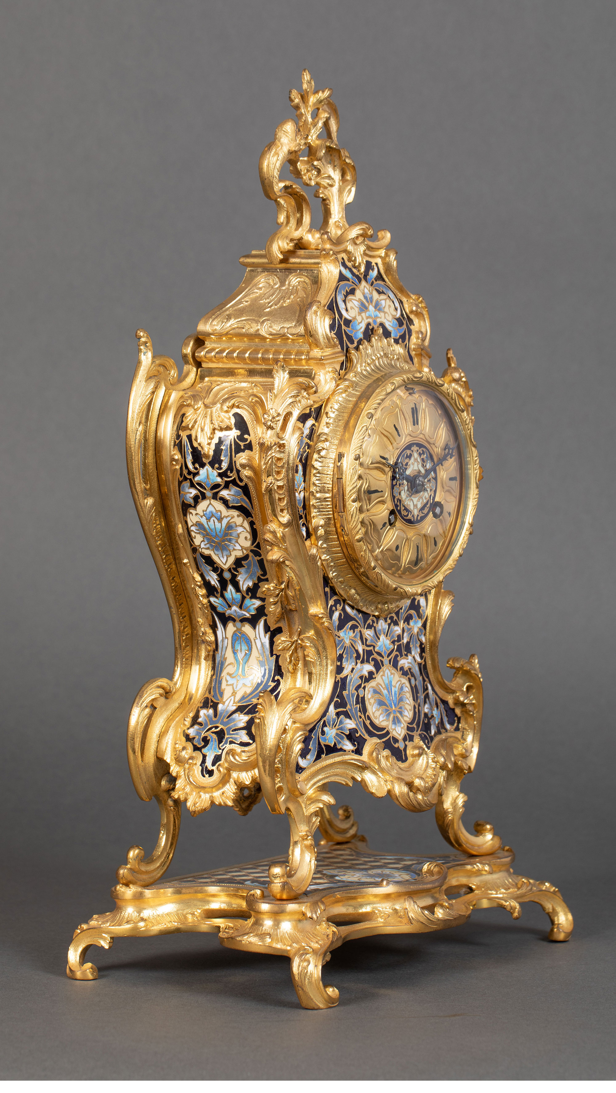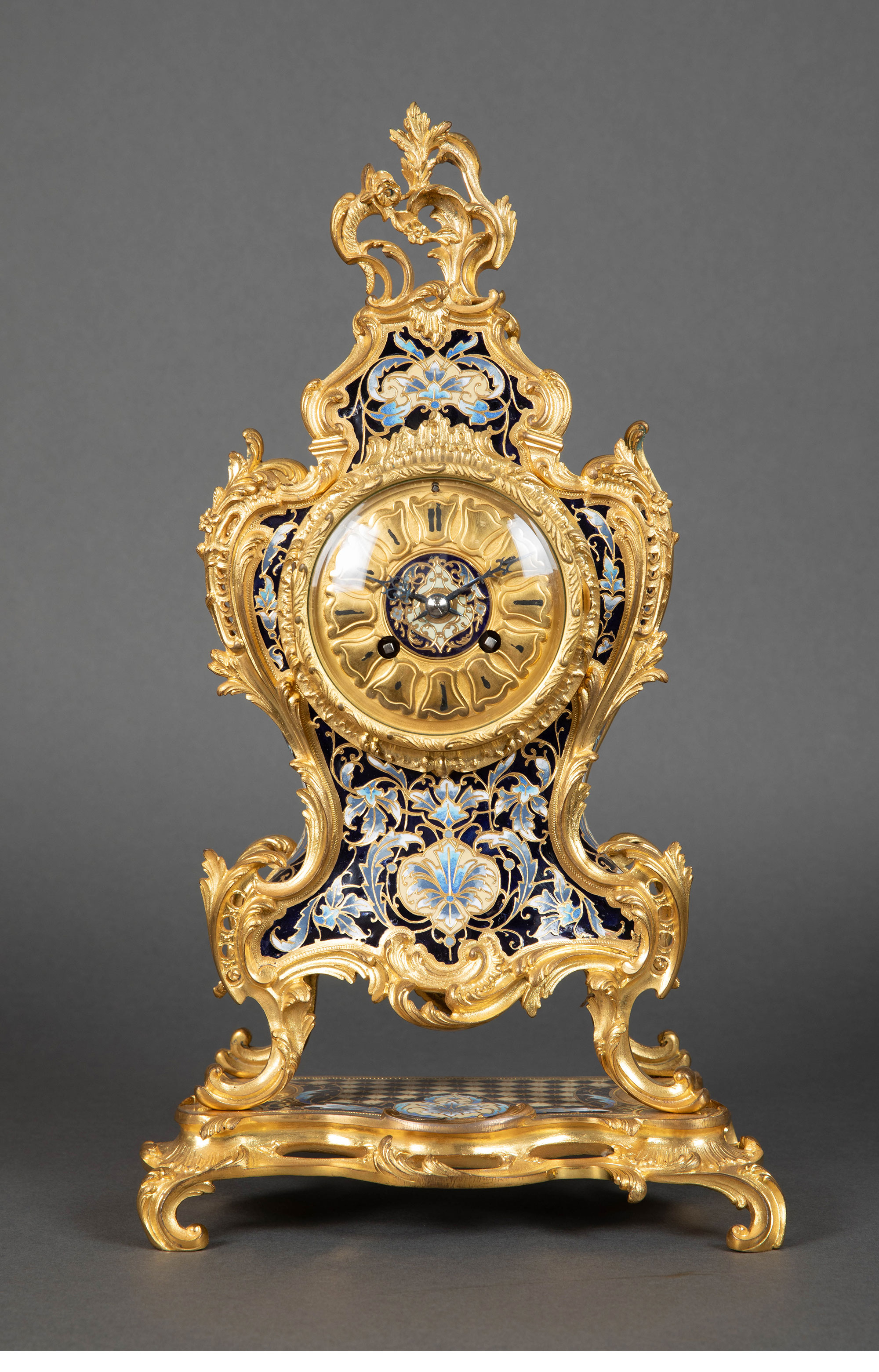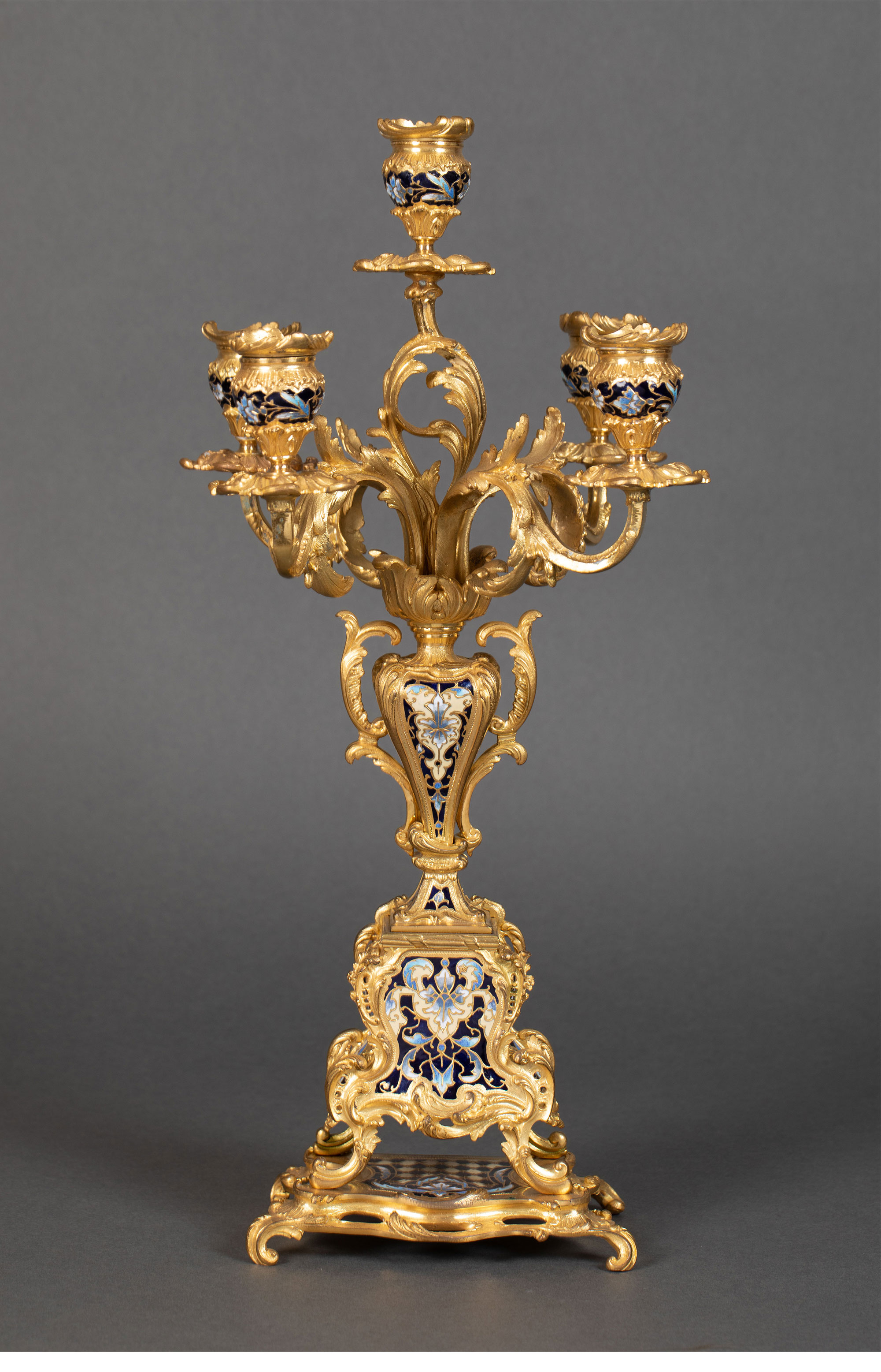 19世纪晚期法国出品路易十五风格铜鎏金精雕镶嵌錾胎珐琅座钟烛台三件套