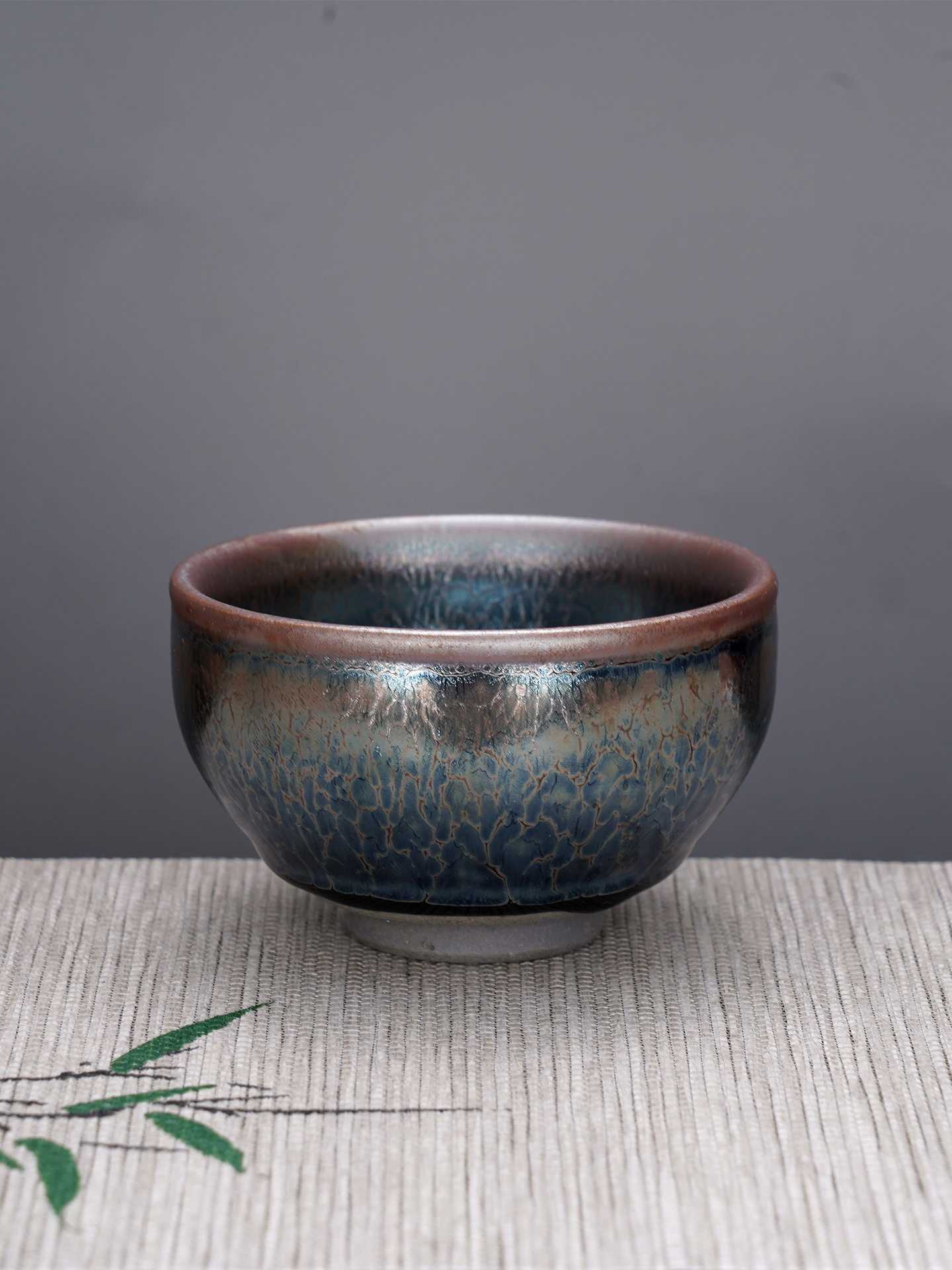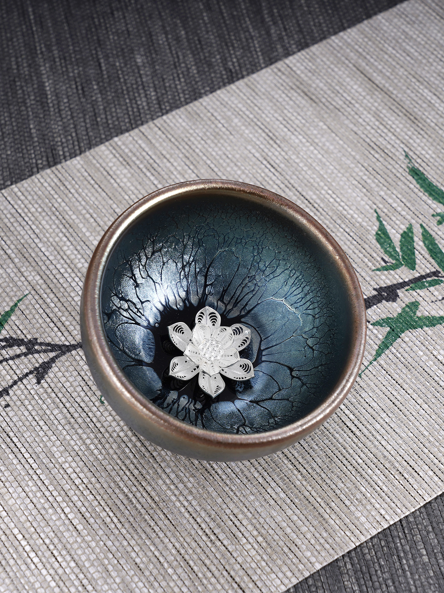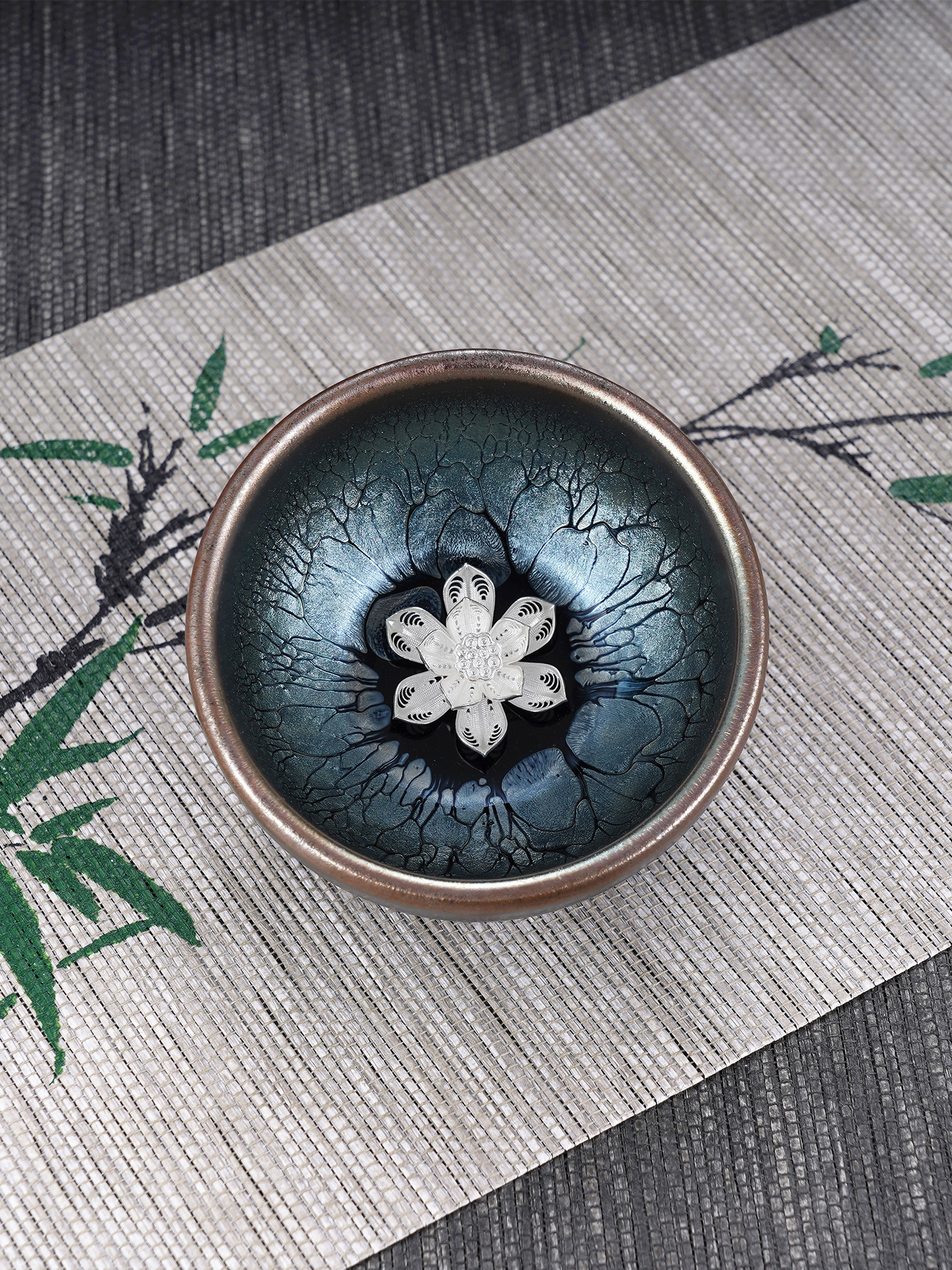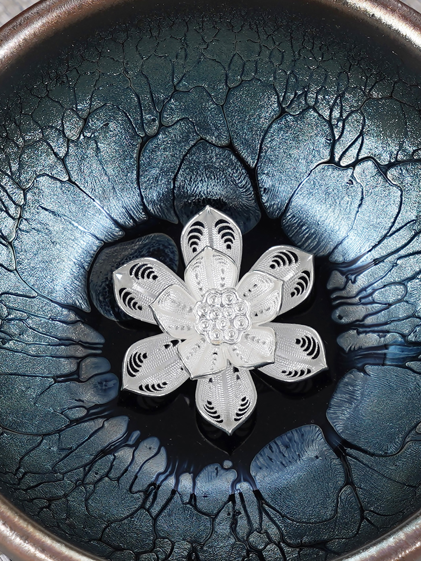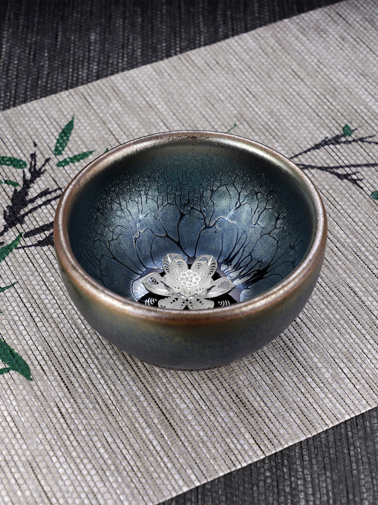 【寓意】:建盏胎质厚实坚硬、纹理变幻多样。杯底镶嵌银花丝装饰,与斑驳纹理巧妙呼应,瑰丽奇幻,美如画卷。