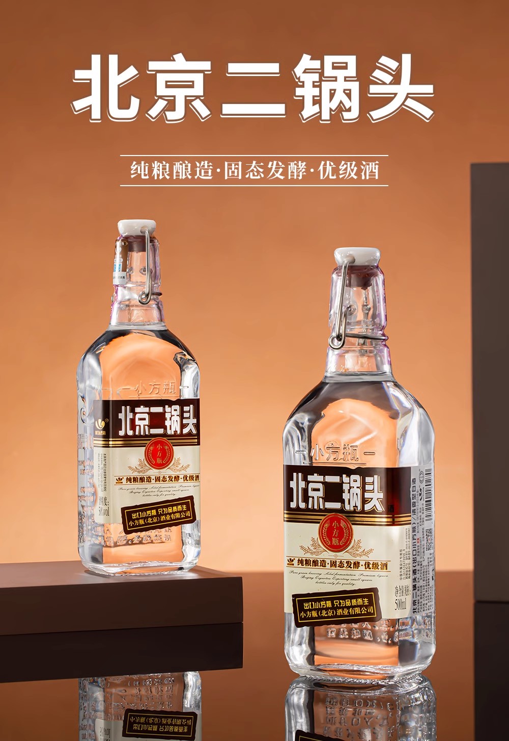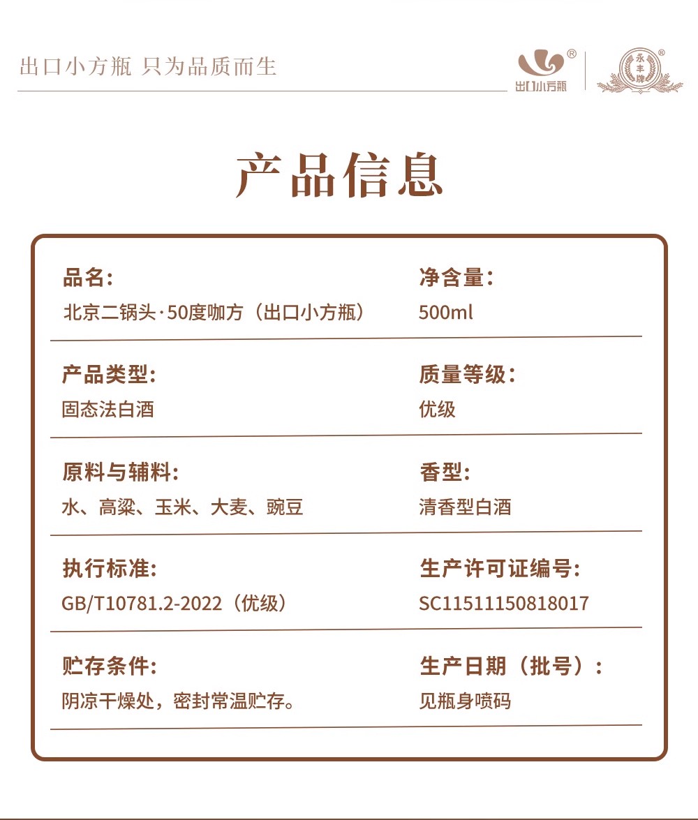 北京二锅头出口小方瓶咖方50度清香型白酒500ml高度酒
