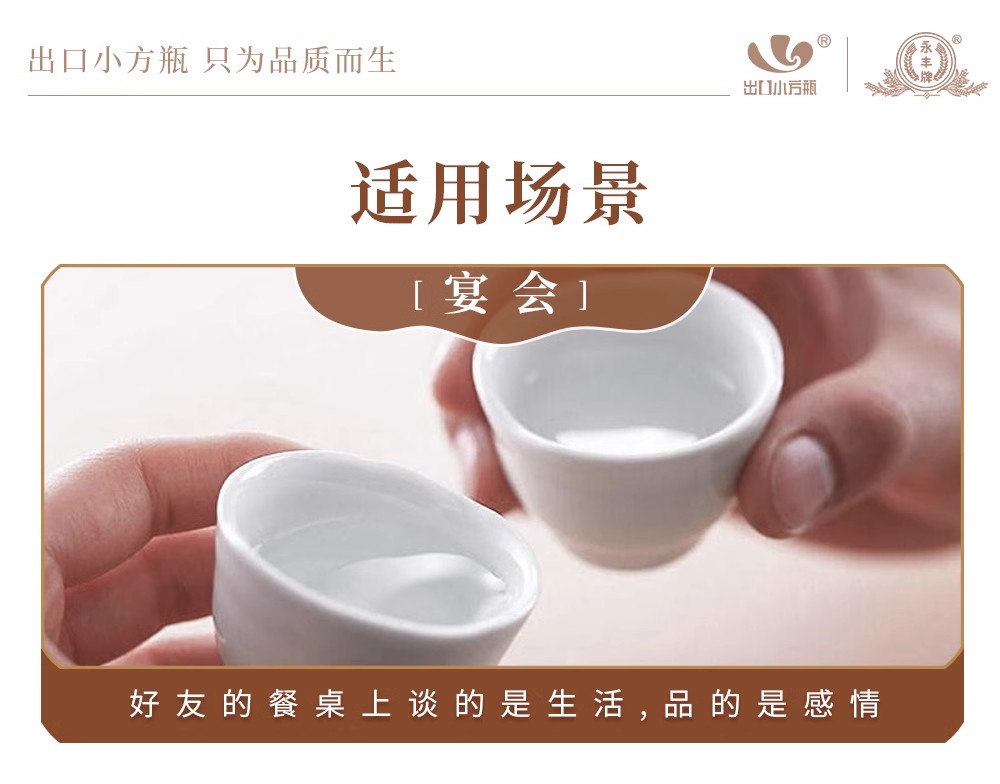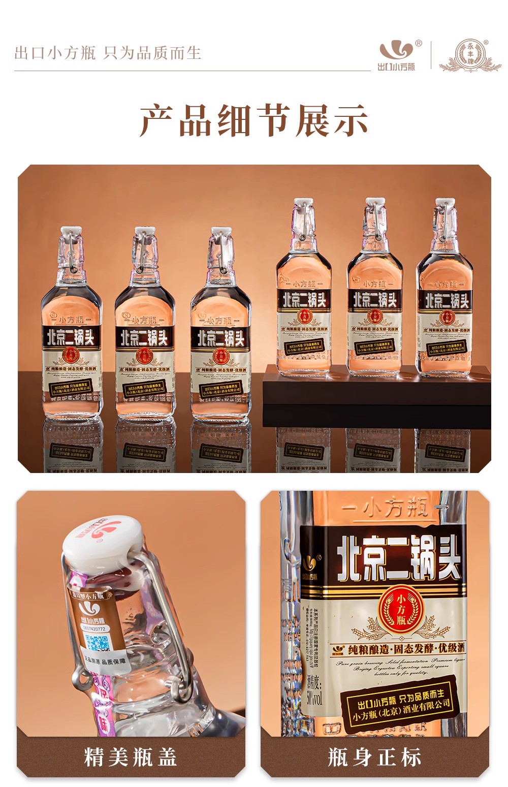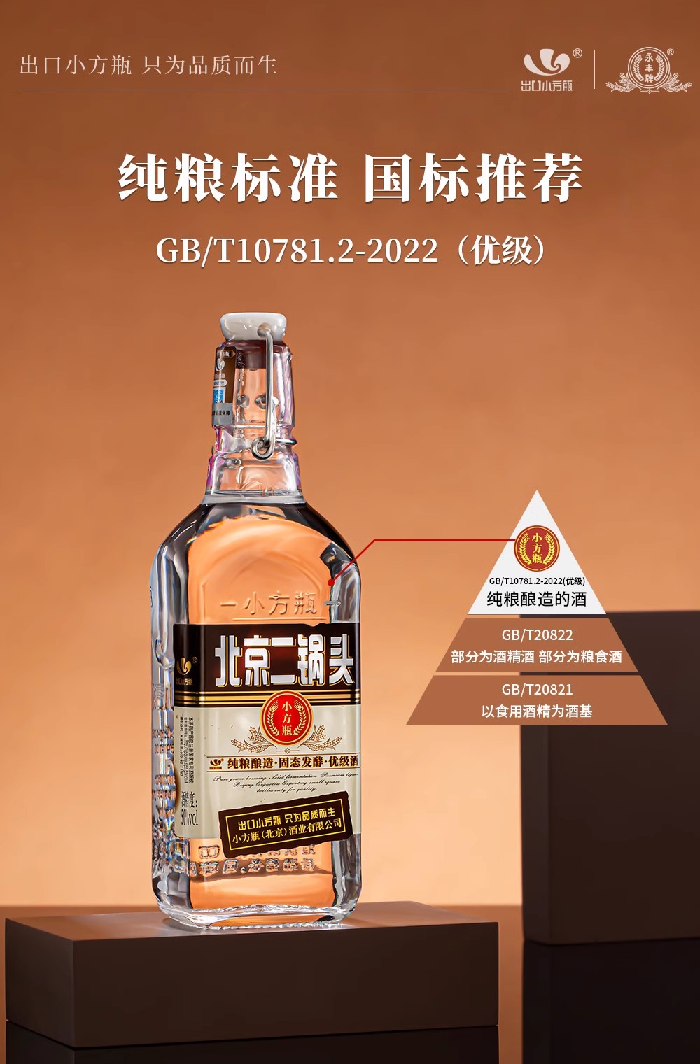 小方瓶(北京)酒业有限公司是一家以生产销售纯粮酿造白酒的公司。其名下的出口小方瓶系列产品以独特的外观造型、普适口感和纯粮品质为众多消费者所称道。四大核心品质:纯精酿;入口甘;不上头;醒酒快!