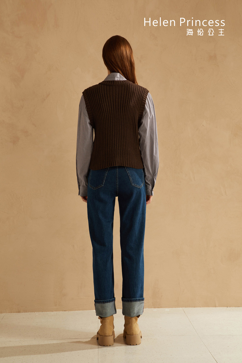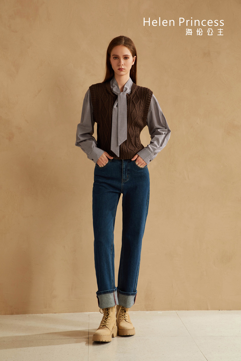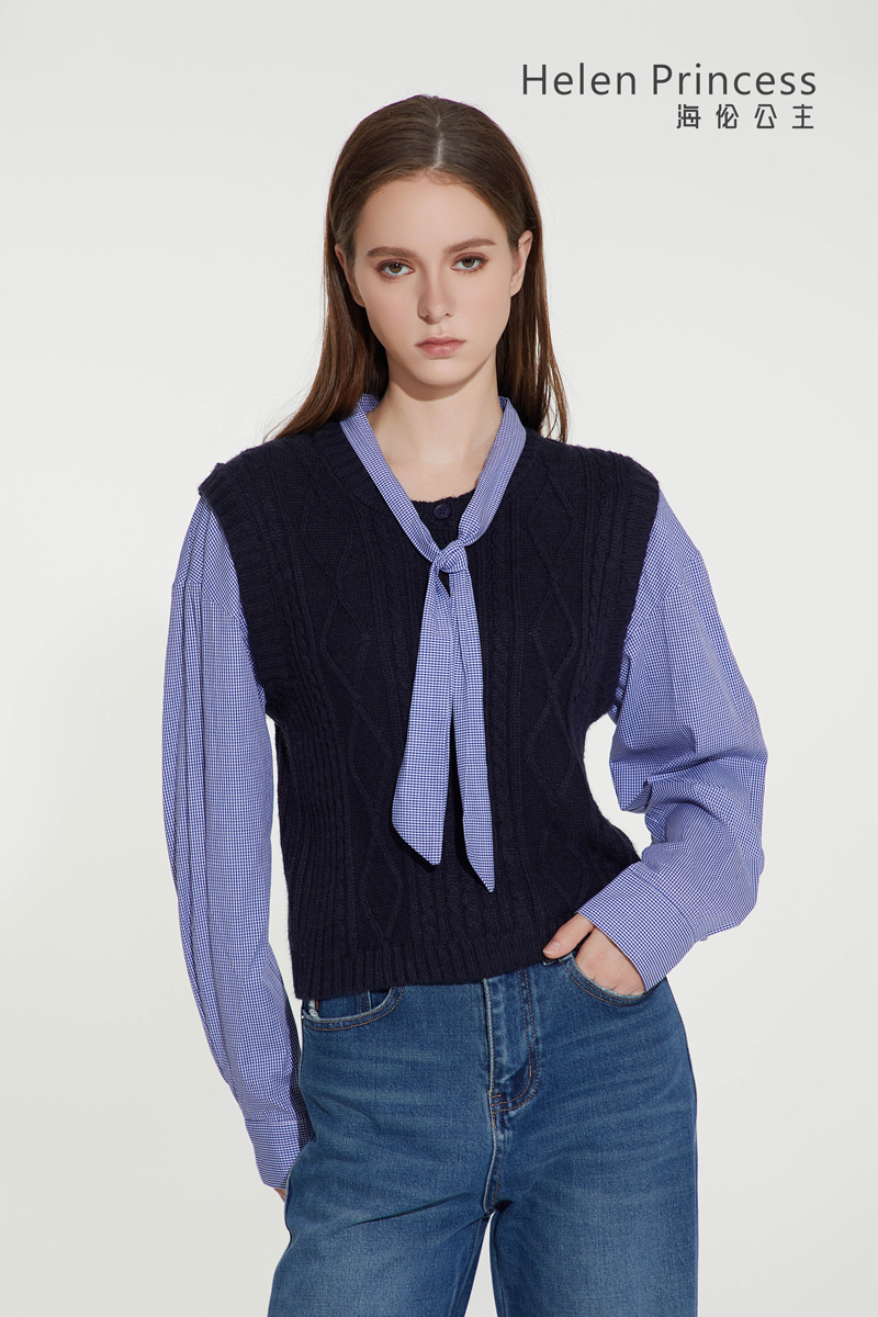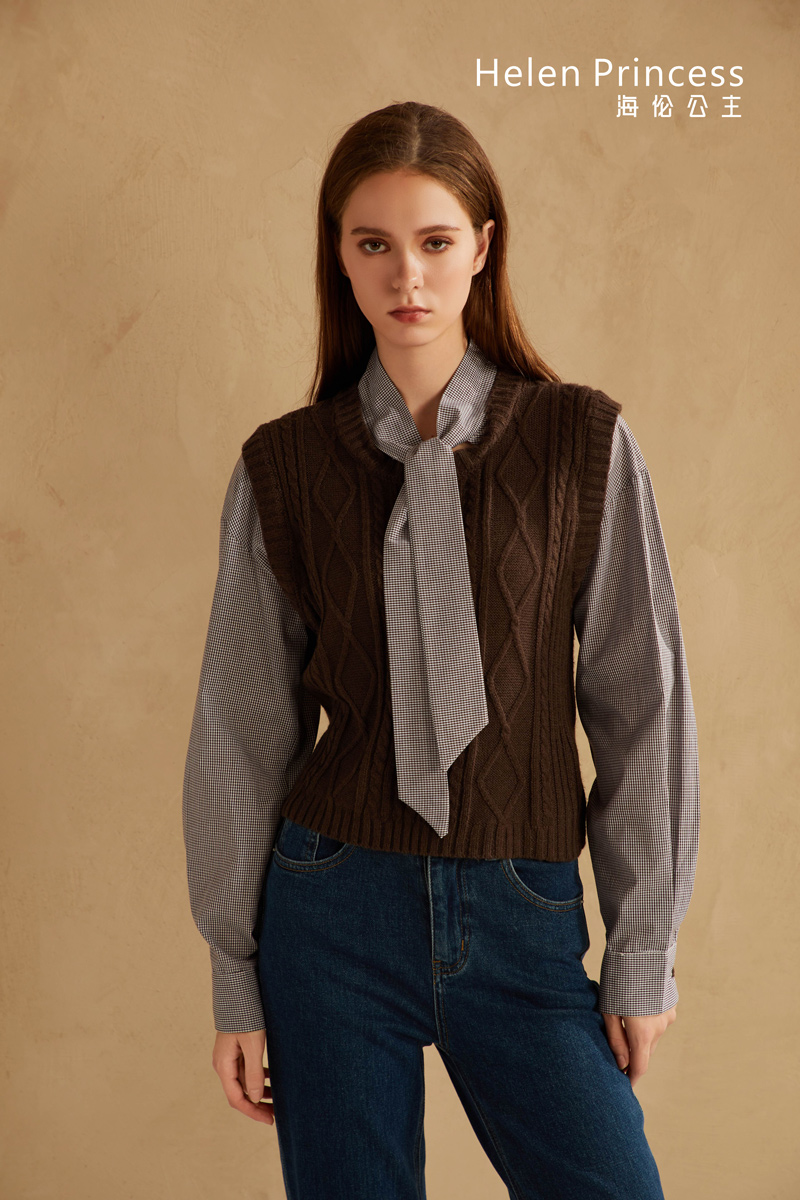 假两件设计层次丰富又时髦。针织马甲搭配系带衬衫,彰显复古格调。