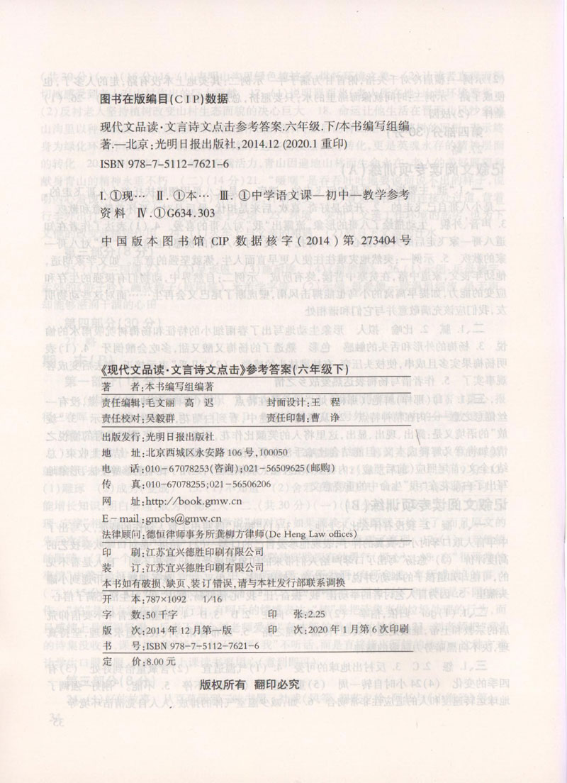 现货2020年新版 6年级下/六年级下册 第二学期 现代文品读·文言诗文点击 附:单元测试 解题思路 参考答案 上海二期课改语文教材