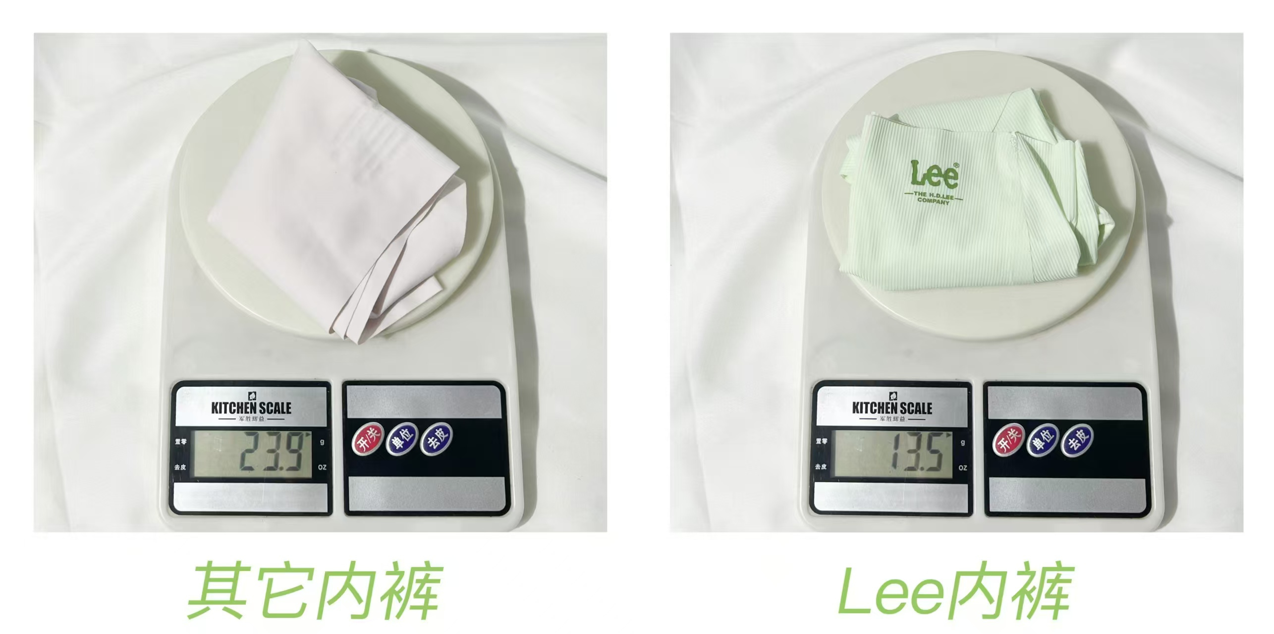 这是Lee为了夏季专门打造的轻薄冰丝面料 把它和其他凉感内裤放一起对比 Lee的重量居然只有13.5g!更轻无负担!