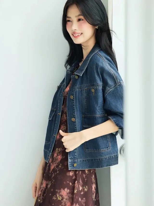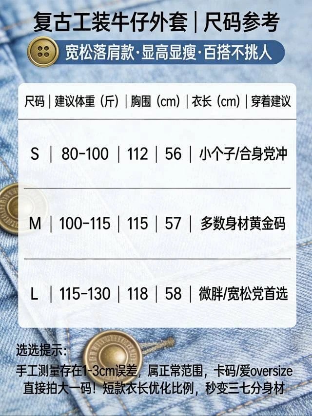 ✅重工的磨砂水洗工艺很有复古感,做旧五金纽扣配明线拼接,质感高级,上身洋气有型