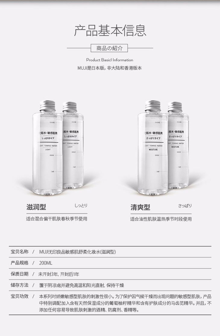 MUJI/无印良品 敏感肌用化妆水滋润型 200ml+乳液清爽型 200mlJPY带授权招加盟代理