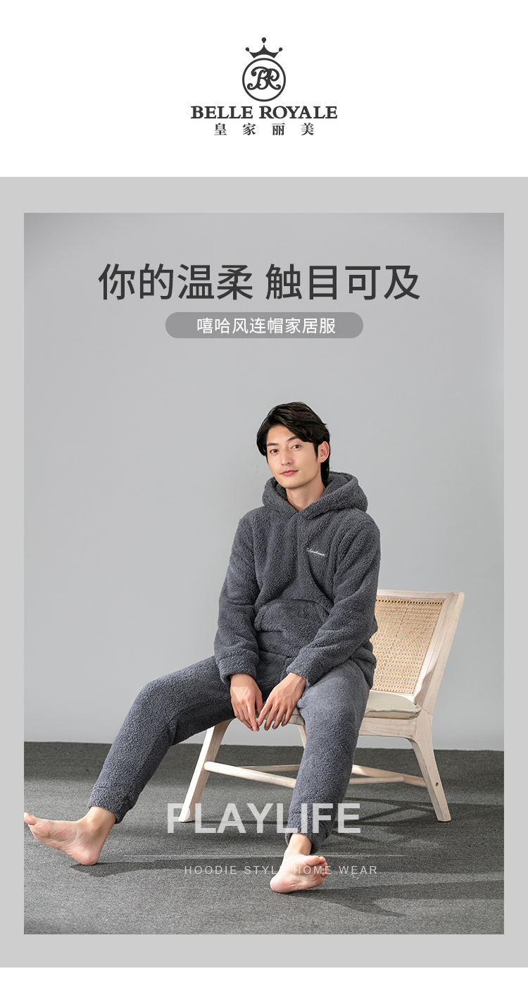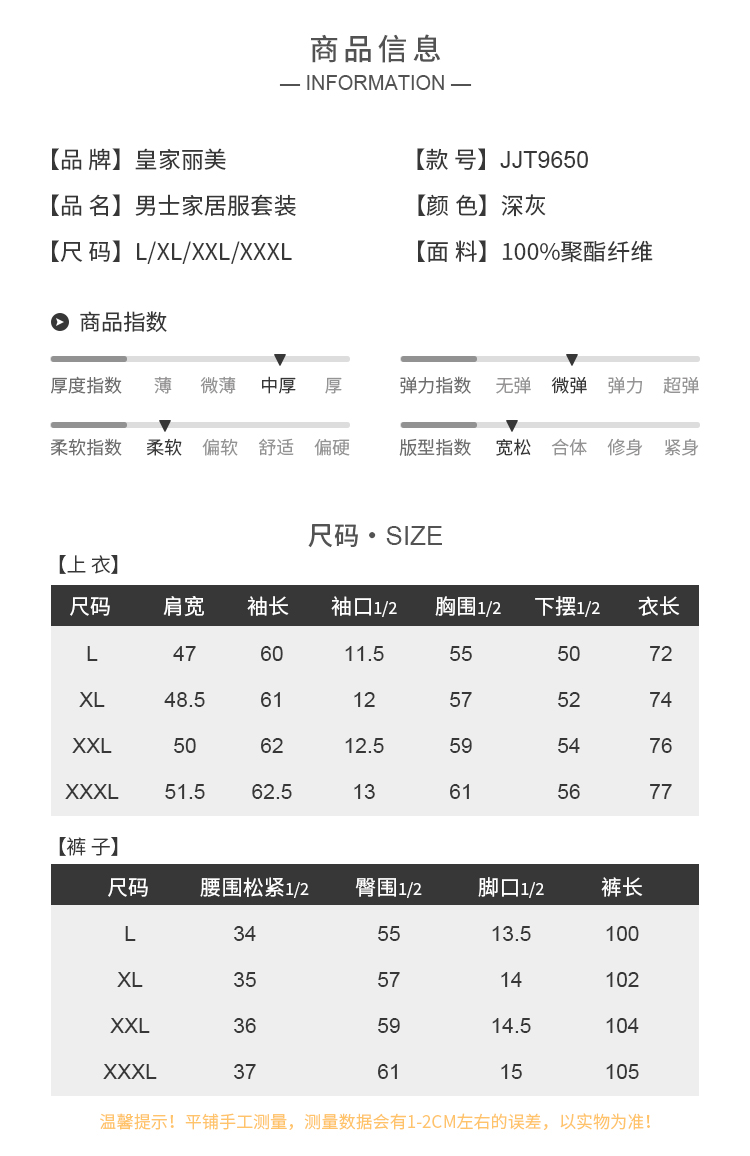 皇家丽美中厚款微弹力柔软舒适吸湿排汗宽松男士套头套装家居服JJT9650