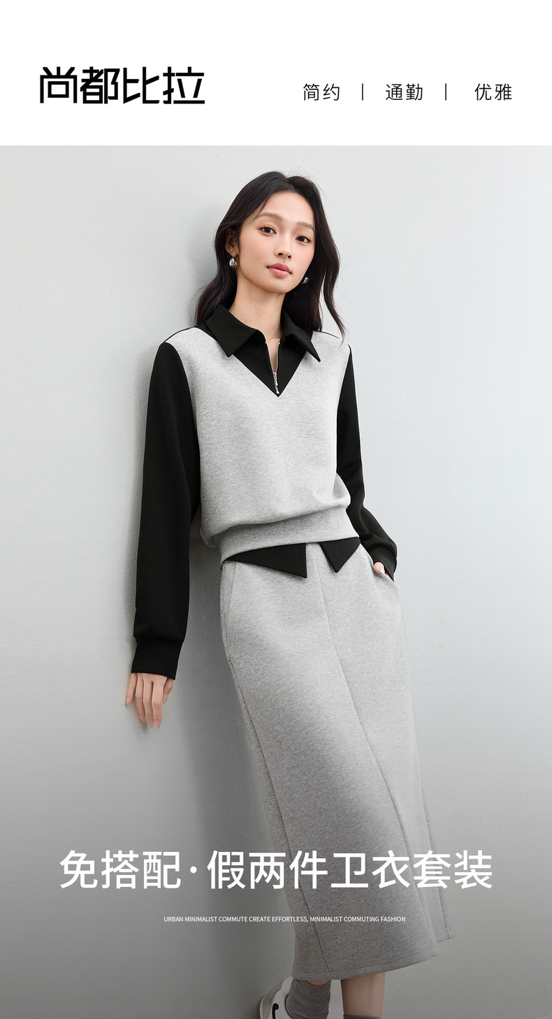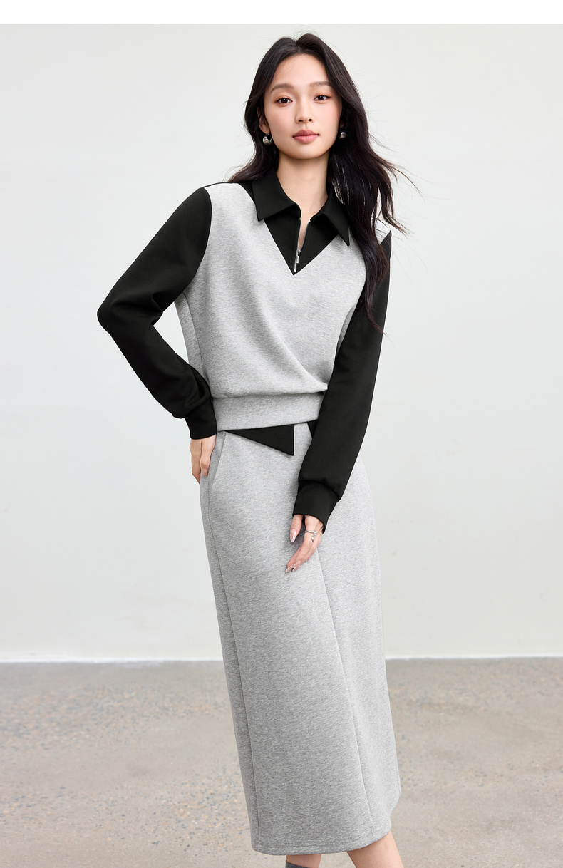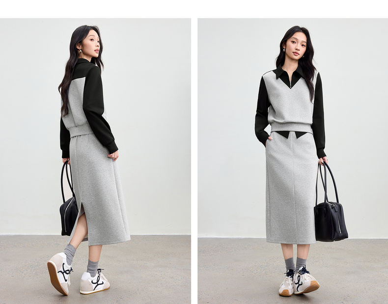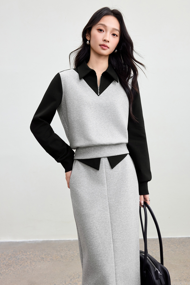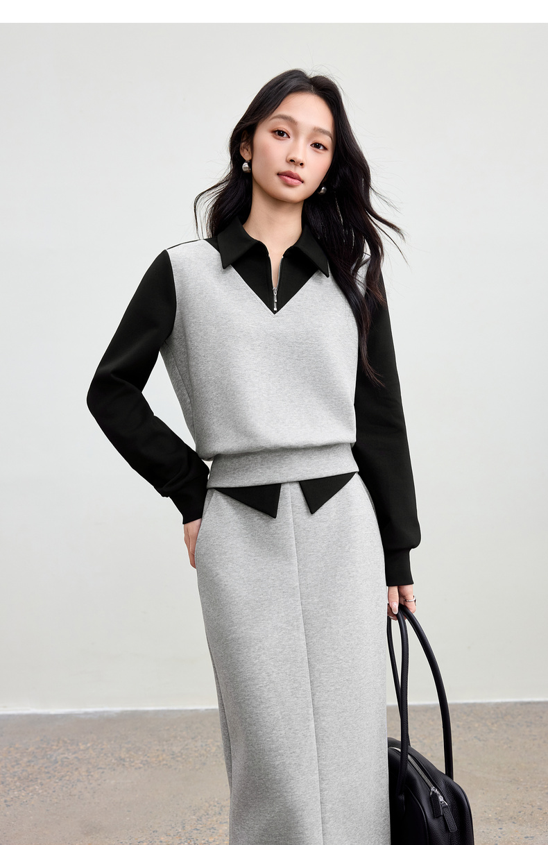 【内购】【免搭配套装】撞色假两件翻领针织卫衣&松紧腰下摆开叉A字半身裙-153ZH2416