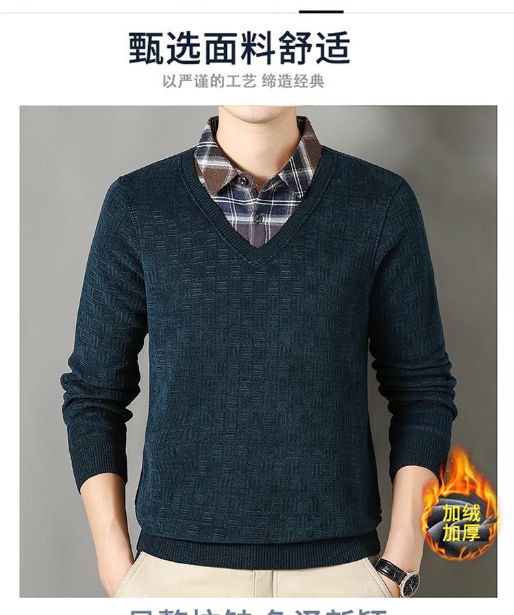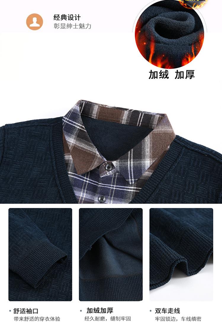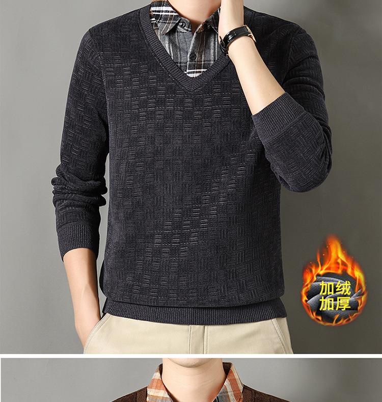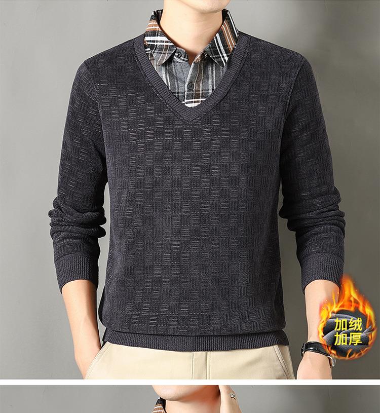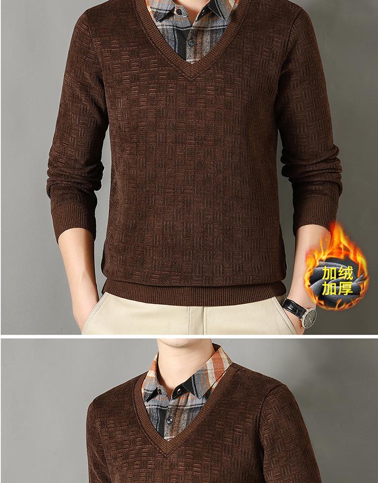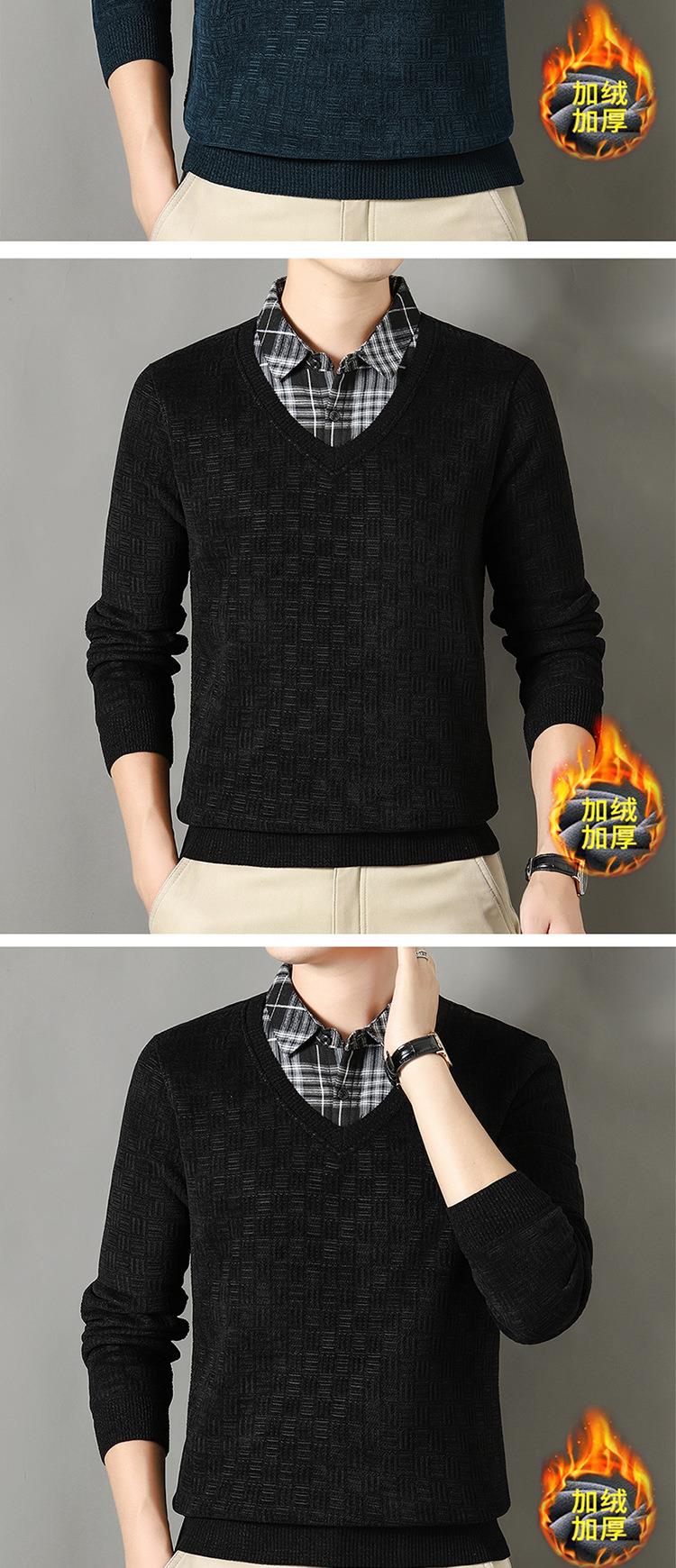 麻将格加绒加厚假两件长袖打底衫男士秋冬季新款毛衣