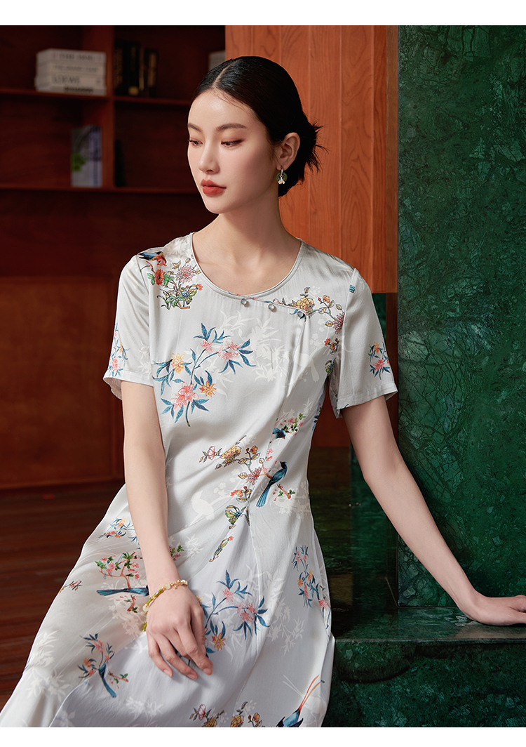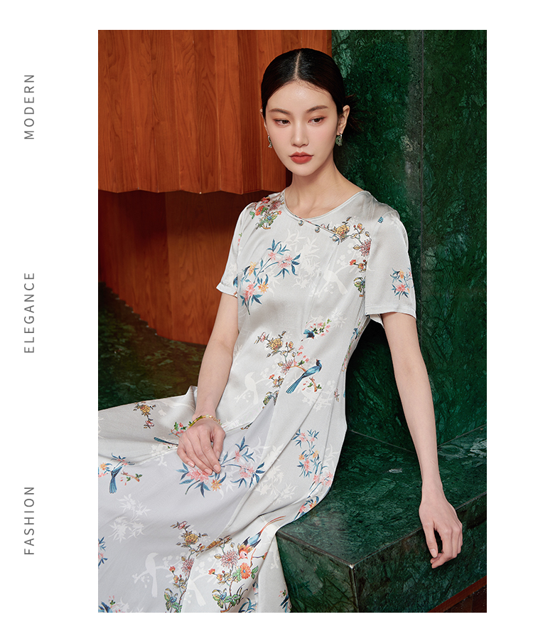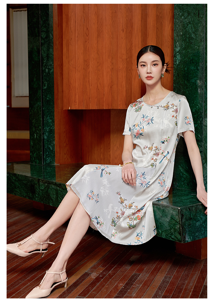 佐尔美夏季新款 桑蚕丝真丝提花缎中袖连衣裙女E22LS54