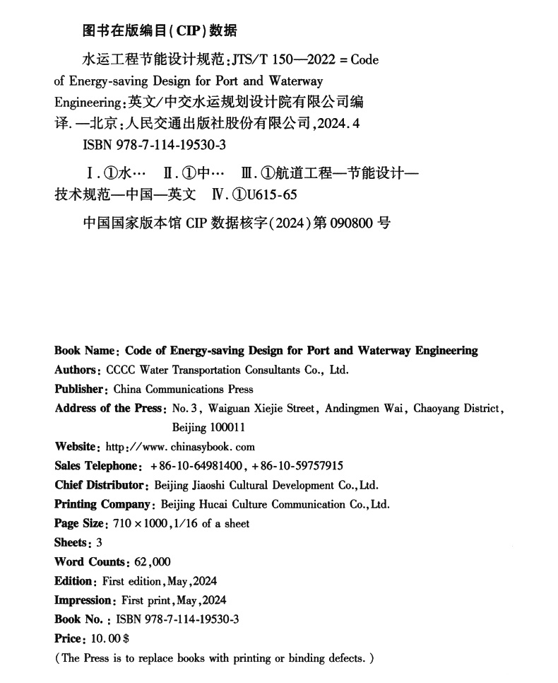 书名:Code of Energy-saving Design for Port and Waterway Engineering 水运工程节能设计规范(JTS/T 150—2022)英文版