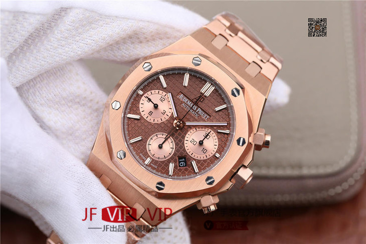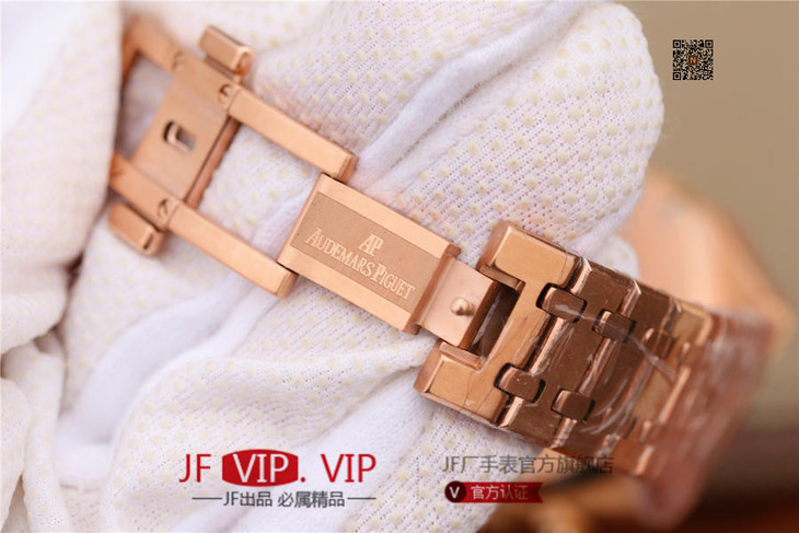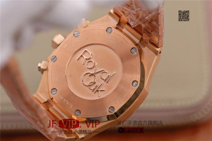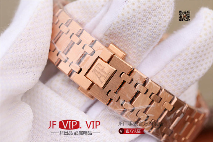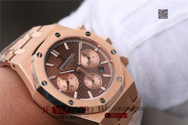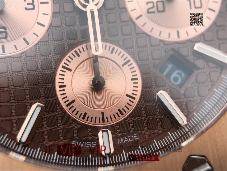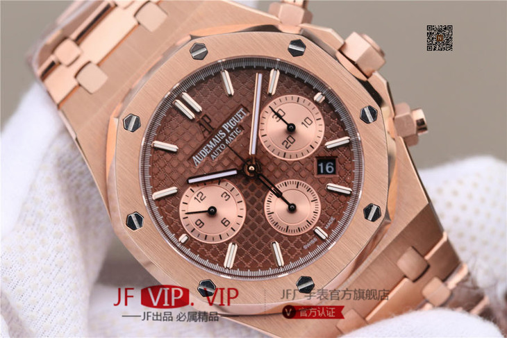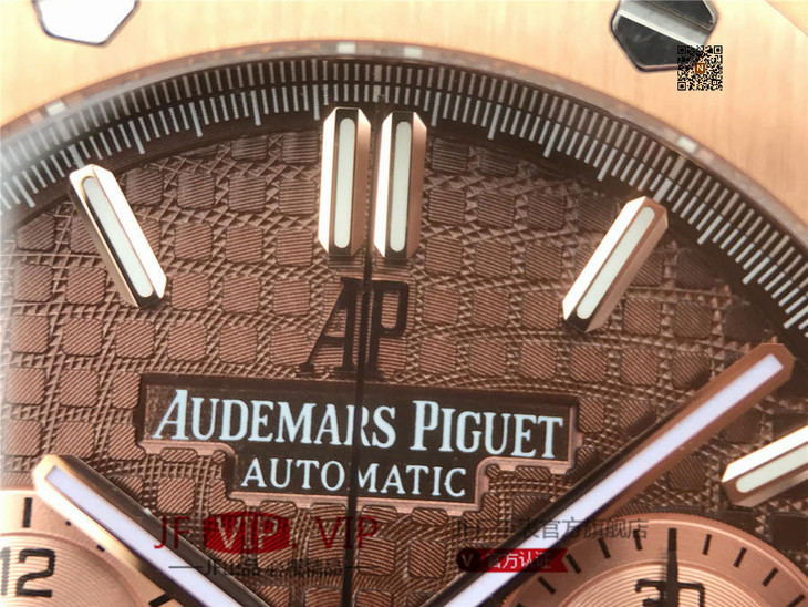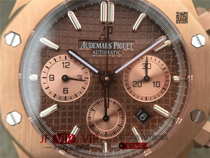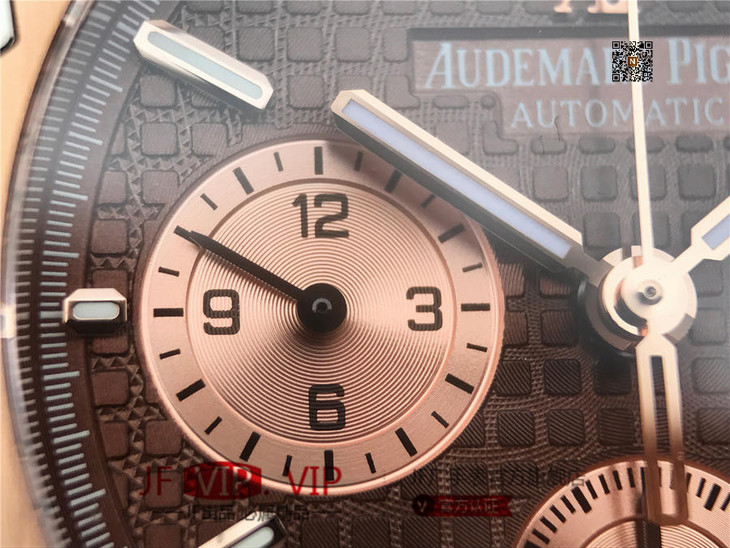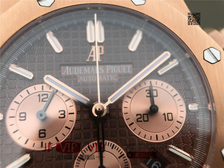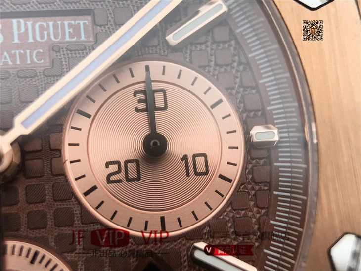 表盘材质:镌刻“Grande Tapisserie”大格纹装饰,玫瑰金色副表盘,搭配玫瑰金荧光立体时标和皇家橡树指针