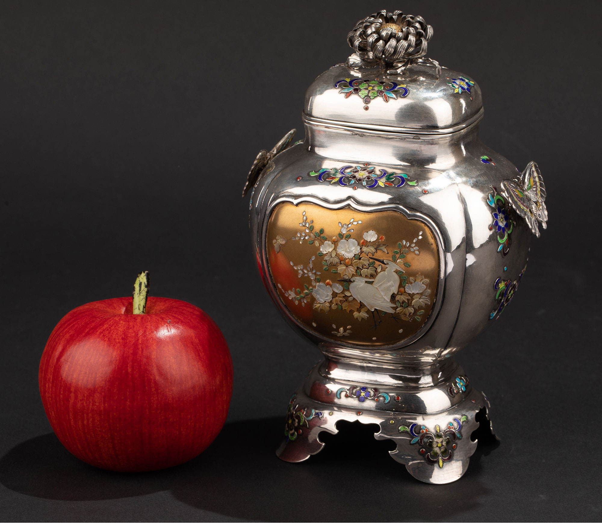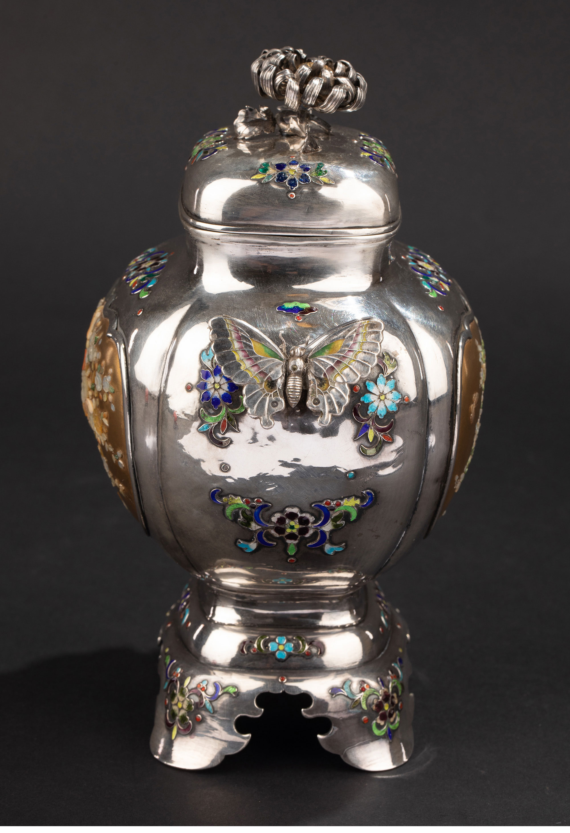 独角鹿西洋古董 20世纪初日本明治时期出品「清供花鸟」主题芝山银镶嵌蝴蝶耳付菊钮珐琅彩绘香炉