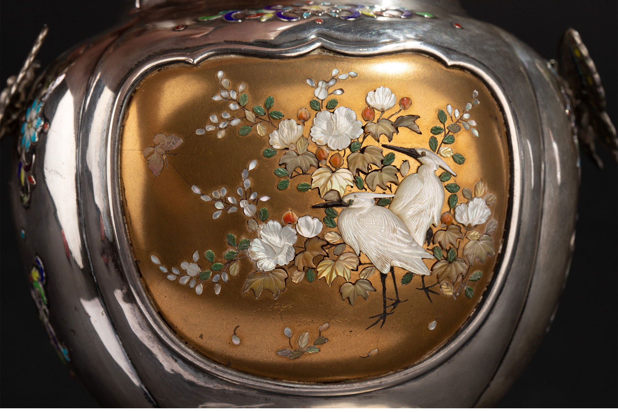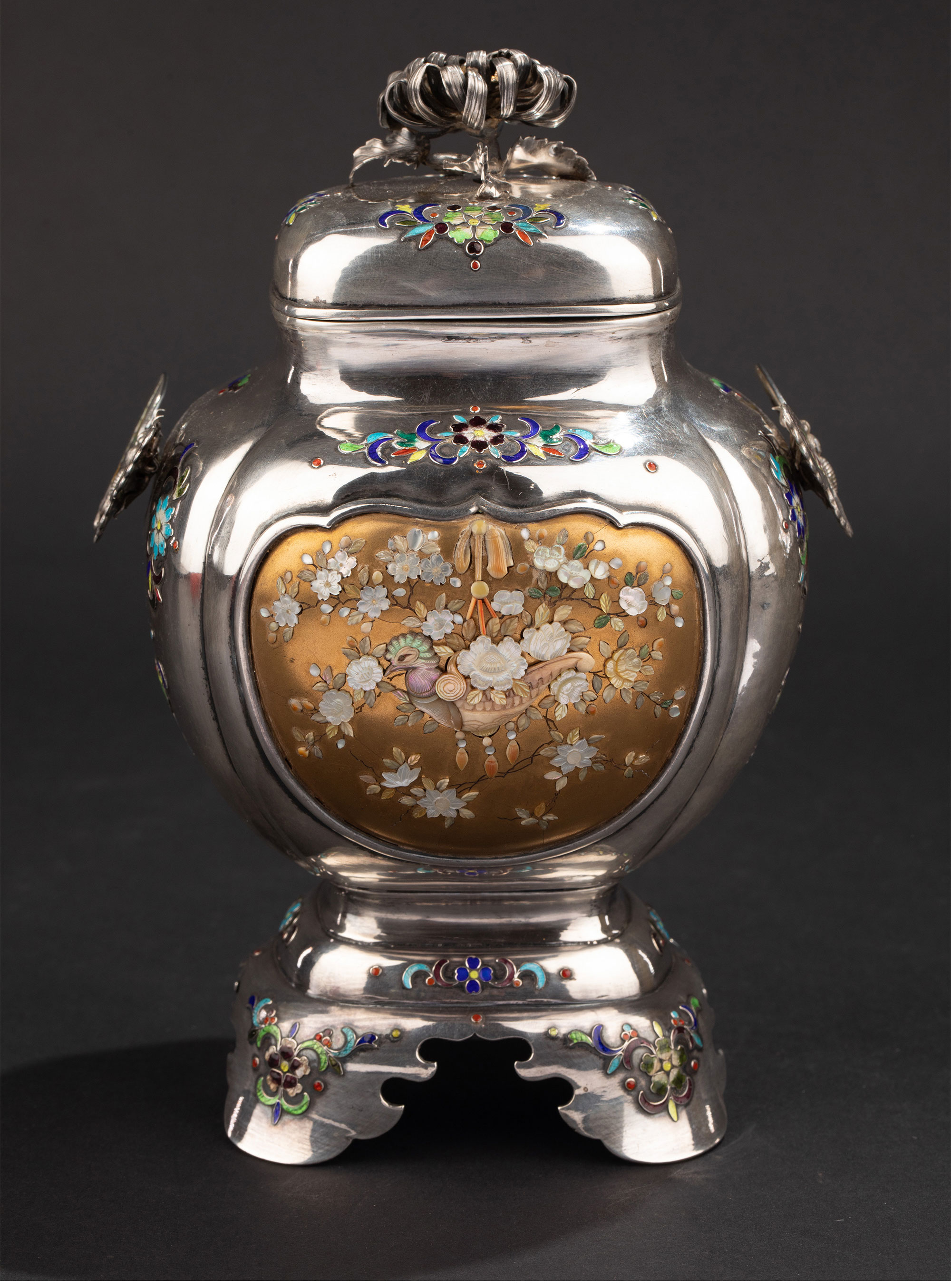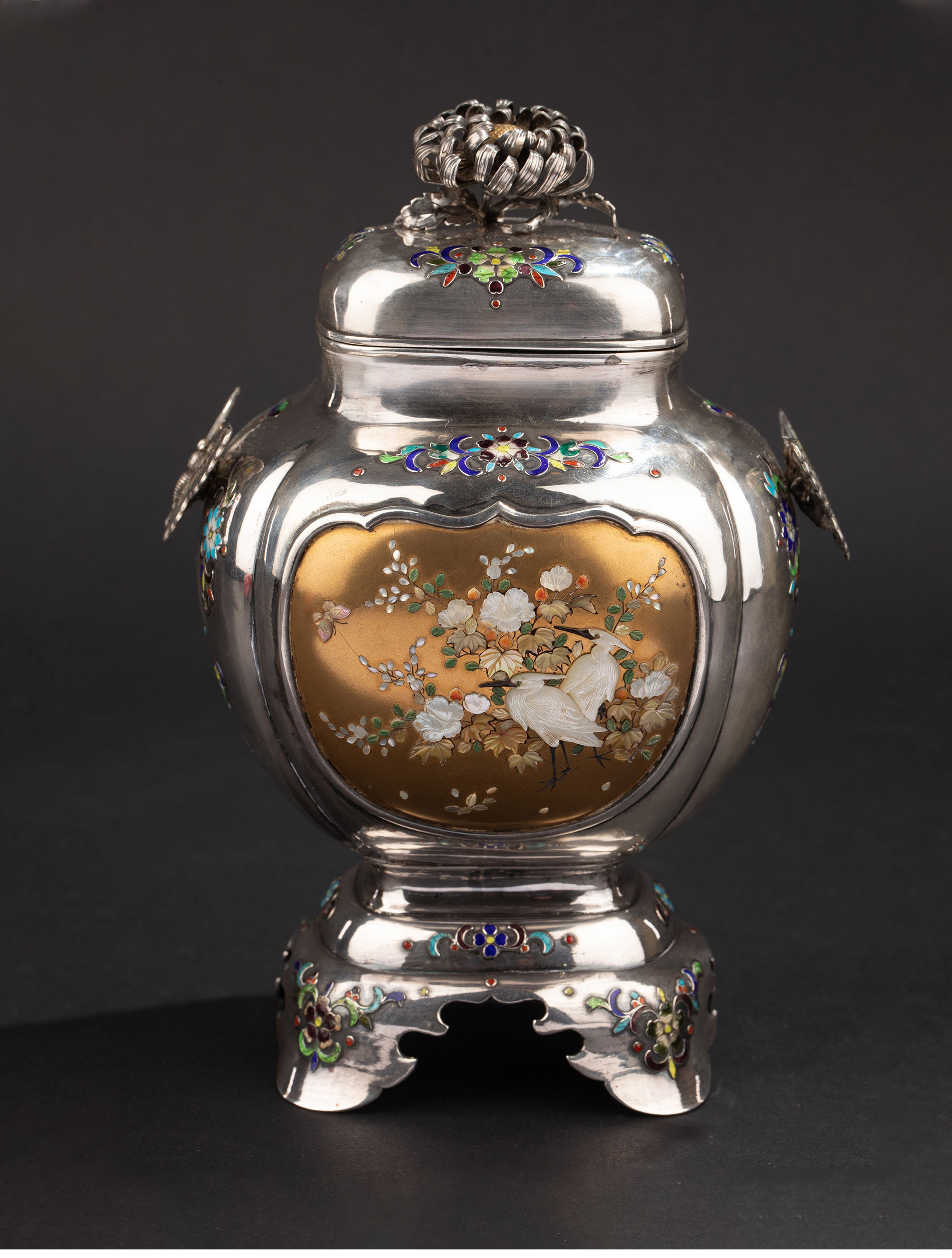 20世纪初日本明治时期出品「清供花鸟」主题芝山银镶嵌蝴蝶耳付菊钮珐琅彩绘香炉