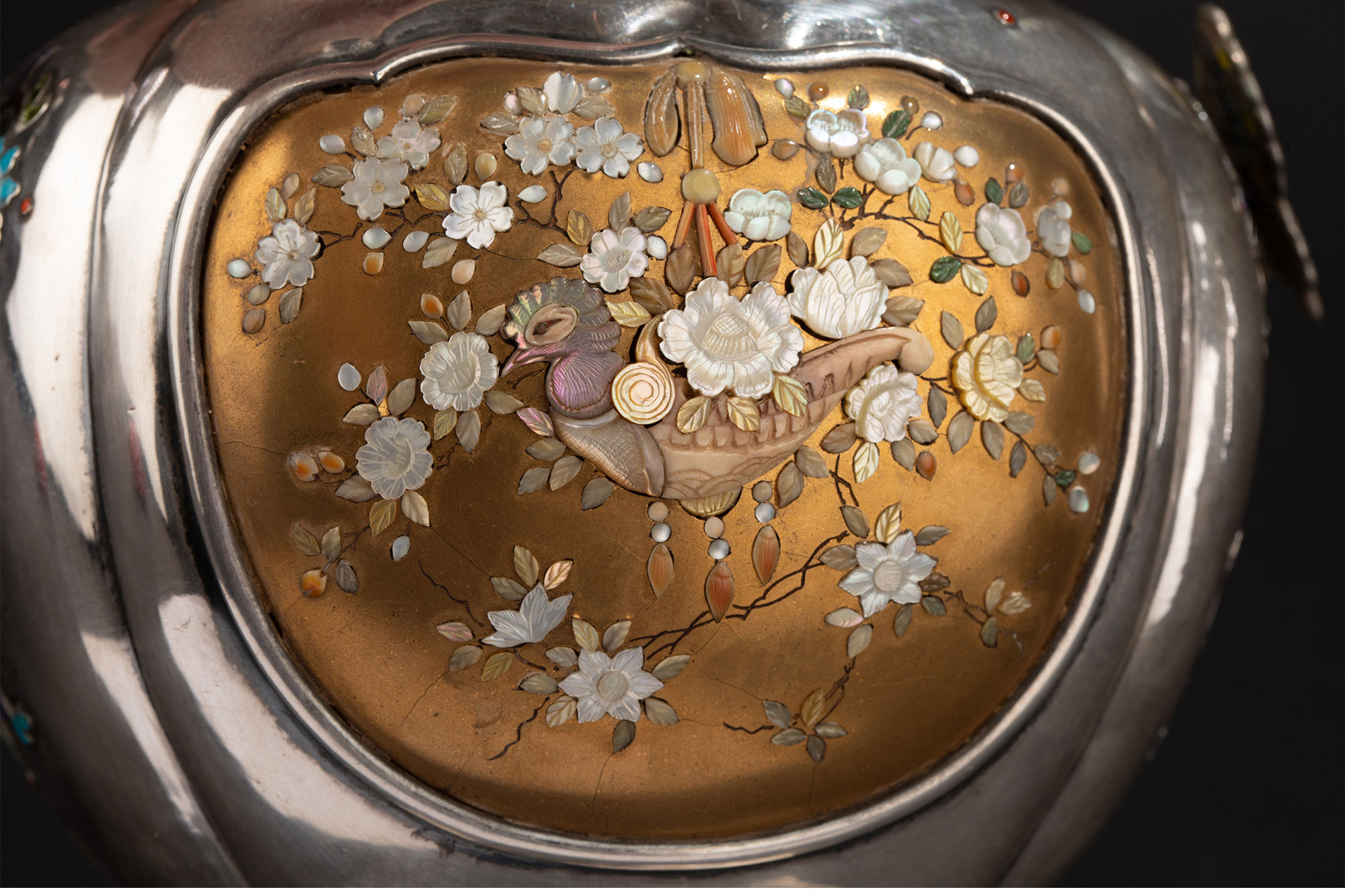 材质:银,金漆,母贝,珐琅,玉石,天然材质