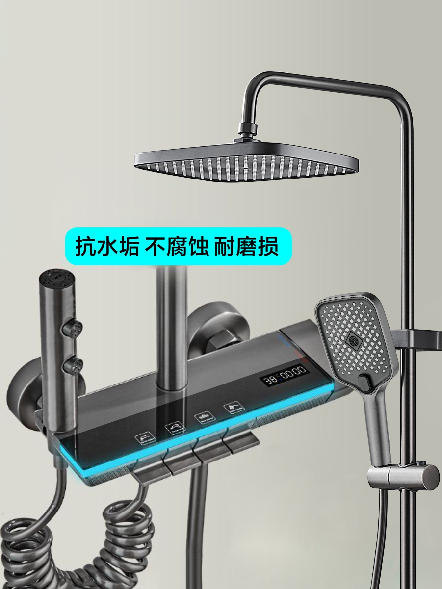 7707智能数显铜体氛围灯花洒-水镀拉丝枪灰