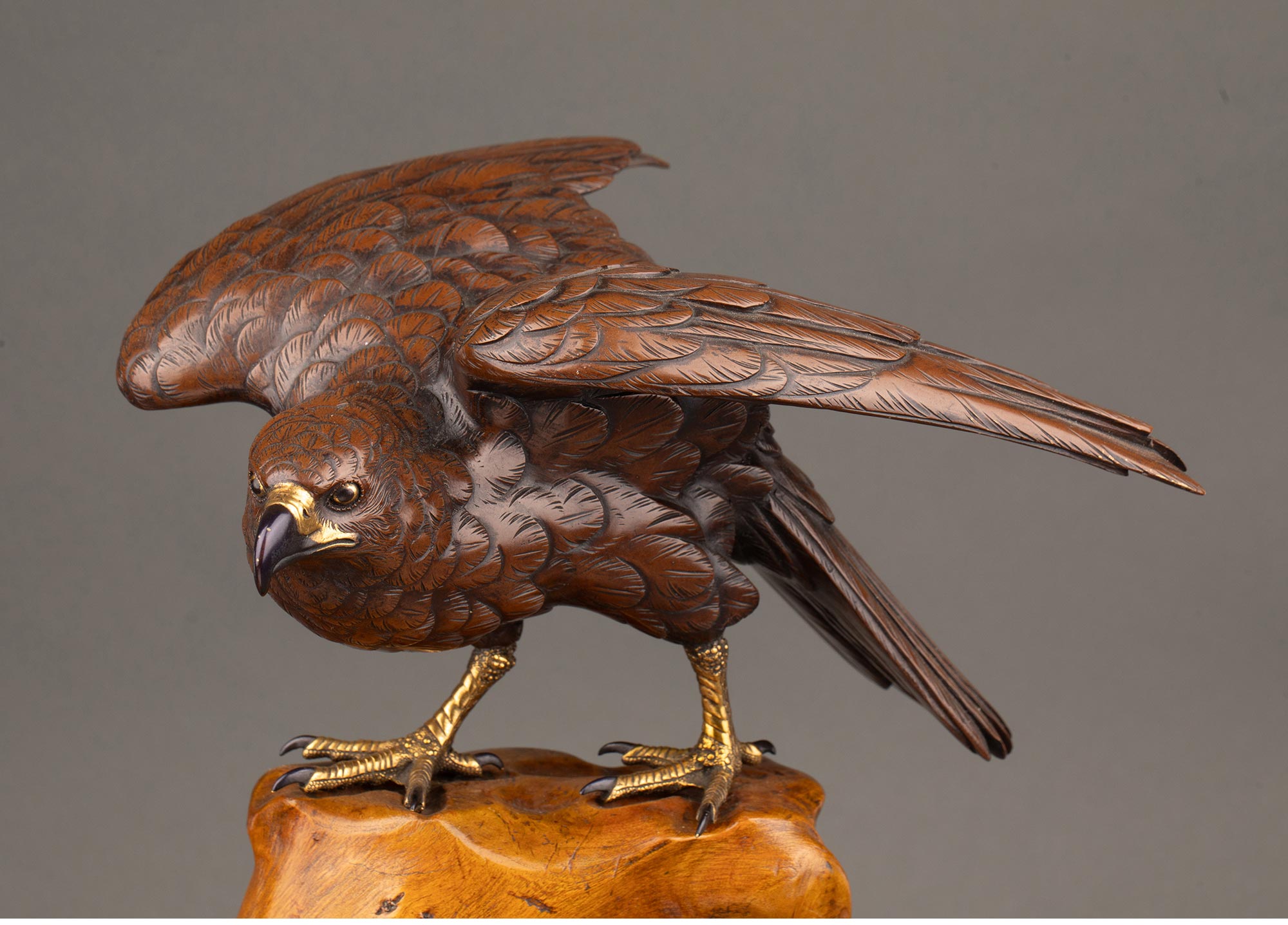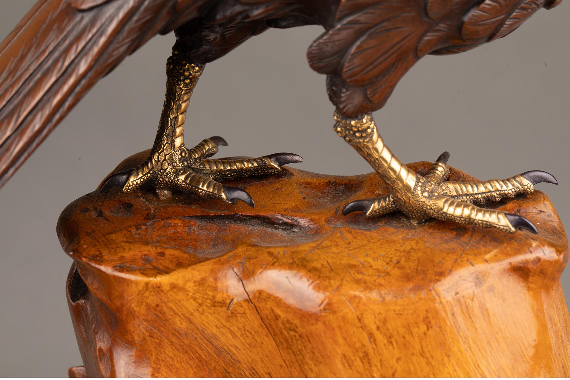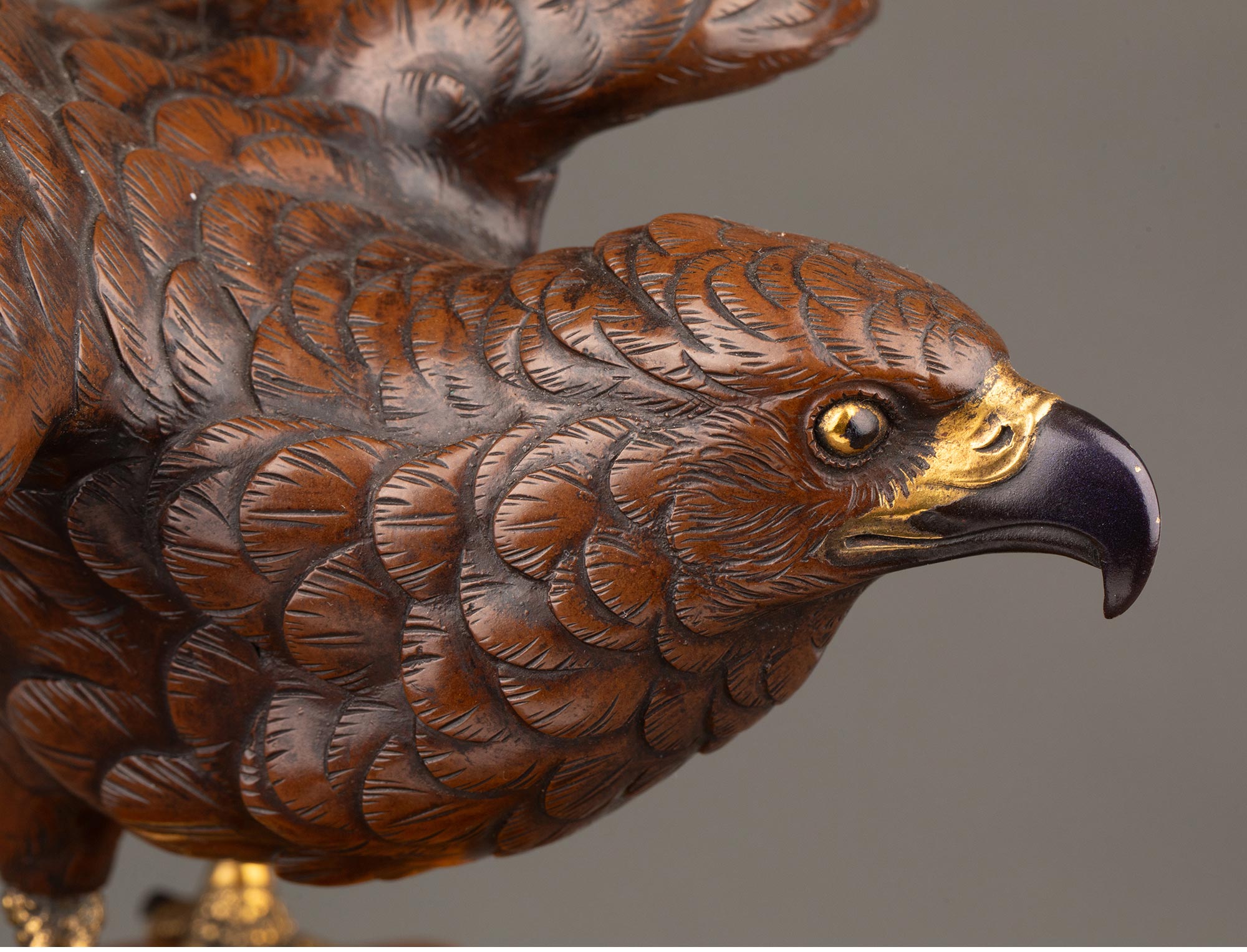 1890年代日本明治时期出品硬木底座装饰雄鹰造型镀金赤铜雕塑