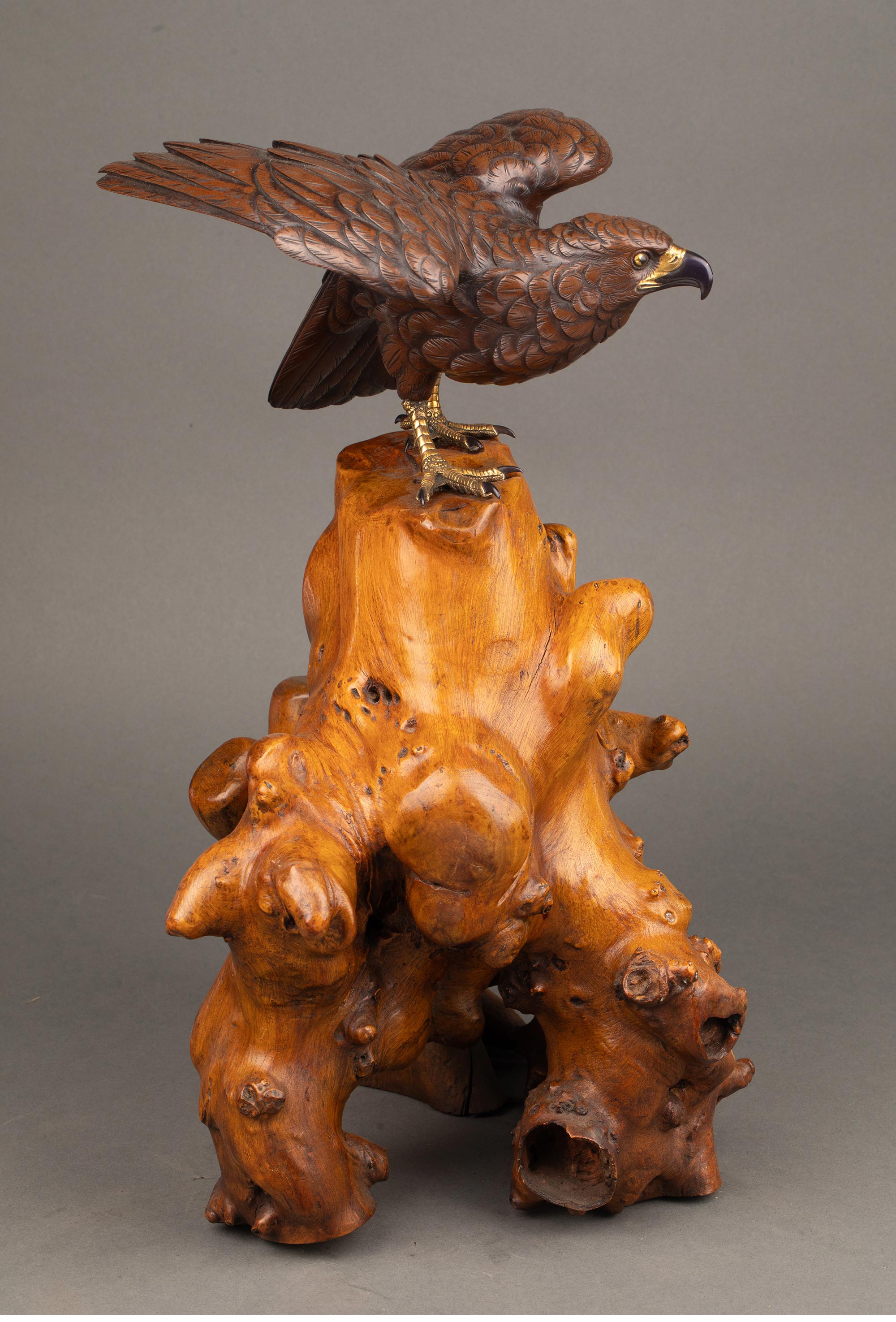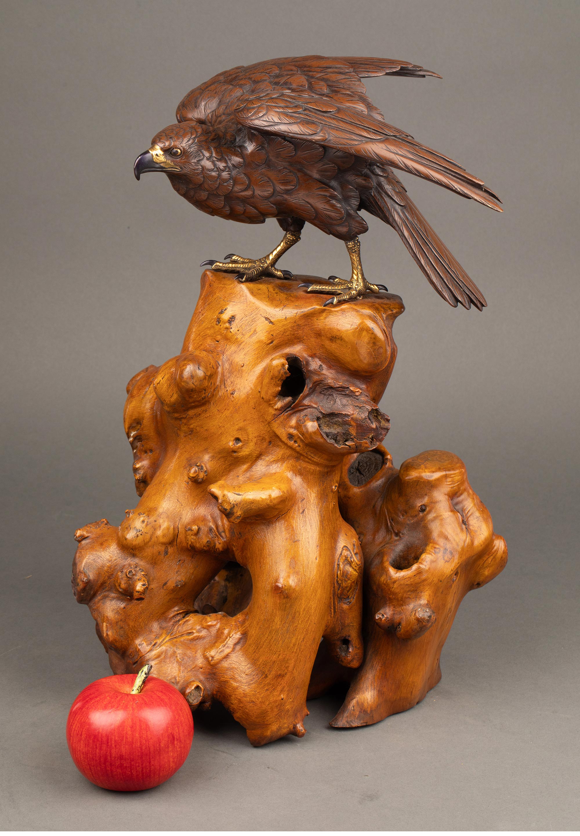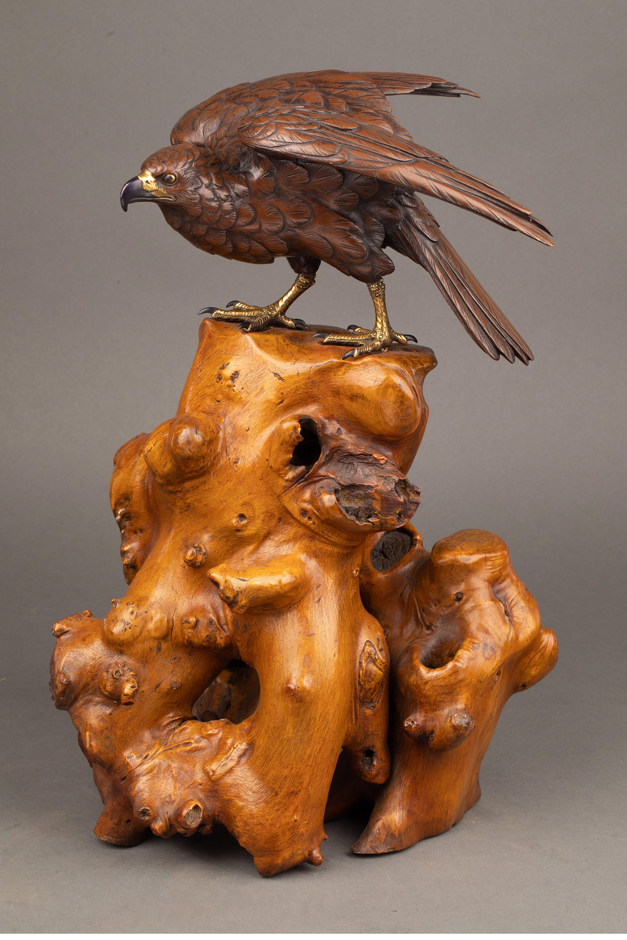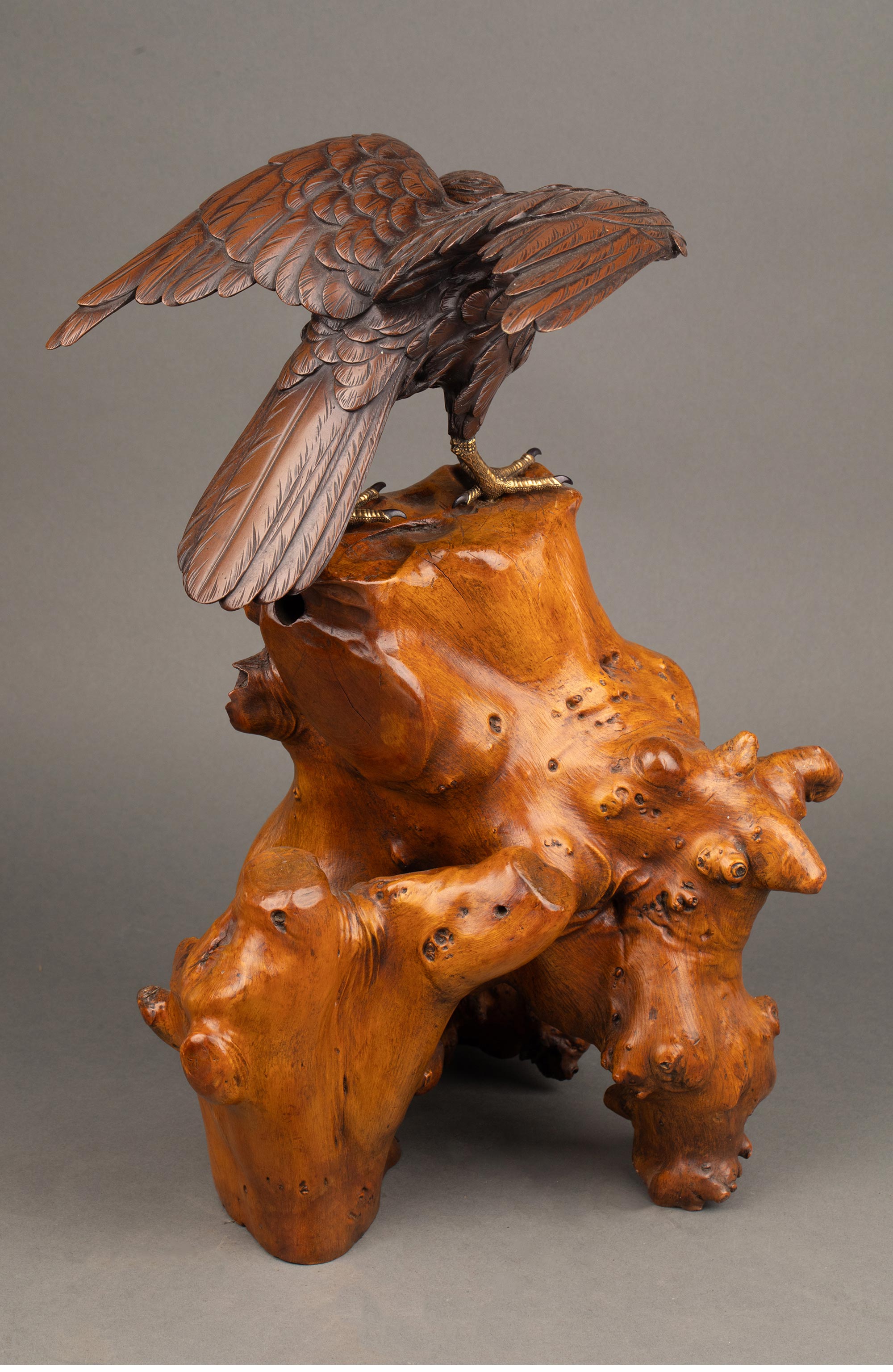 1890年代日本明治时期出品硬木底座装饰雄鹰造型镀金赤铜雕塑