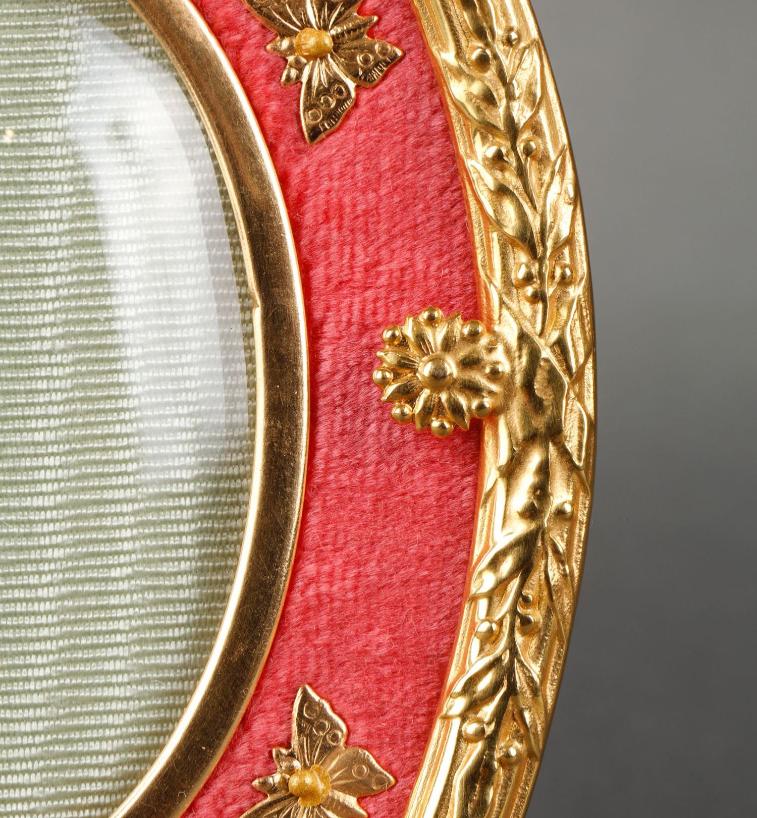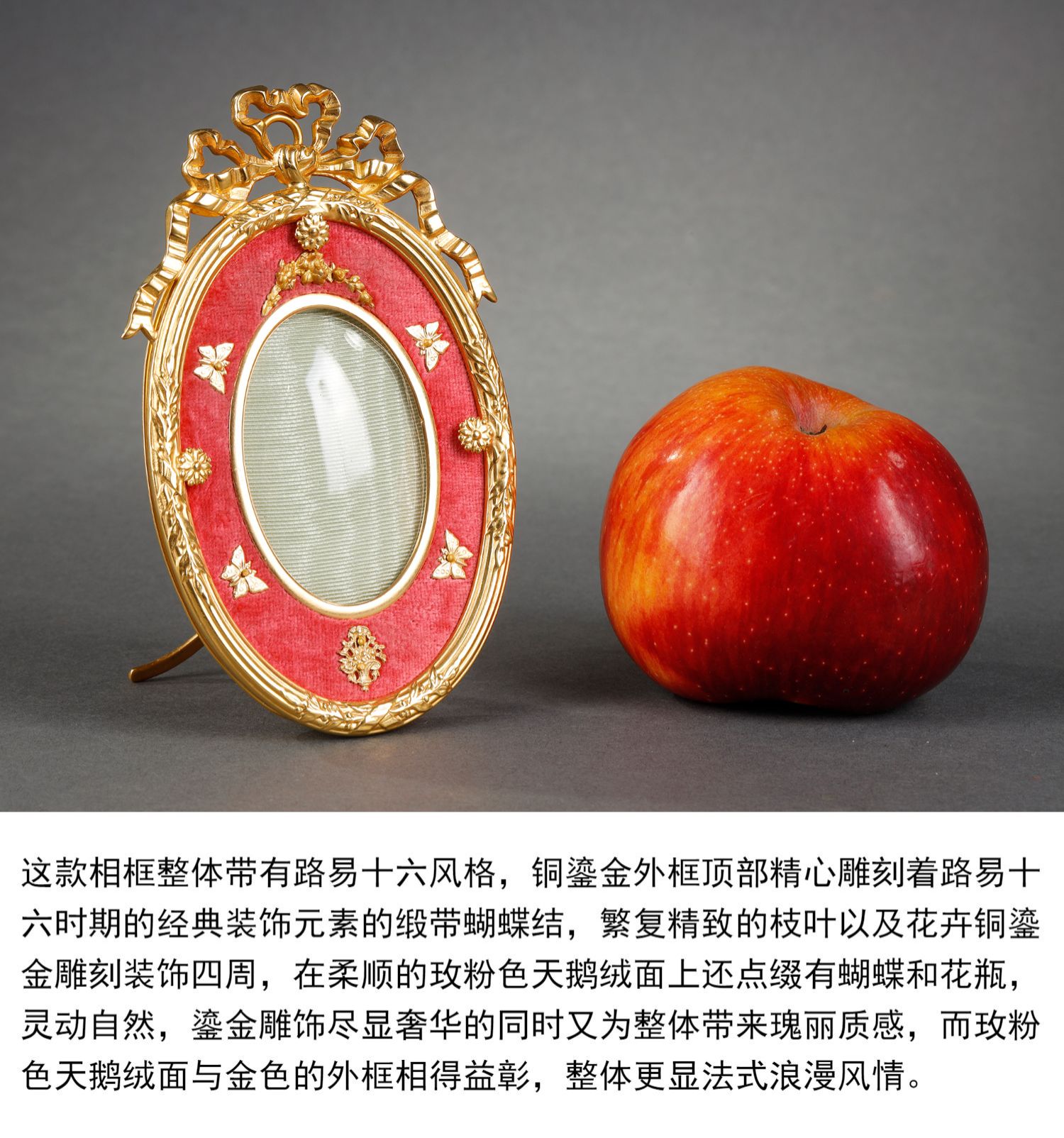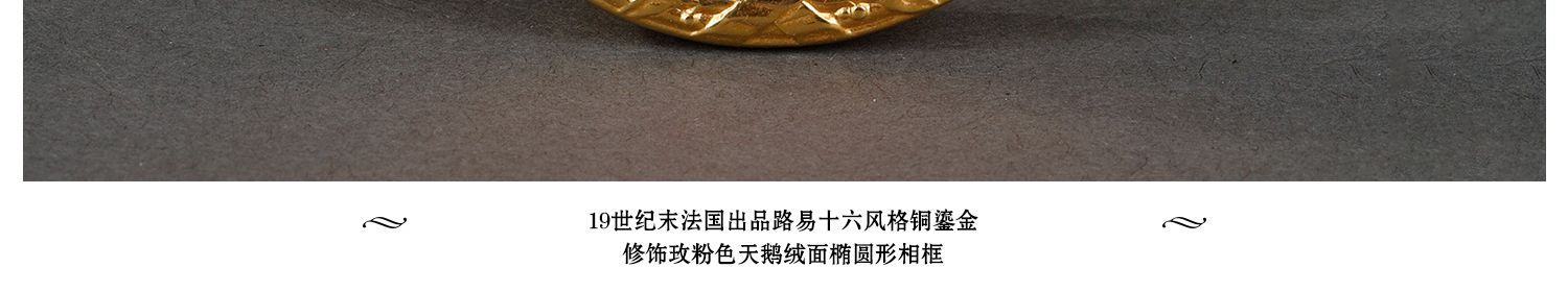 独角鹿西洋古董路易十六风格铜鎏金修饰玫粉色天鹅绒面椭圆形相框