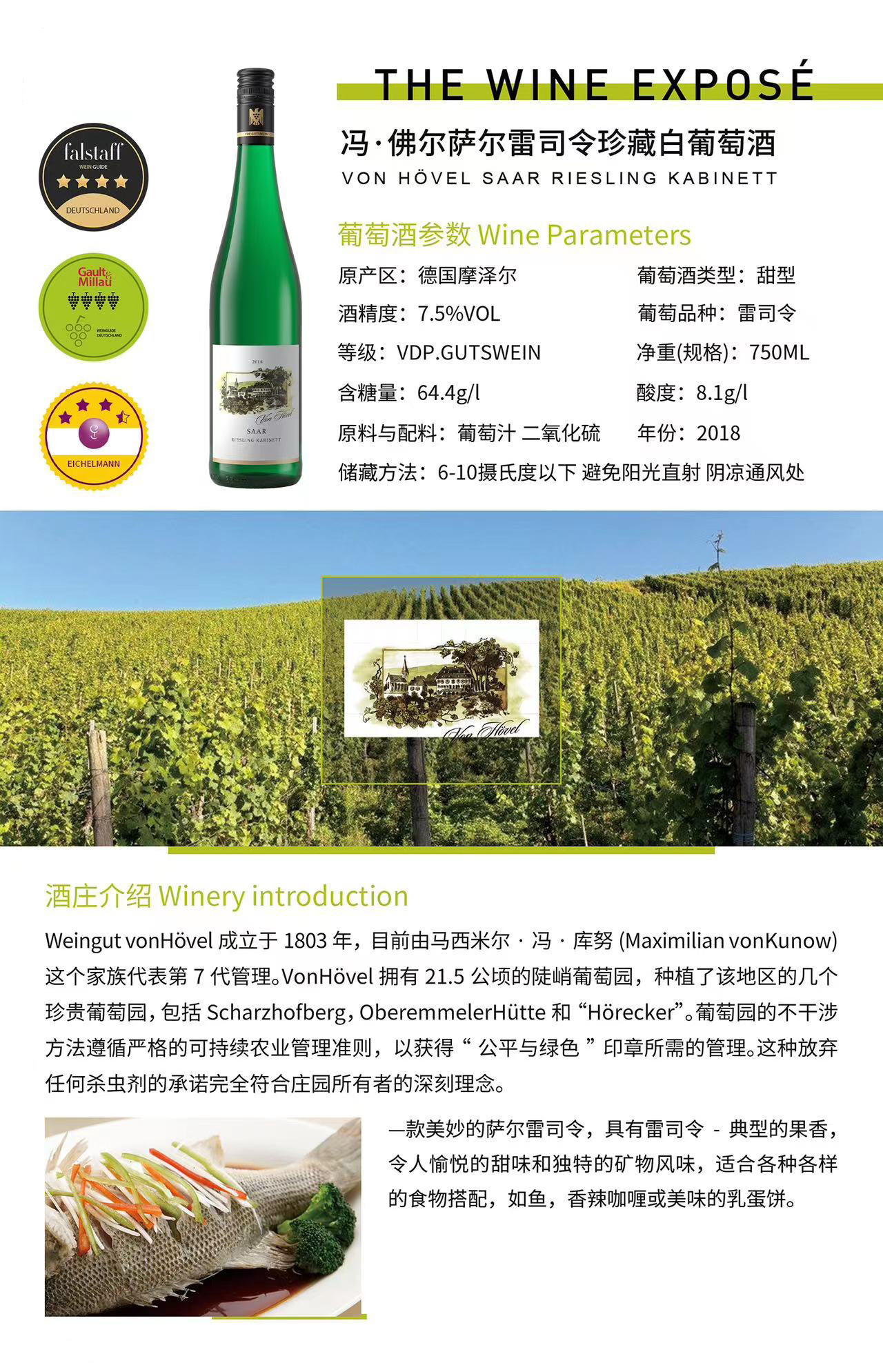 冯佛尔萨尔雷司令珍藏白葡萄酒 2019 Von Hövel Saar Riesling Kabinett
