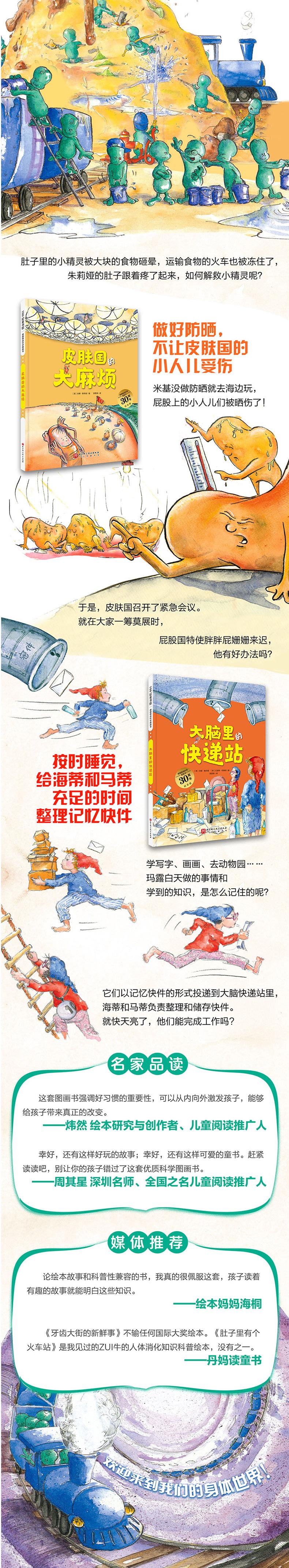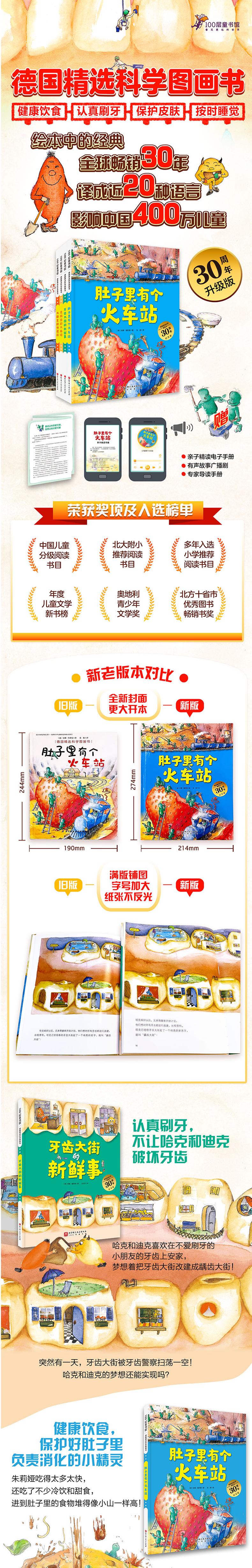 【开本升级】图书尺寸由190mm*244mm扩大为214mm*274mm,带来更佳阅读体验 【赠品升级】1.有声故事广播剧 2.实用精读电子手册 3.专家导读手册 ★绘本中的经典,靠前30年,译成近20种语言,中国400万妈妈共同选择 ★荣获奖项及入选榜单: 【中国儿童分级阅读书目】 【北大附小推荐阅读书目】 【小学推荐阅读书目】 【年度儿童文学新书榜】 【奥地利青少年文学奖】 【北方十省市优秀图书畅销书奖】 ★让孩子健康饮食的神奇科学绘本 ★结合童心和科学的经典之作,有趣有益,在富有想象力的故事,养成陪伴一生的好习惯! 《肚子里的火车站》想象出了一群帮助食物消化的小精灵,如果吃的太多太快,精灵们就会游行示威、罢工抗议,肚子里就会乱作一团。这本书就是这样,用孩子听得懂、感兴趣的方式,幽默诙谐的方法告诉他们消化是怎么回事,吃饭要慢慢嚼、嚼碎,少吃冷食、甜食……
