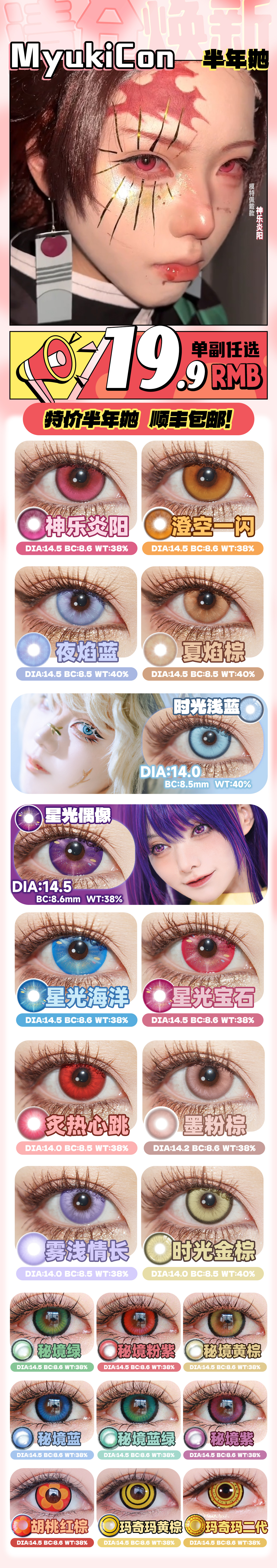 【亏本价】MyukiCon雪物语 半年抛 特价爆款 时光/秘境/心动选手/星光系列 澄空一闪/神乐炎阳/夜焰蓝/时光金棕/炙热心跳/雾浅情长/秘境绿/玛奇玛 COS显色美瞳 排球少年/电锯人/百变小樱