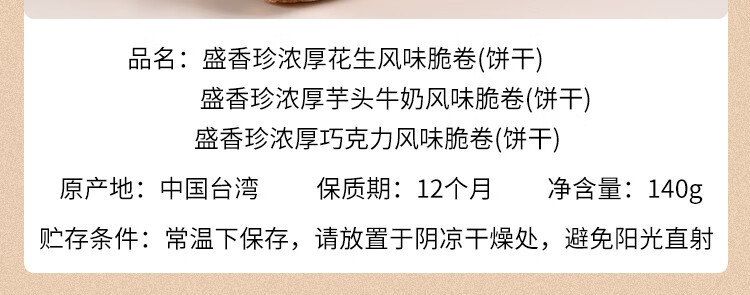 中国台湾盛香珍芋头牛奶味/花生味/可可味脆卷140g 外皮酥脆一口香浓 056317/056318/054336